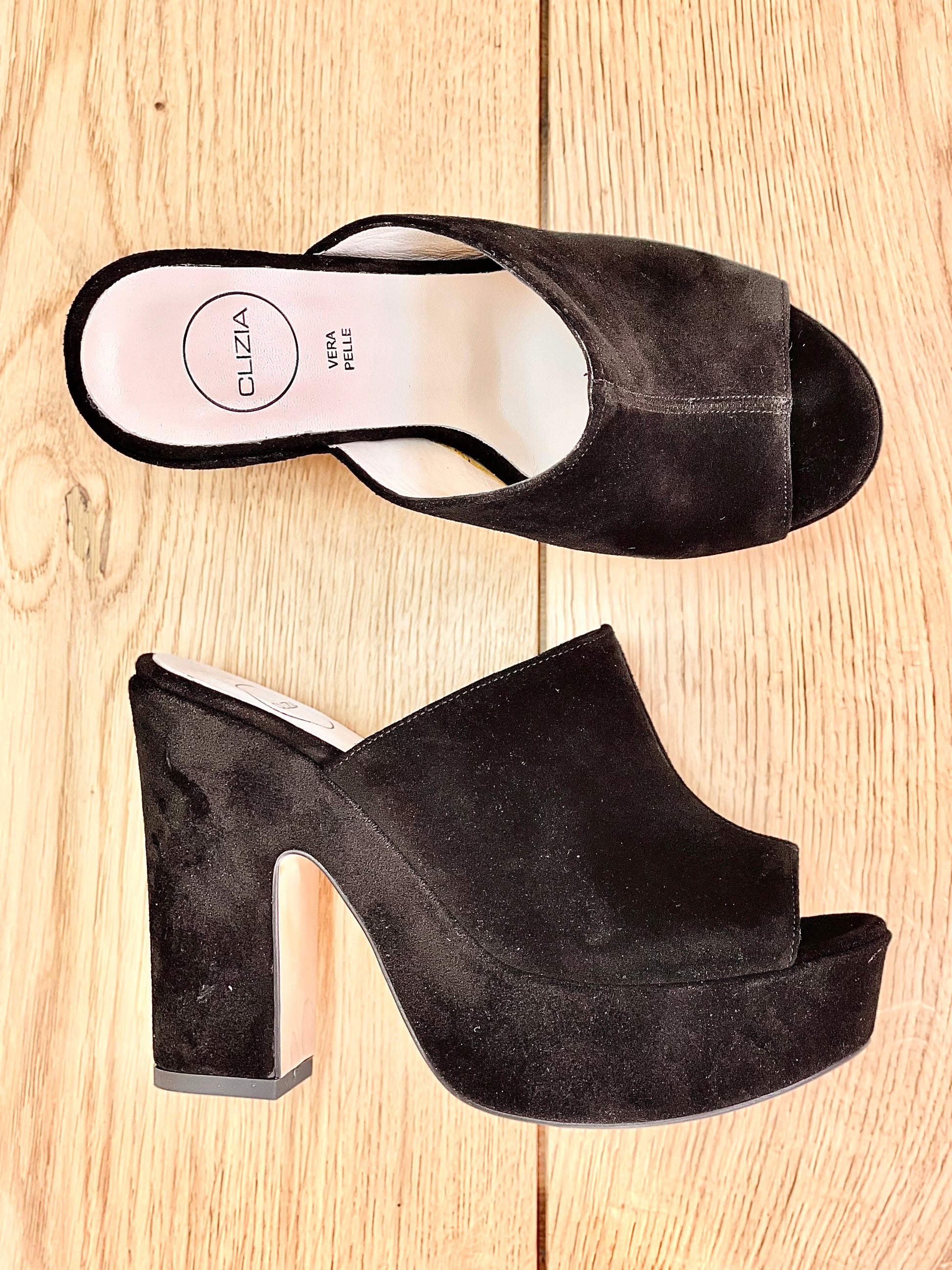 Sandálias de camurça com uma cunha de 11,5 cm de altura e uma plataforma de 4 cm.