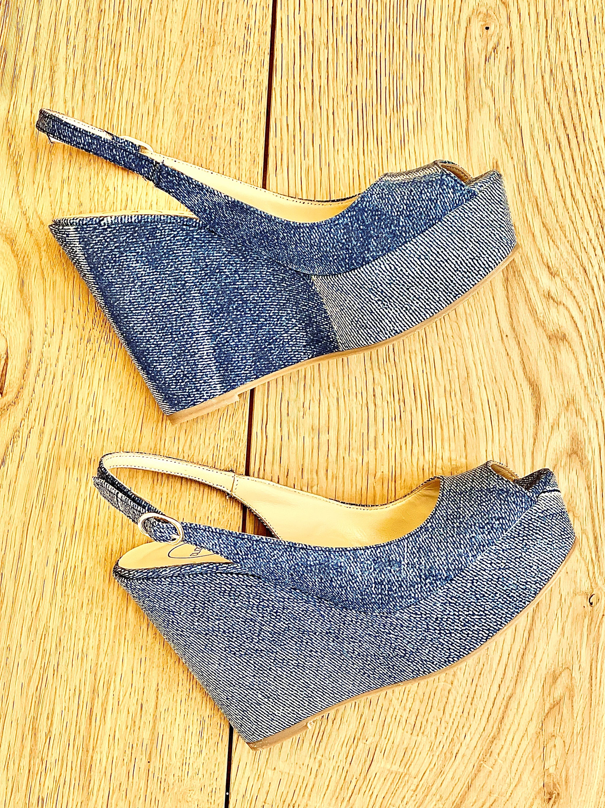 Sapatos de salto alto com biqueira aberta em ganga azul numa cunha alta.