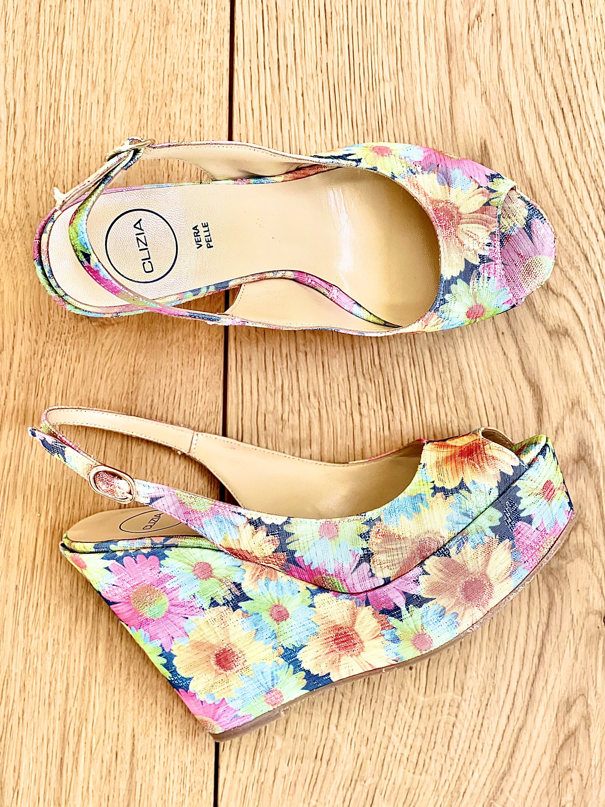 Sapatilhas slingback florais multicoloridas com uma cunha alta.