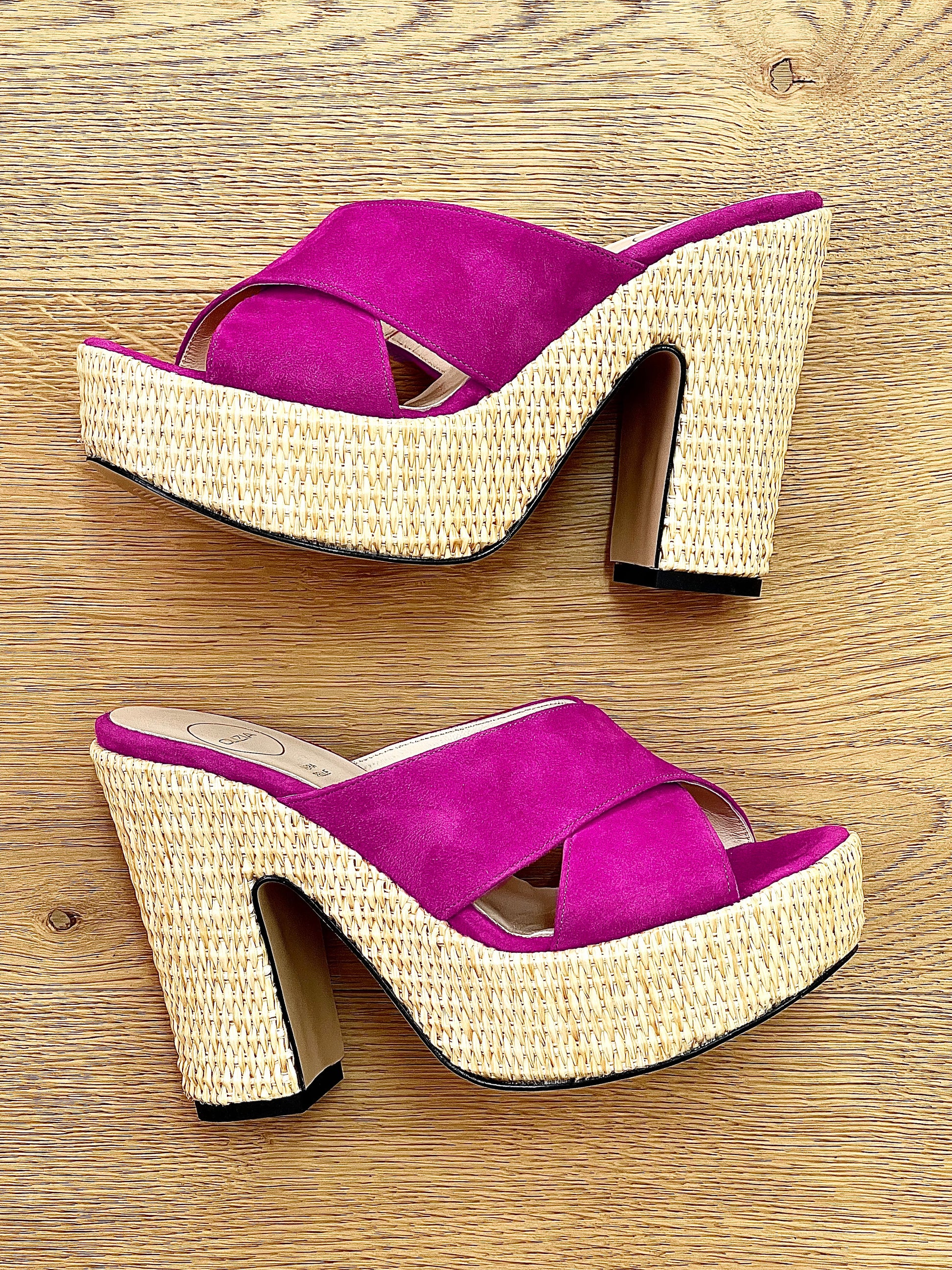 Sandálias altas cruzadas com cunha de ráfia.