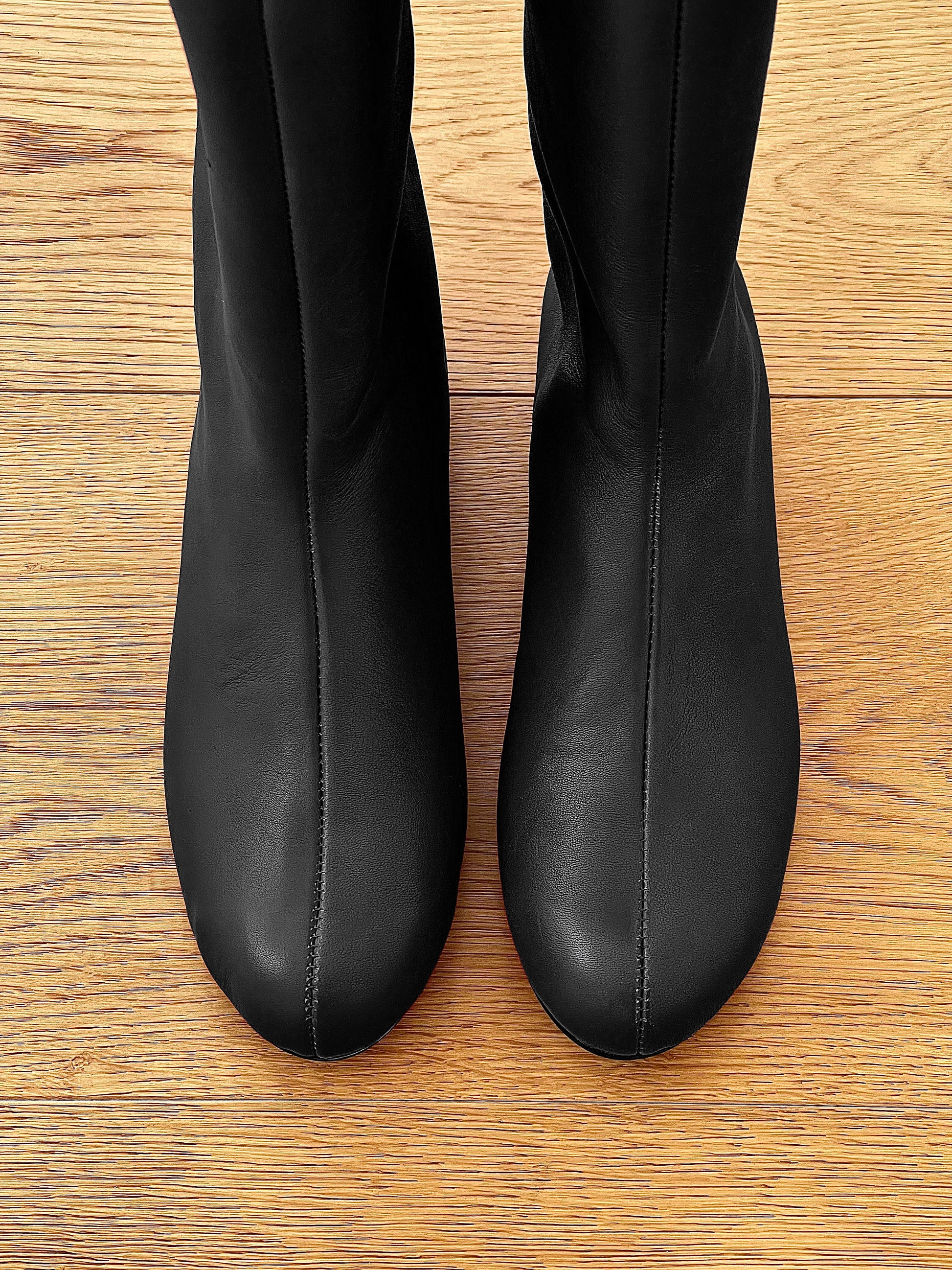 Botas tubulares de cano baixo e redondo.
