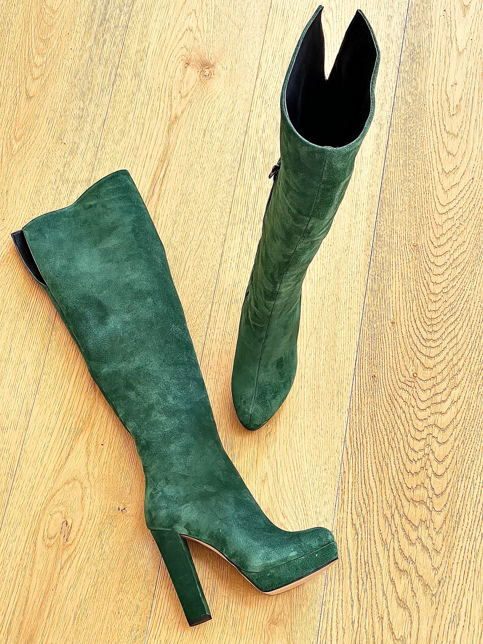 Botas de cano alto acima do joelho com biqueira redonda em camurça, salto largo e plataforma.