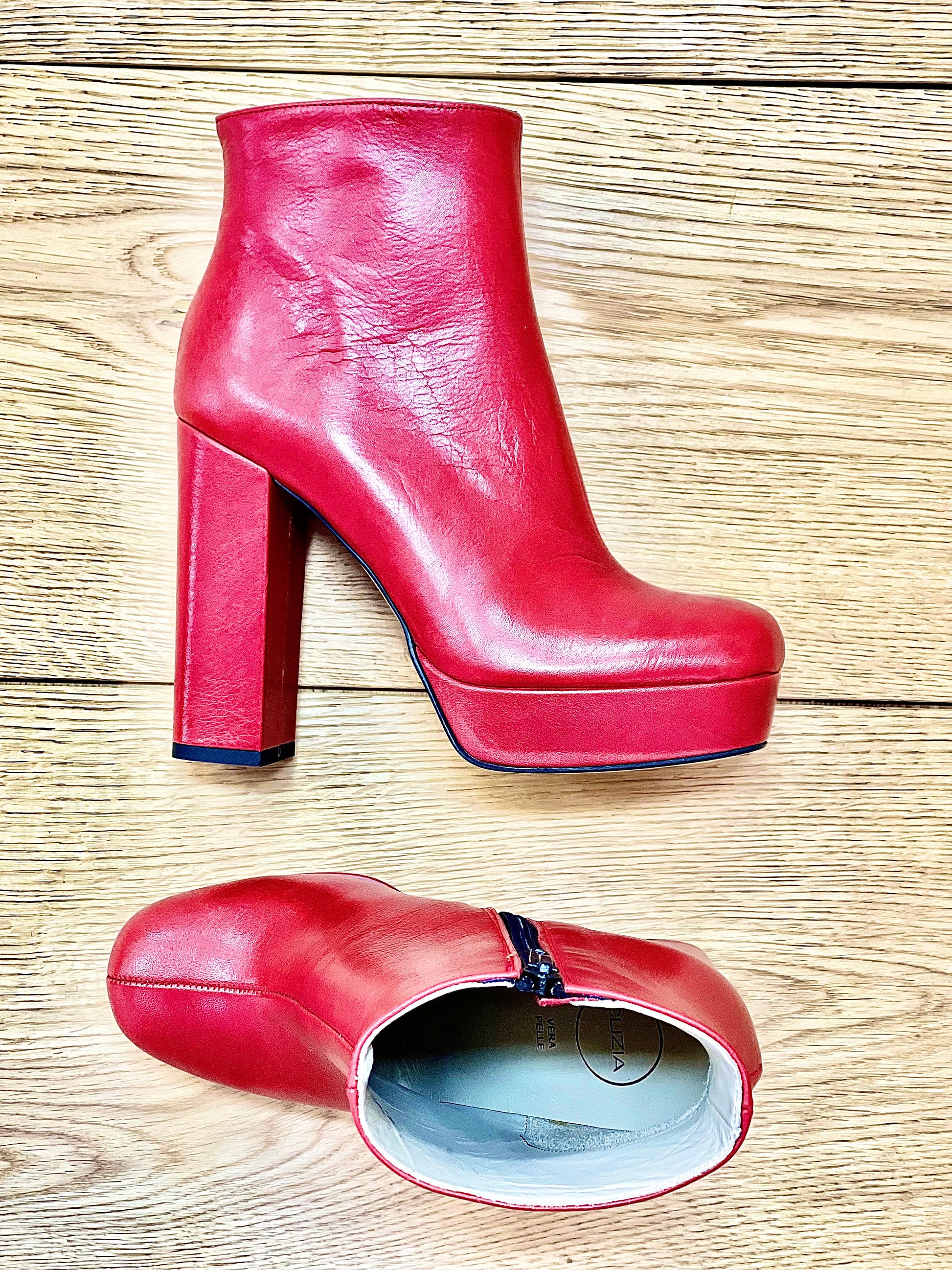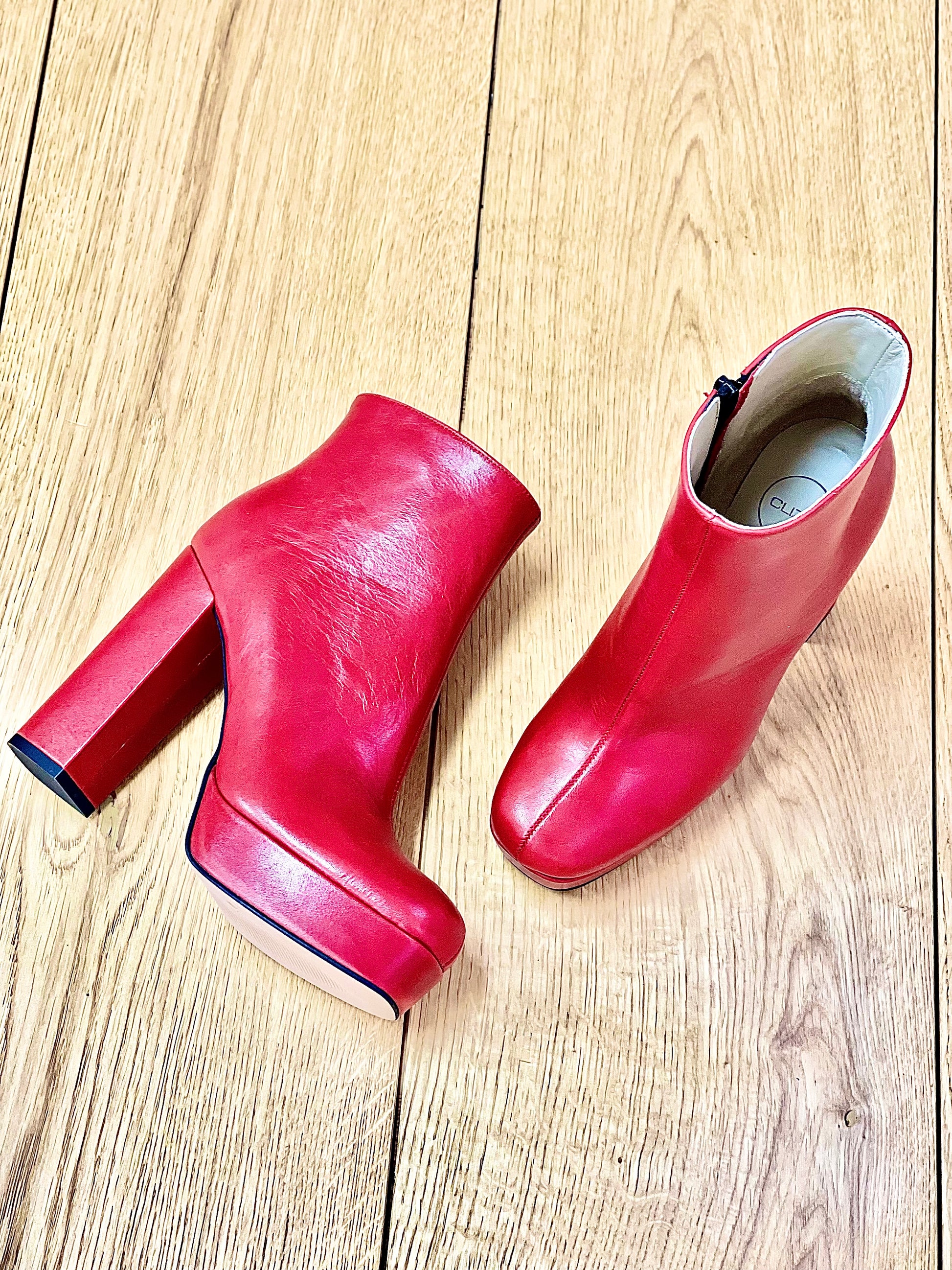 Botins de couro com biqueira semi-quadrada, salto de 12 cm e plataforma de 3 cm.