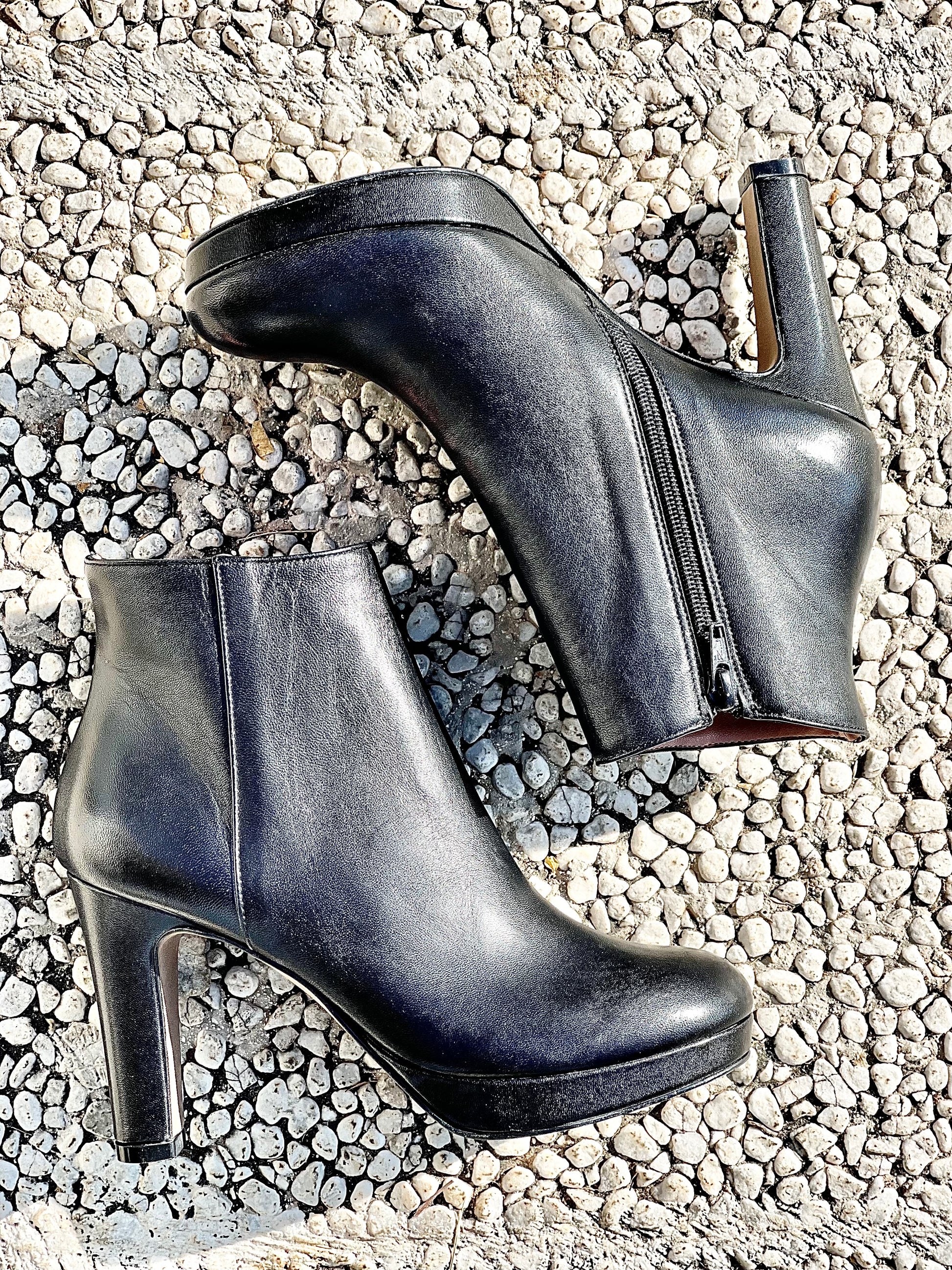 Botins em pele com salto de 9 cm e plataforma de 1 cm com fecho de correr interior.