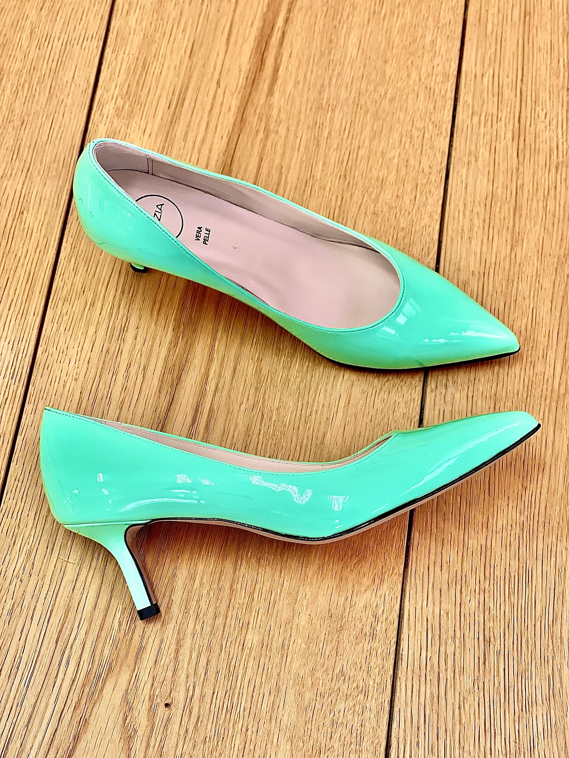 Bomba de bico fino em pele envernizada com salto de 6 cm.