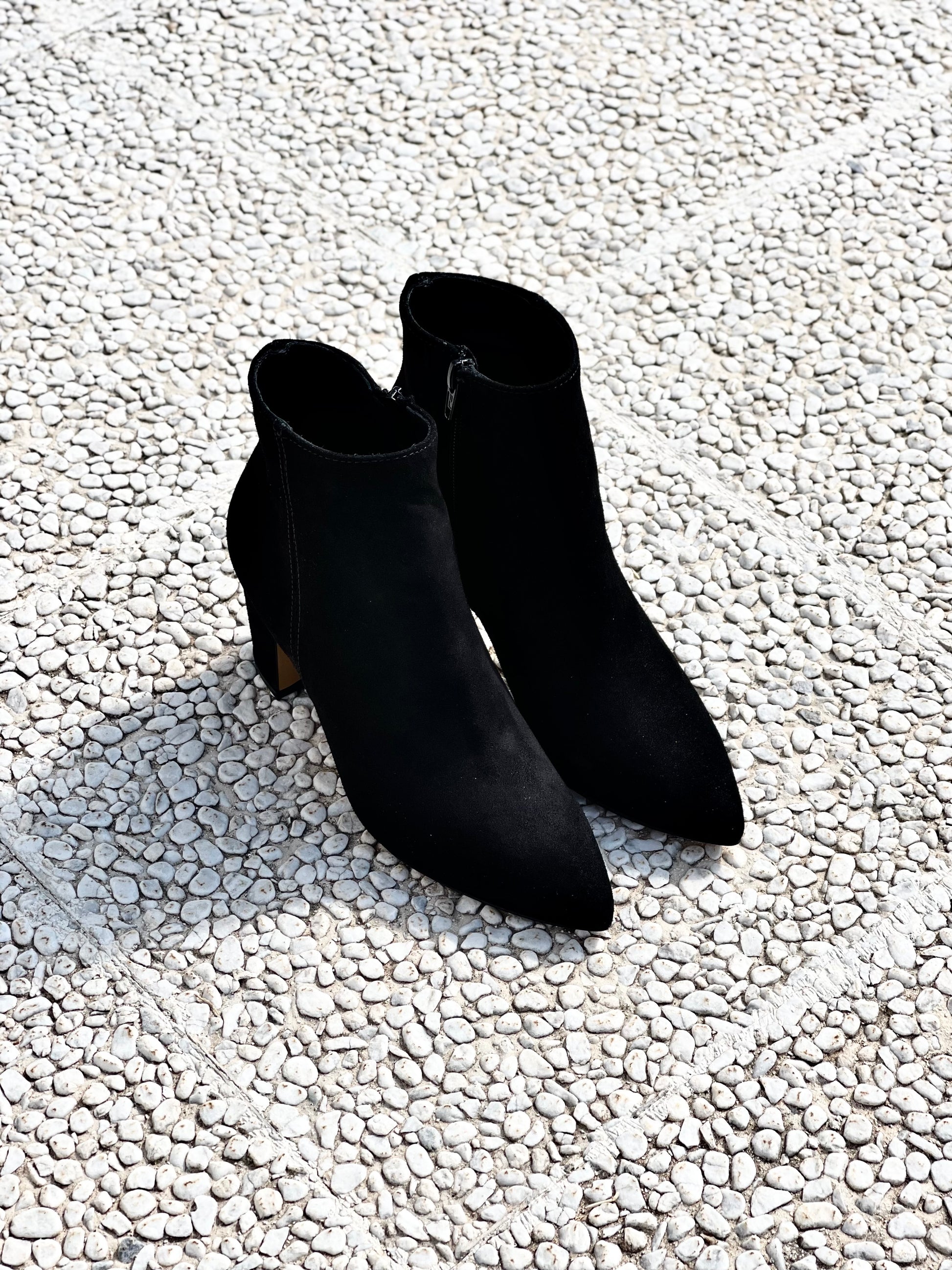 Bota de camurça pontiaguda com salto largo de 75 mm.