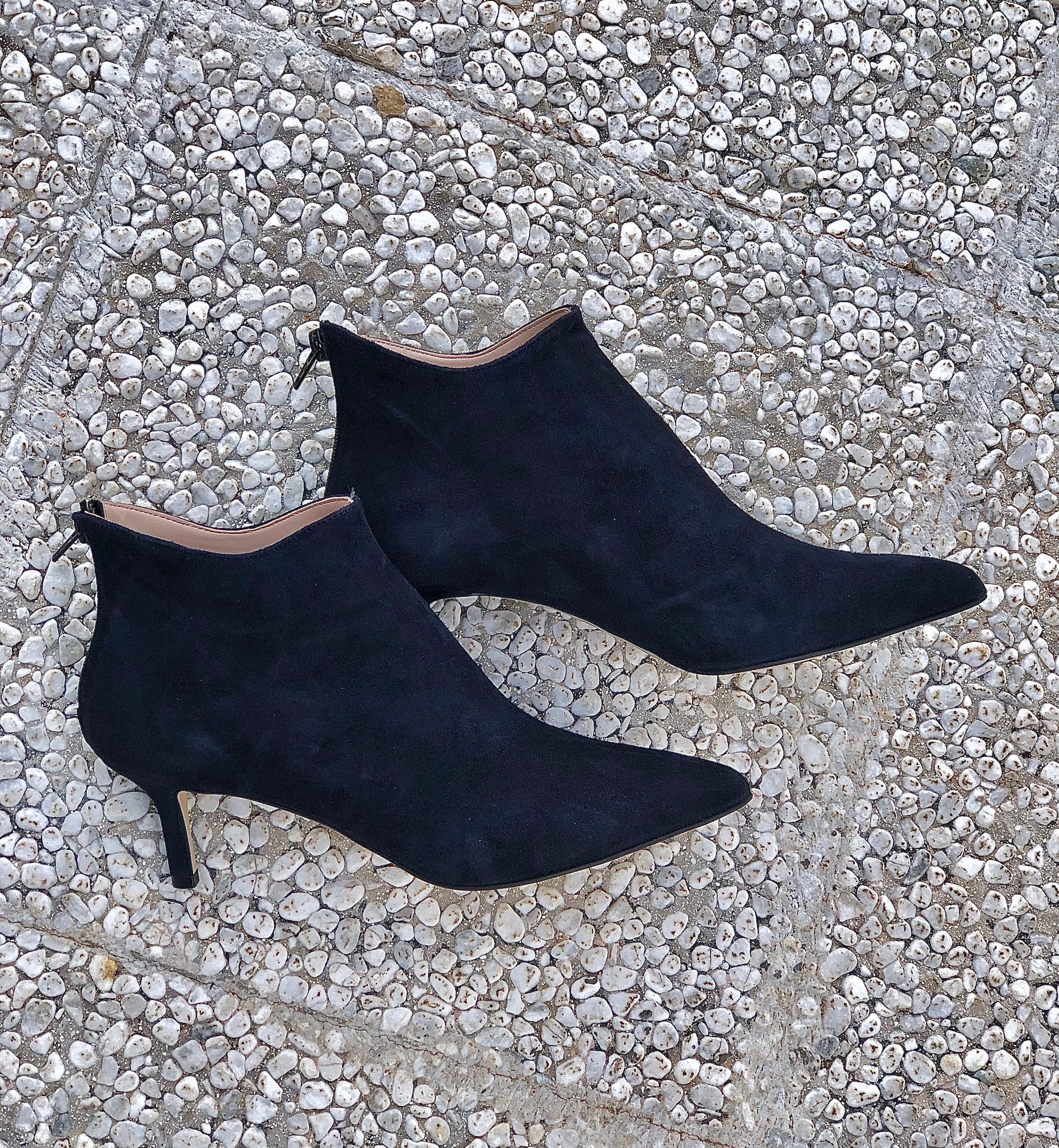 BOTA DE CAMURÇA PONTIAGUDA COM 6 CM DE SALTO. COM FECHO DE CORRER ATRÁS.