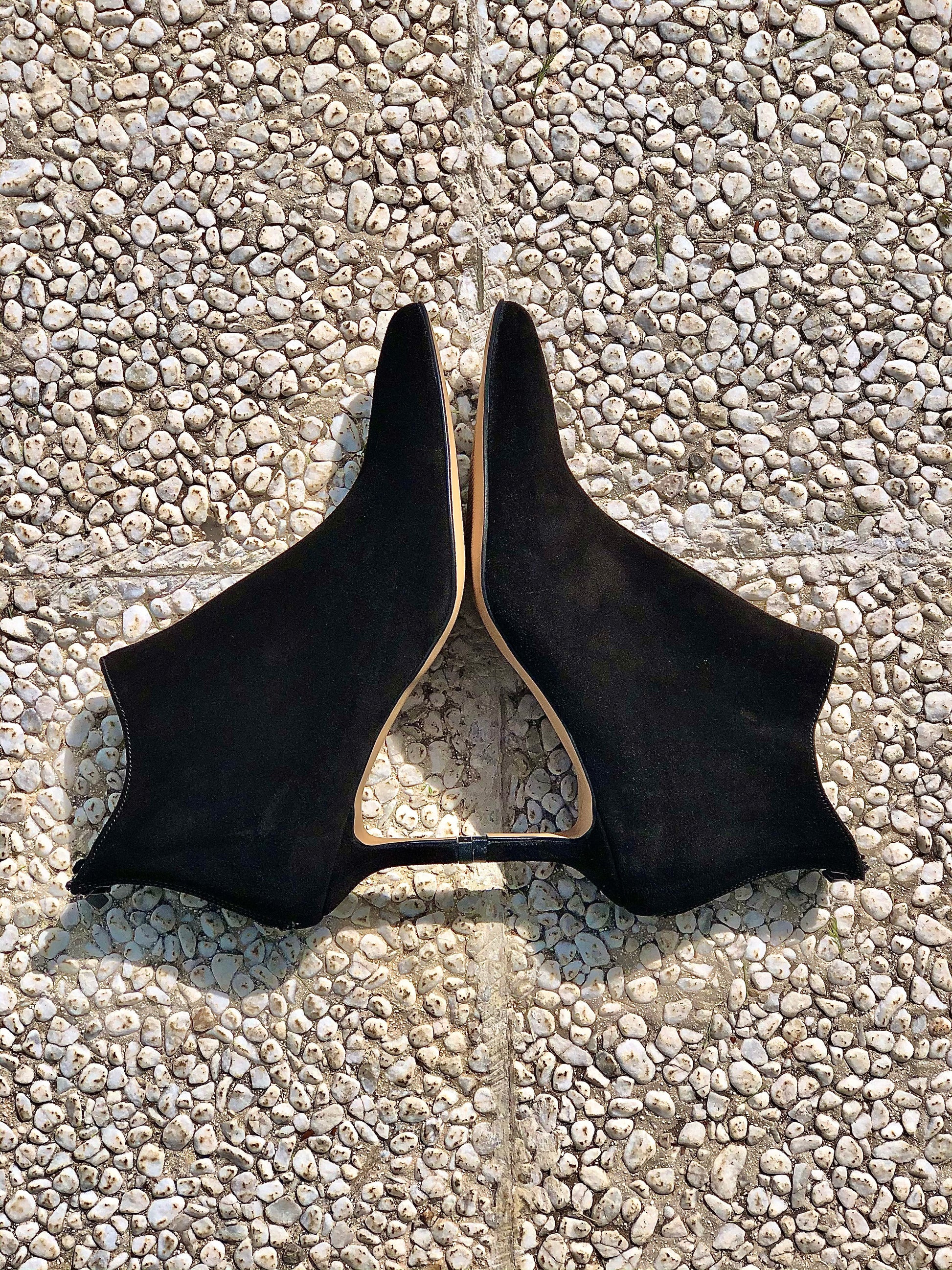 BOTA DE CAMURÇA PONTIAGUDA COM 6 CM DE SALTO. COM FECHO DE CORRER ATRÁS.