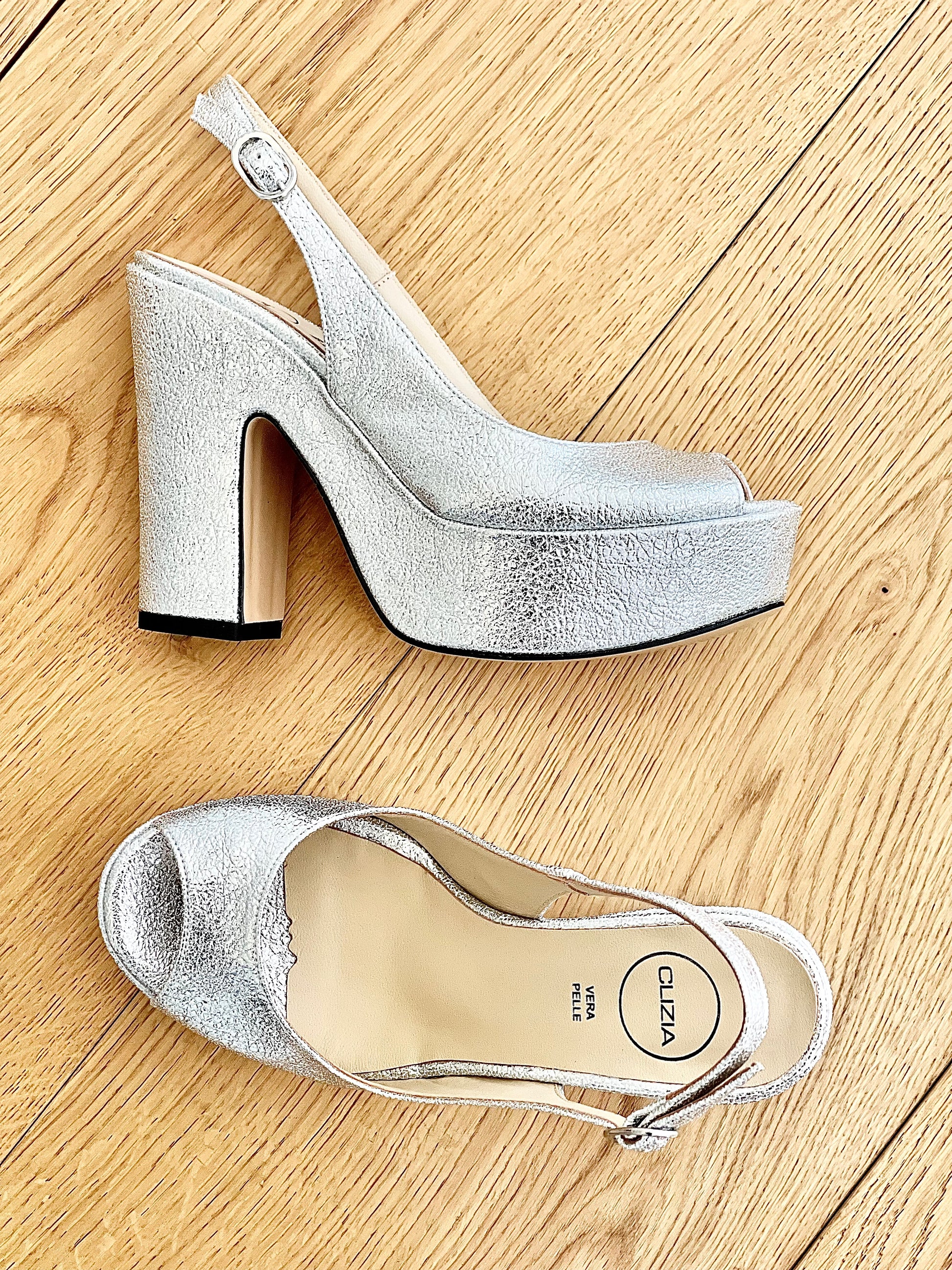 Peep toe slingbacks laminados com uma cunha de 11,5 cm de altura e uma plataforma de 4 cm.