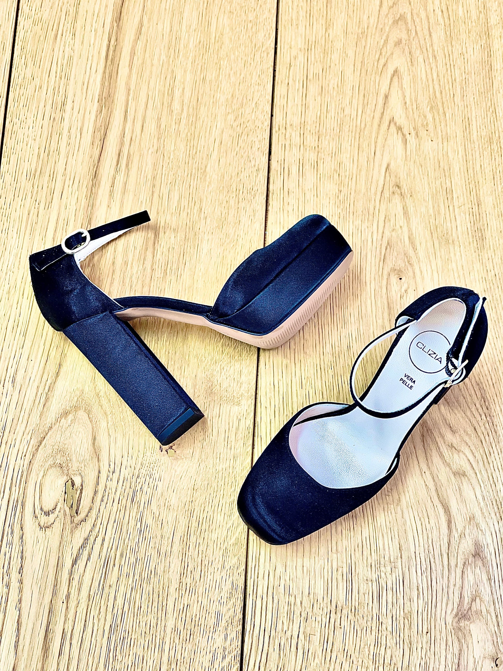 Biqueira semi-quadrada em cetim e decote com salto de 12 cm e plataforma de 3 cm.