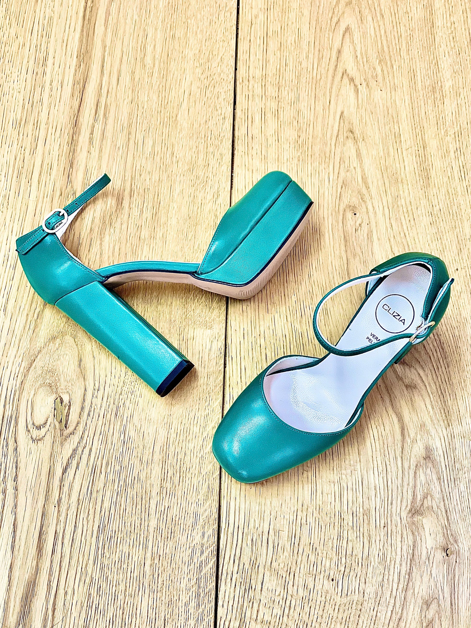 Biqueira semi-quadrada e decote em pele com salto de 12 cm e plataforma de 3 cm.