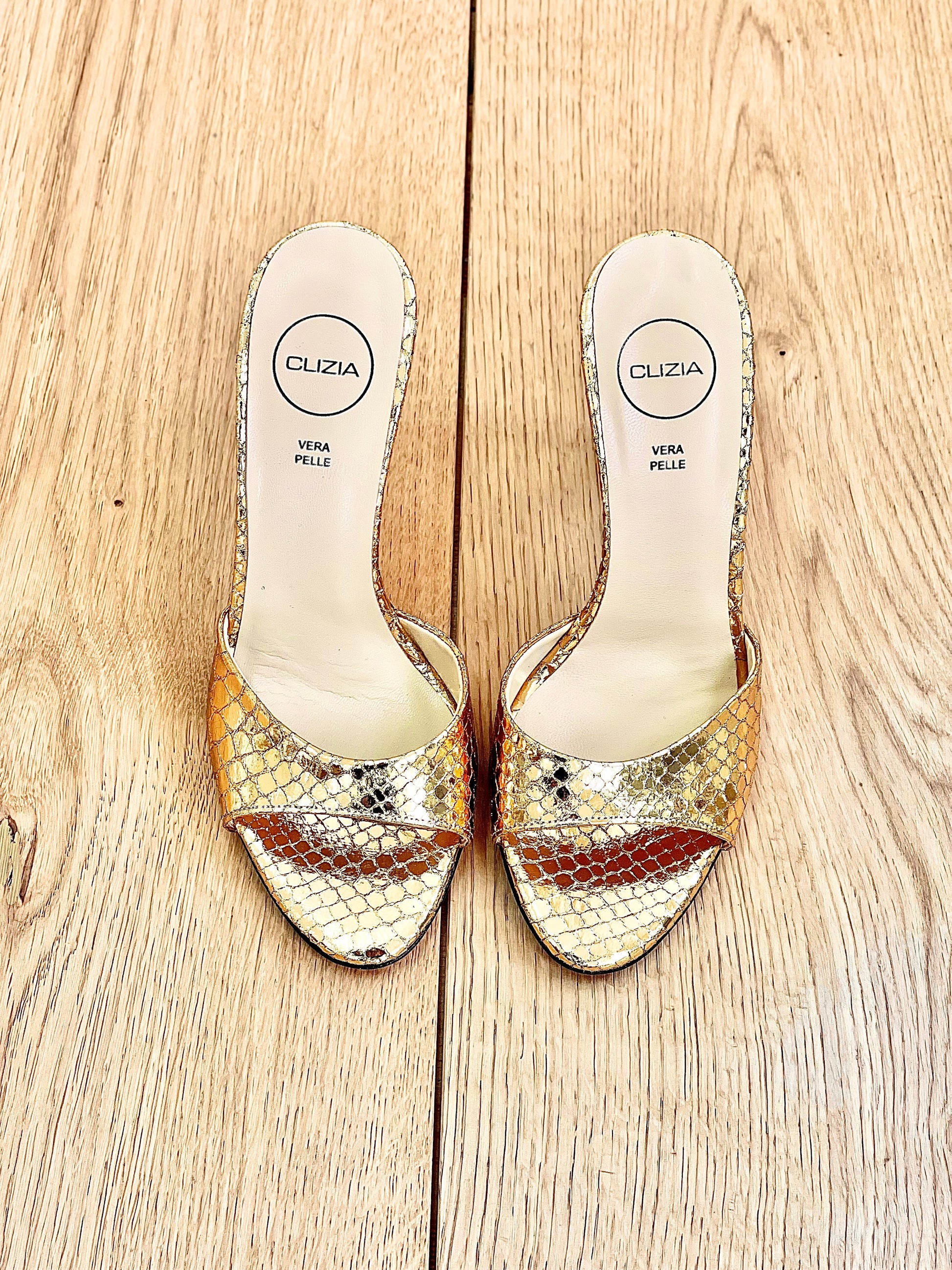 Sandálias mules altas em ouro laminado com 10 cm de salto.