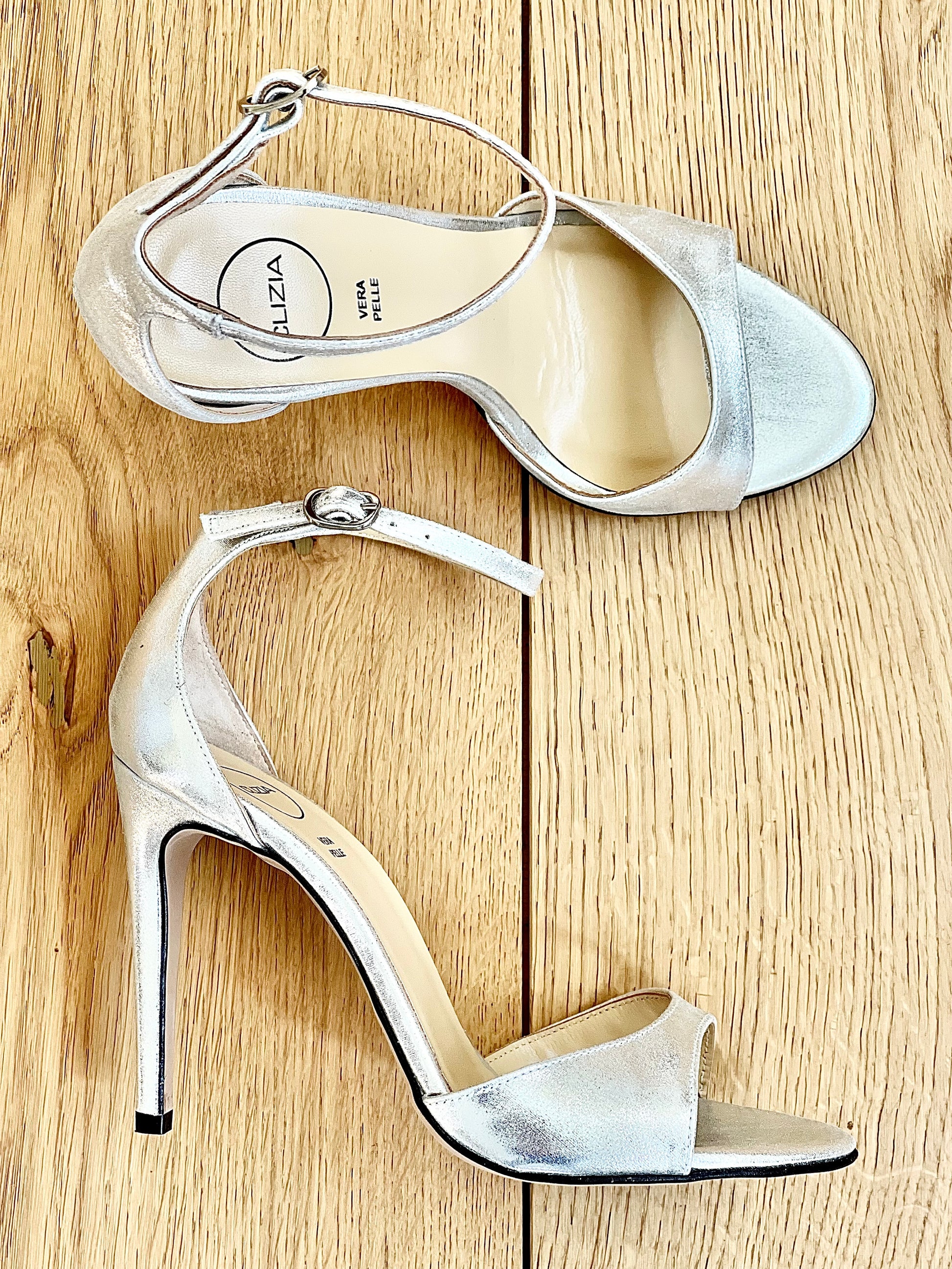 Sandálias de salto alto e de tira em salto laminado com picos de 10 cm.