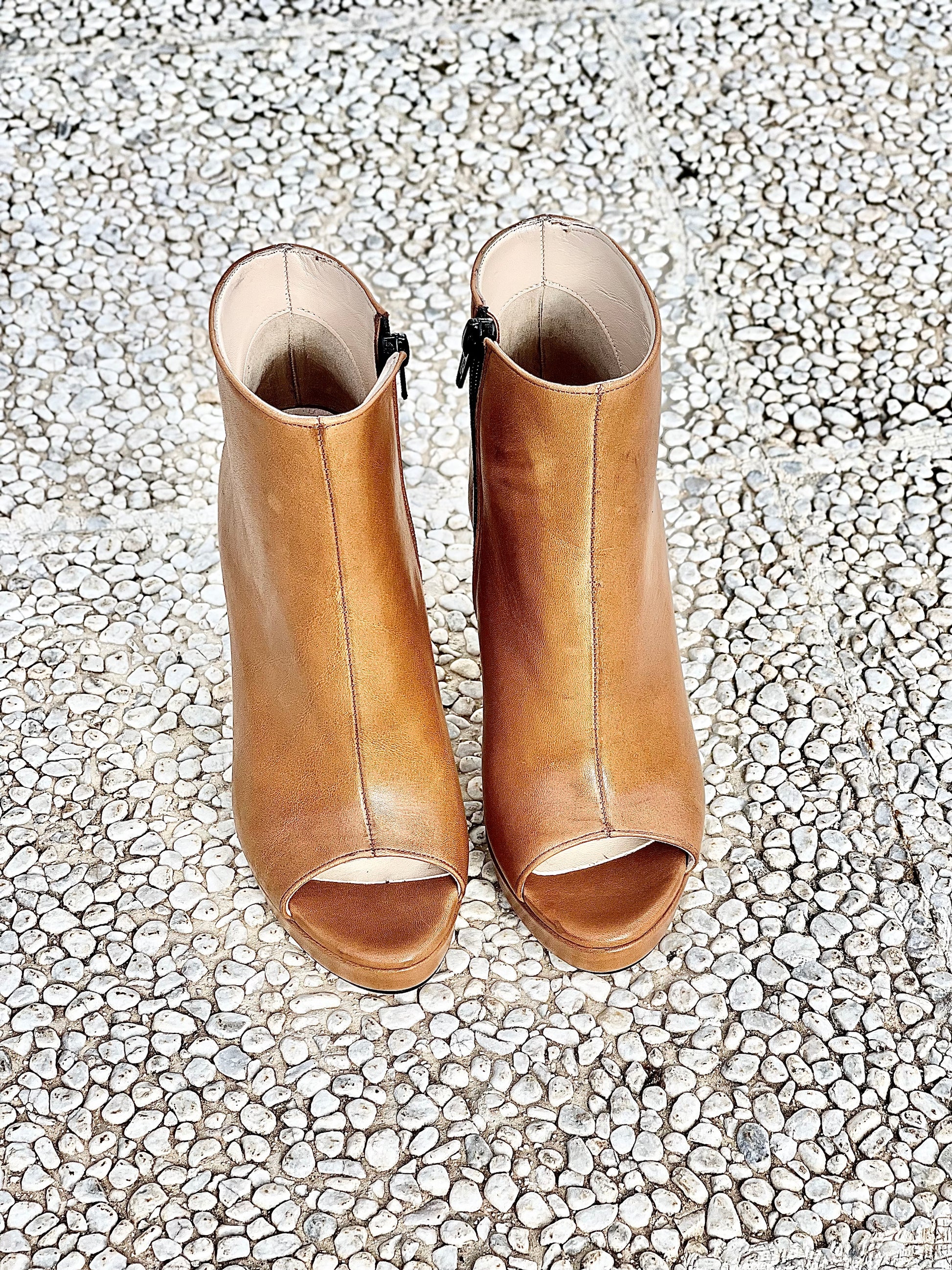 Botins em pele com salto de 12 cm e plataforma de 2 cm.