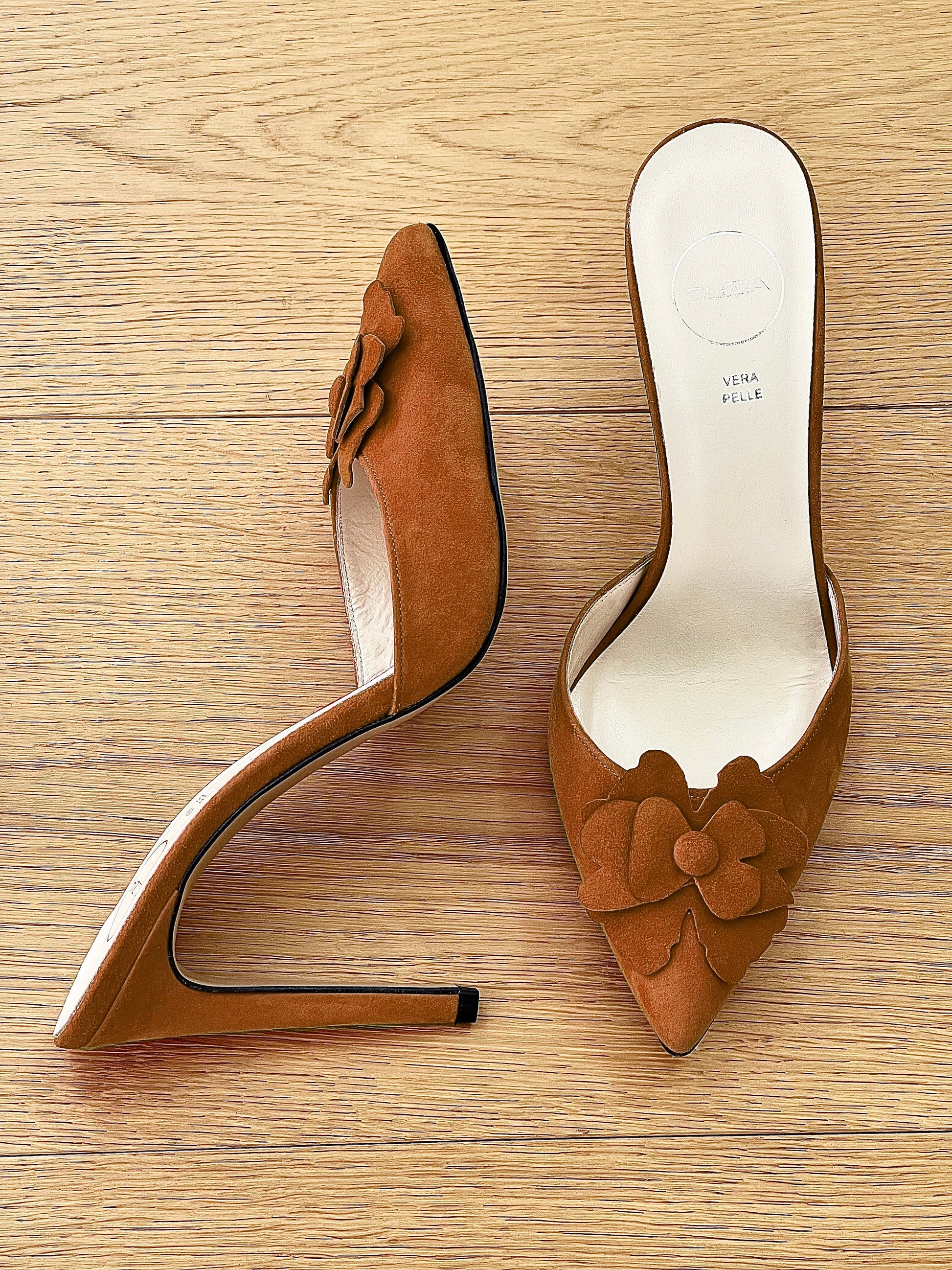 Sapatos sabot de salto alto com biqueira pontiaguda e decote em flor.