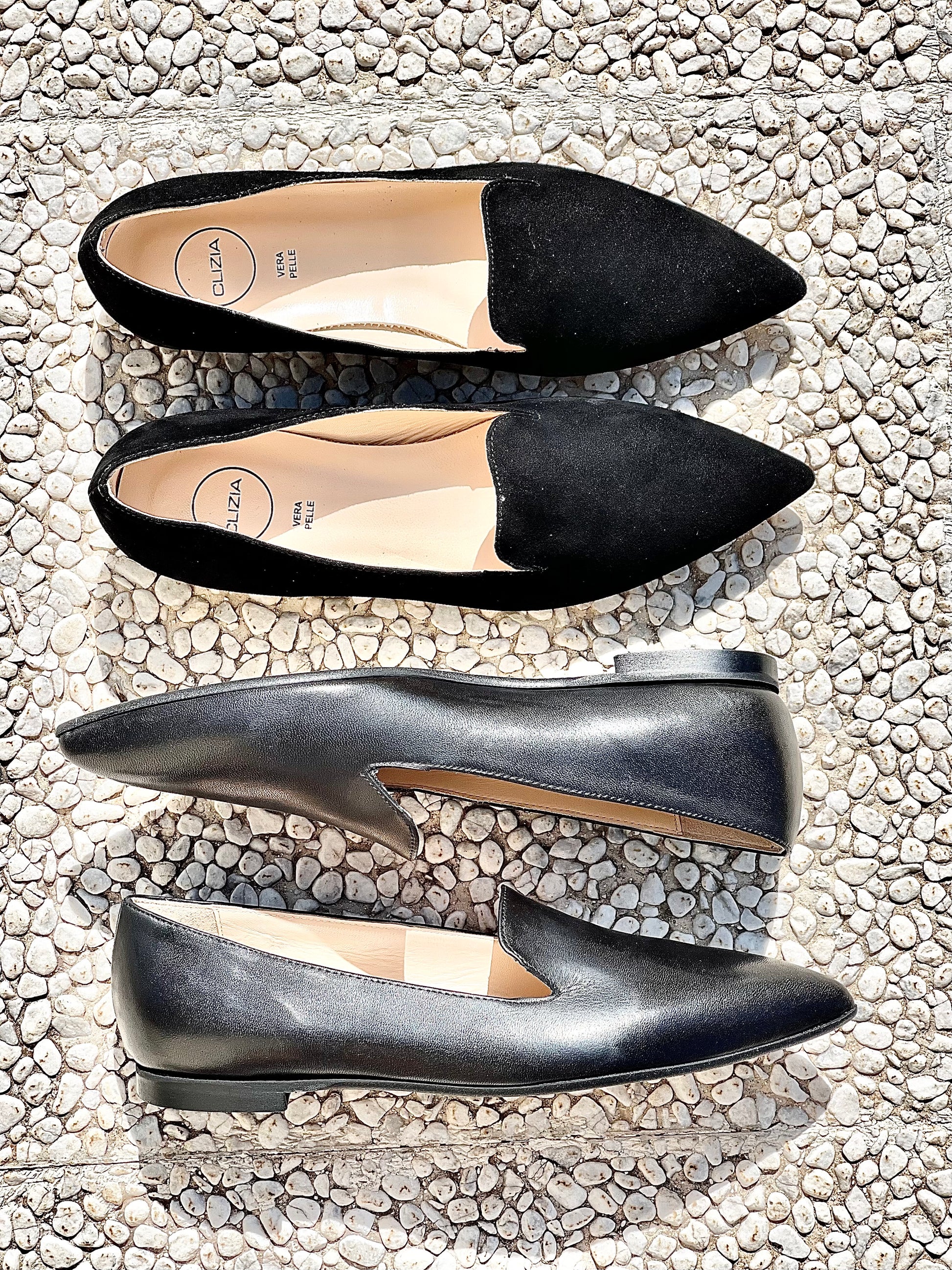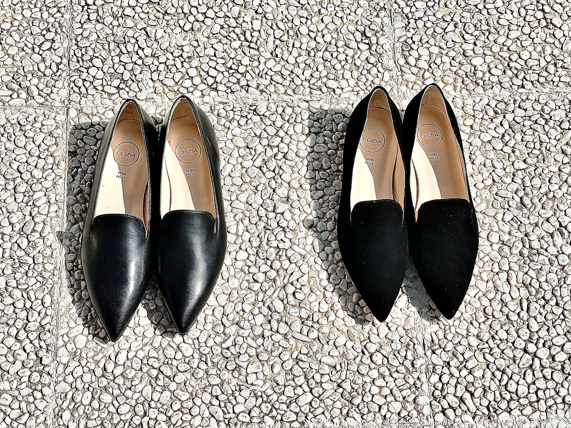 Sapatilhas de ballet estilo slipper com biqueira pontiaguda em pele ou camurça.