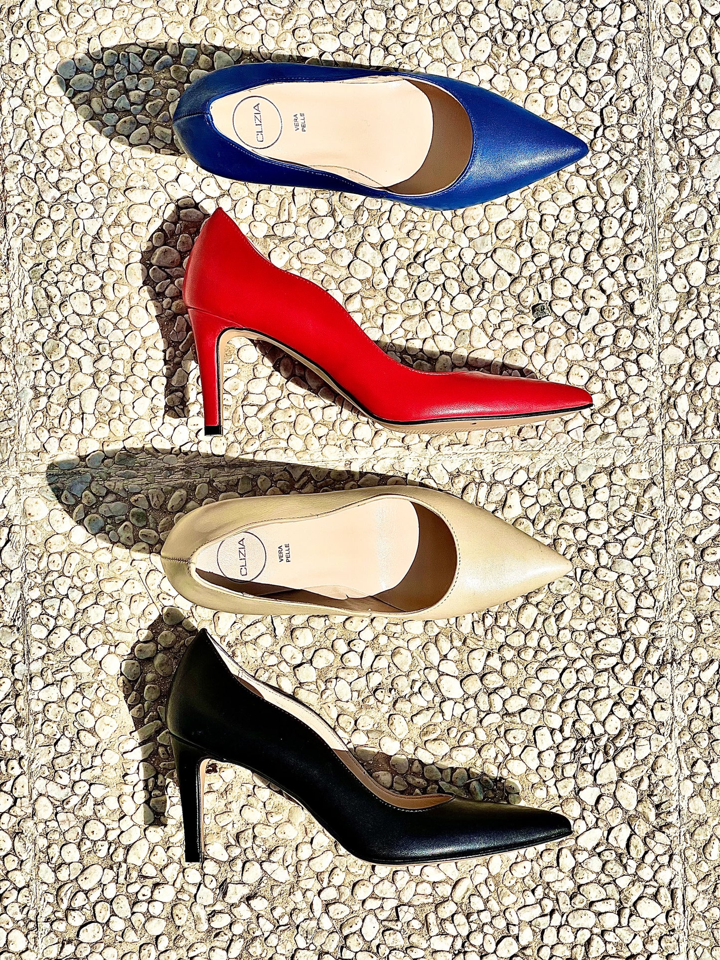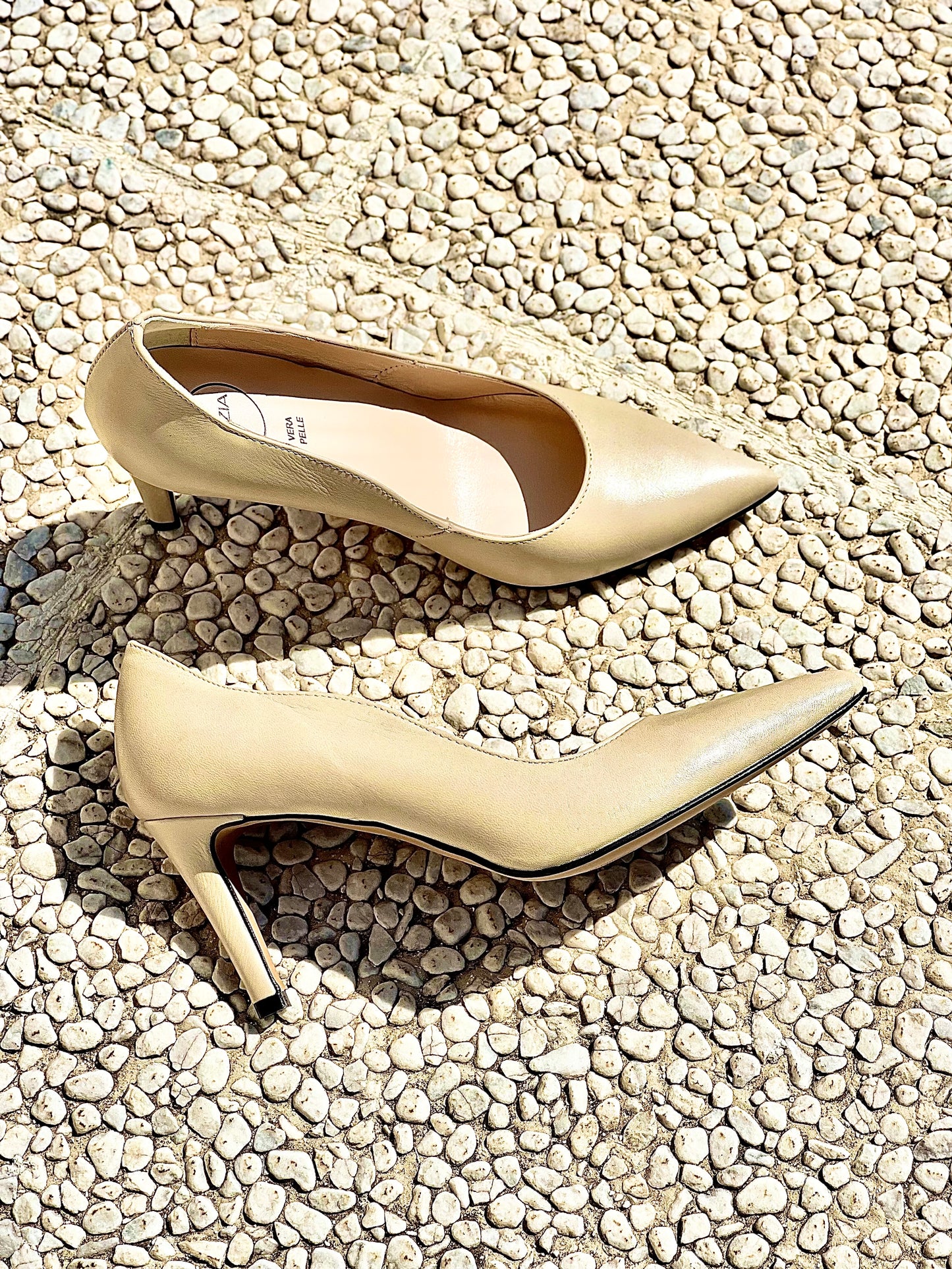 Bomba de dedo do pé pontiagudo em pele com salto de 75 mm.