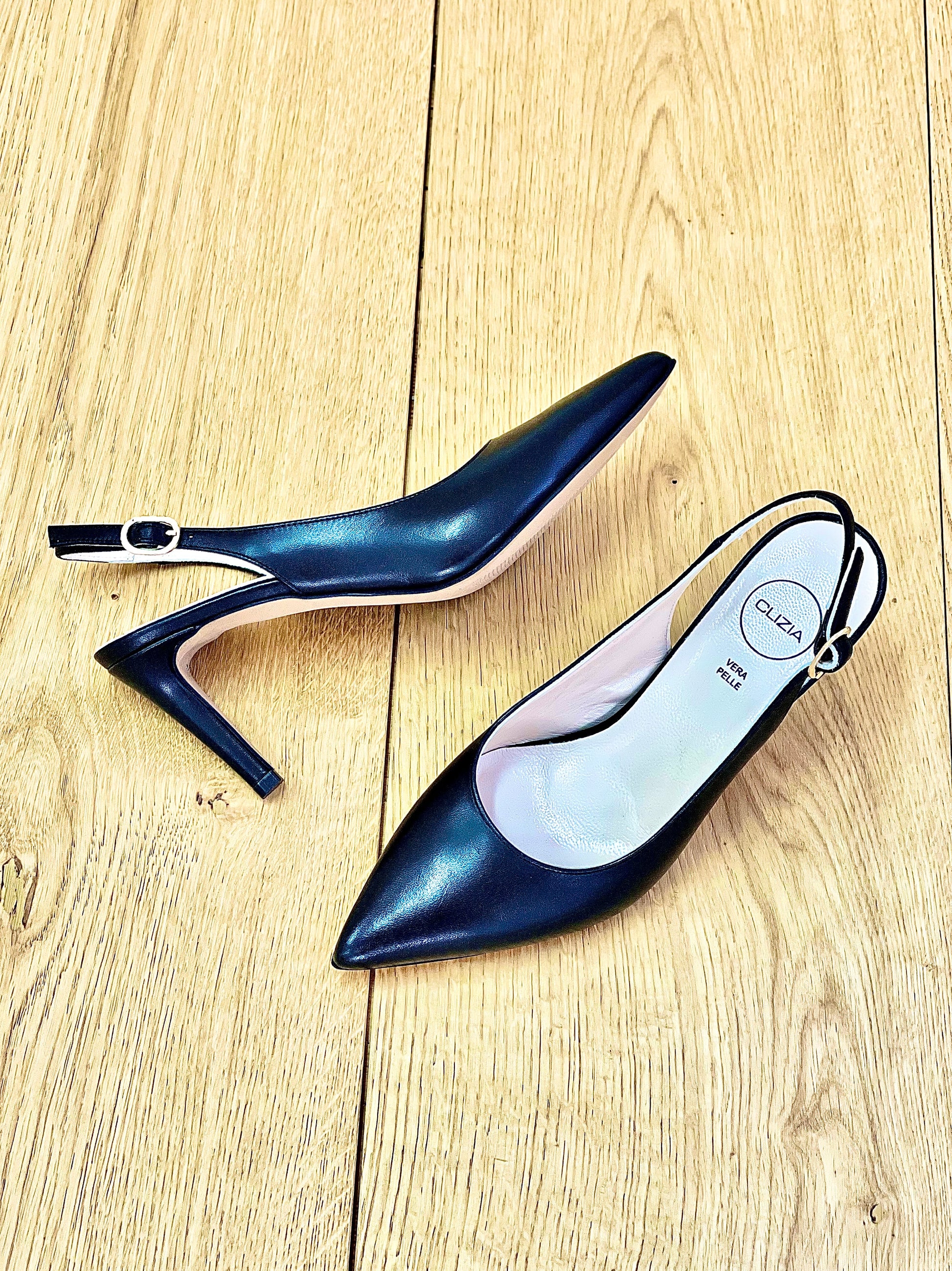 Bomba de slingback pontiaguda com salto de couro de 75 mm.