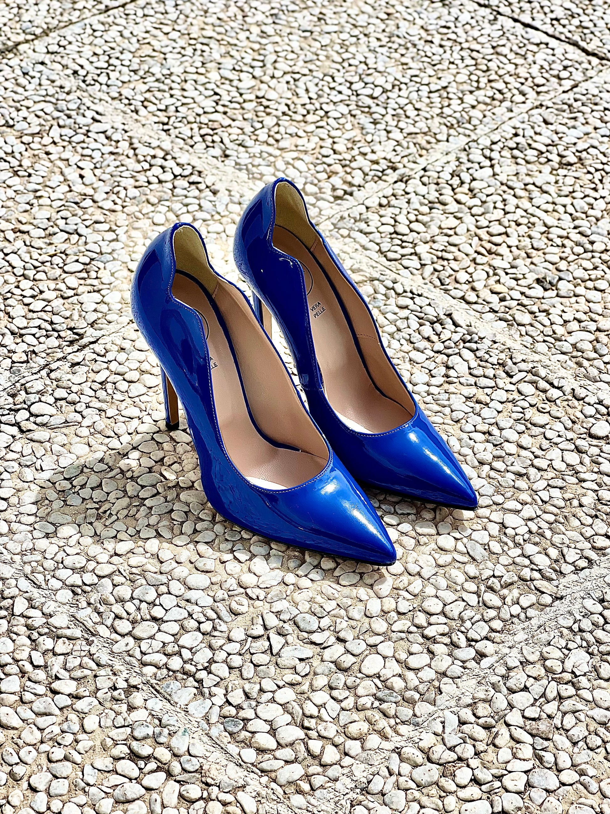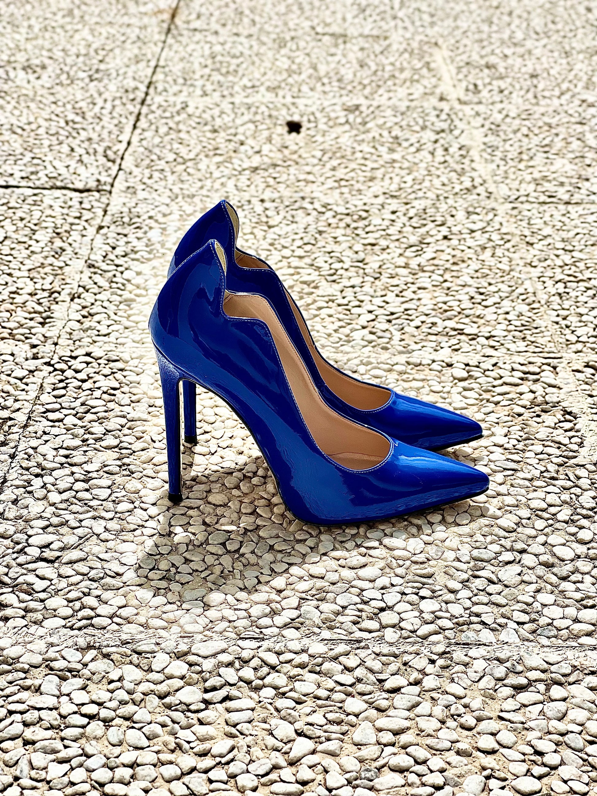 Bomba pontiaguda em pele envernizada com salto agulha.