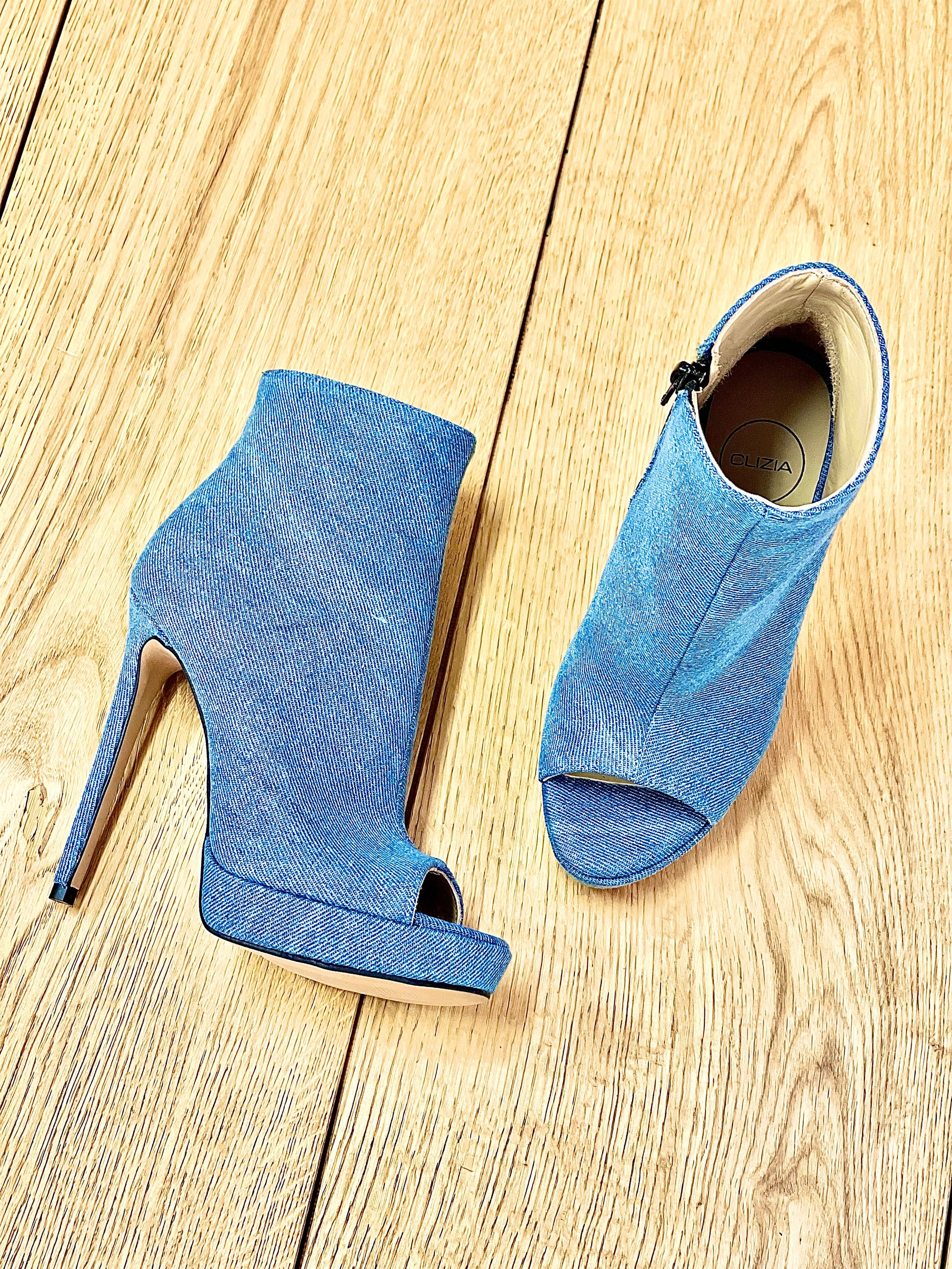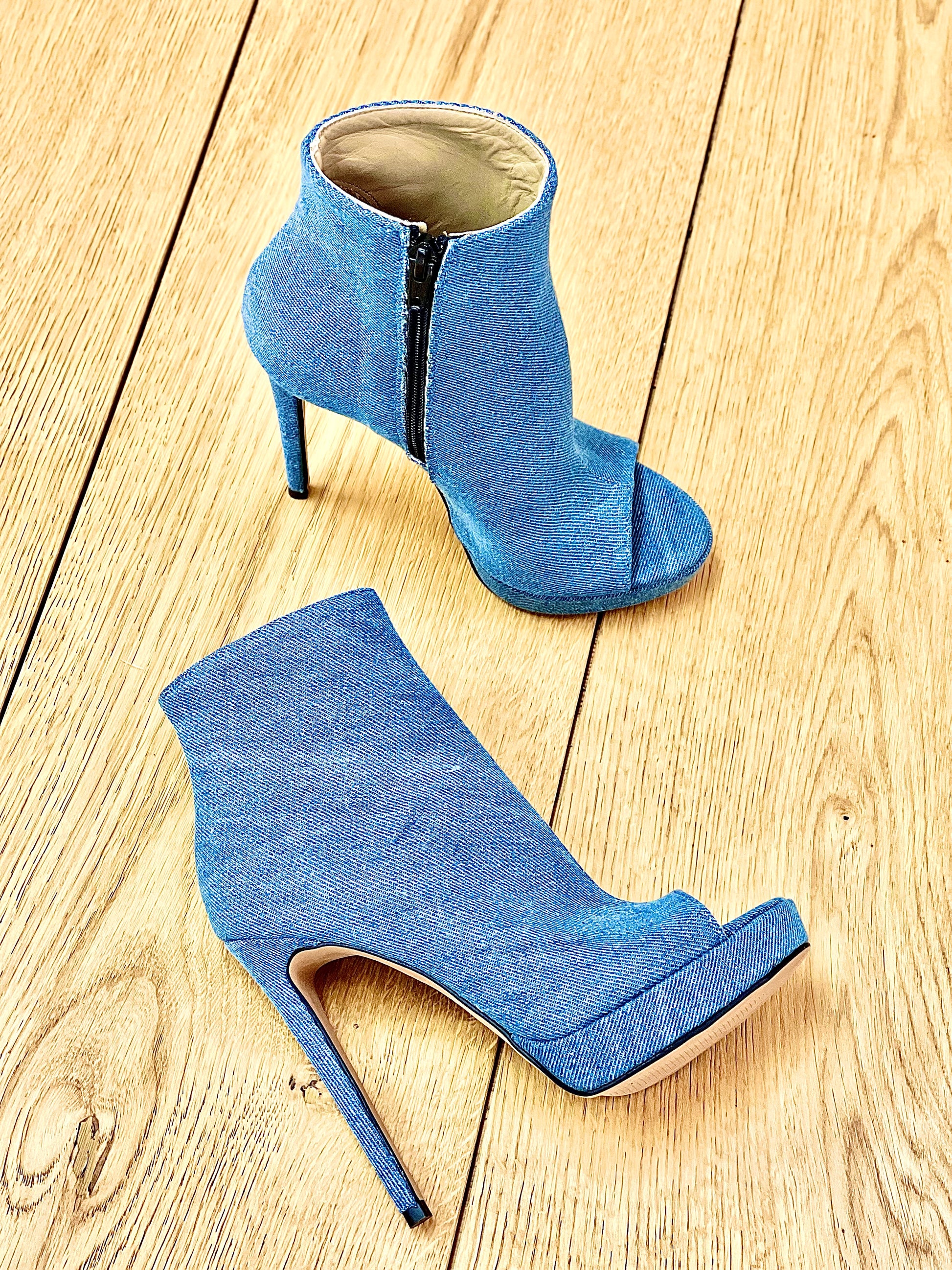 Botins de ganga azul com salto agulha de 12 cm de altura e plataforma de 2 cm.