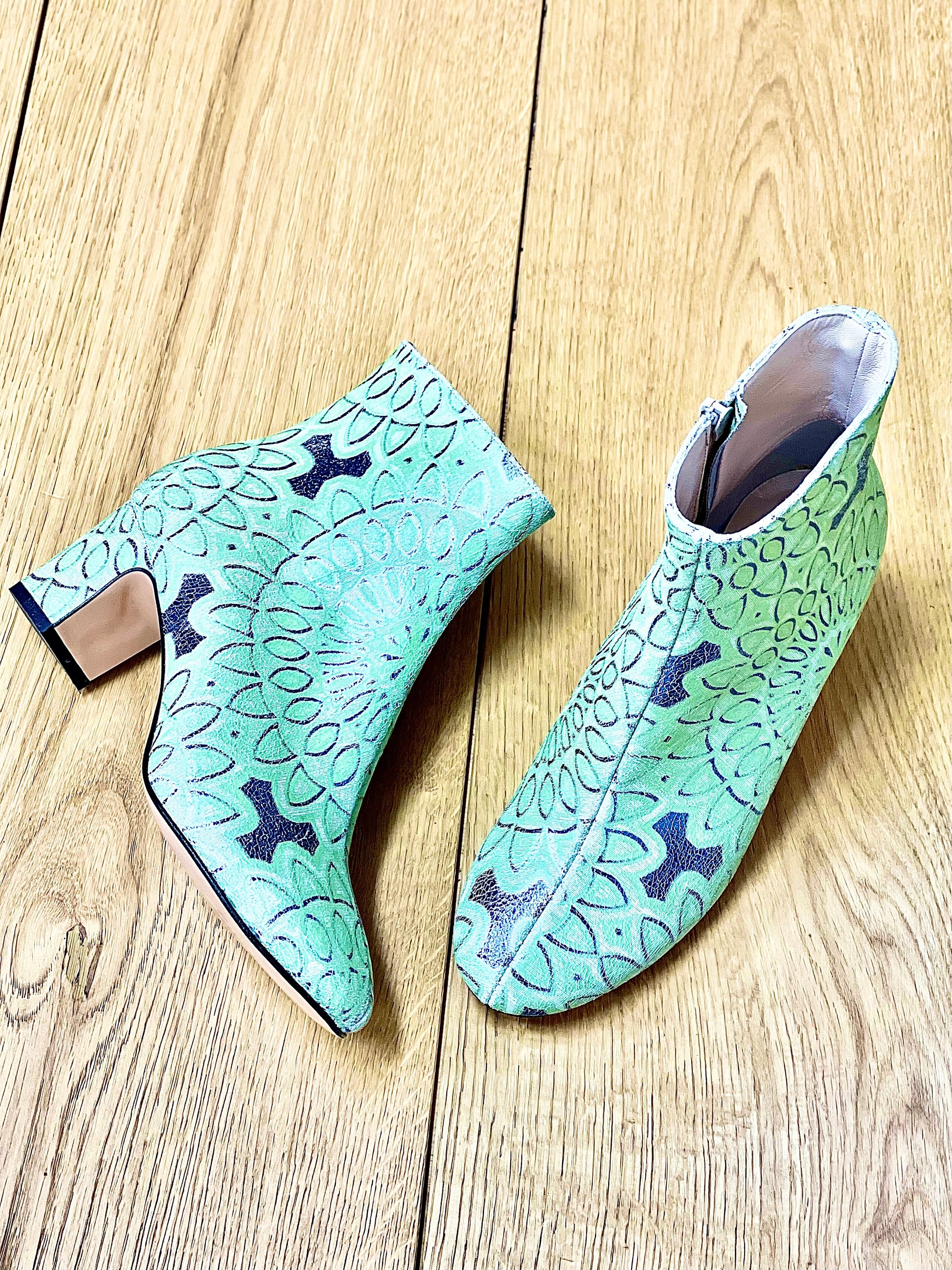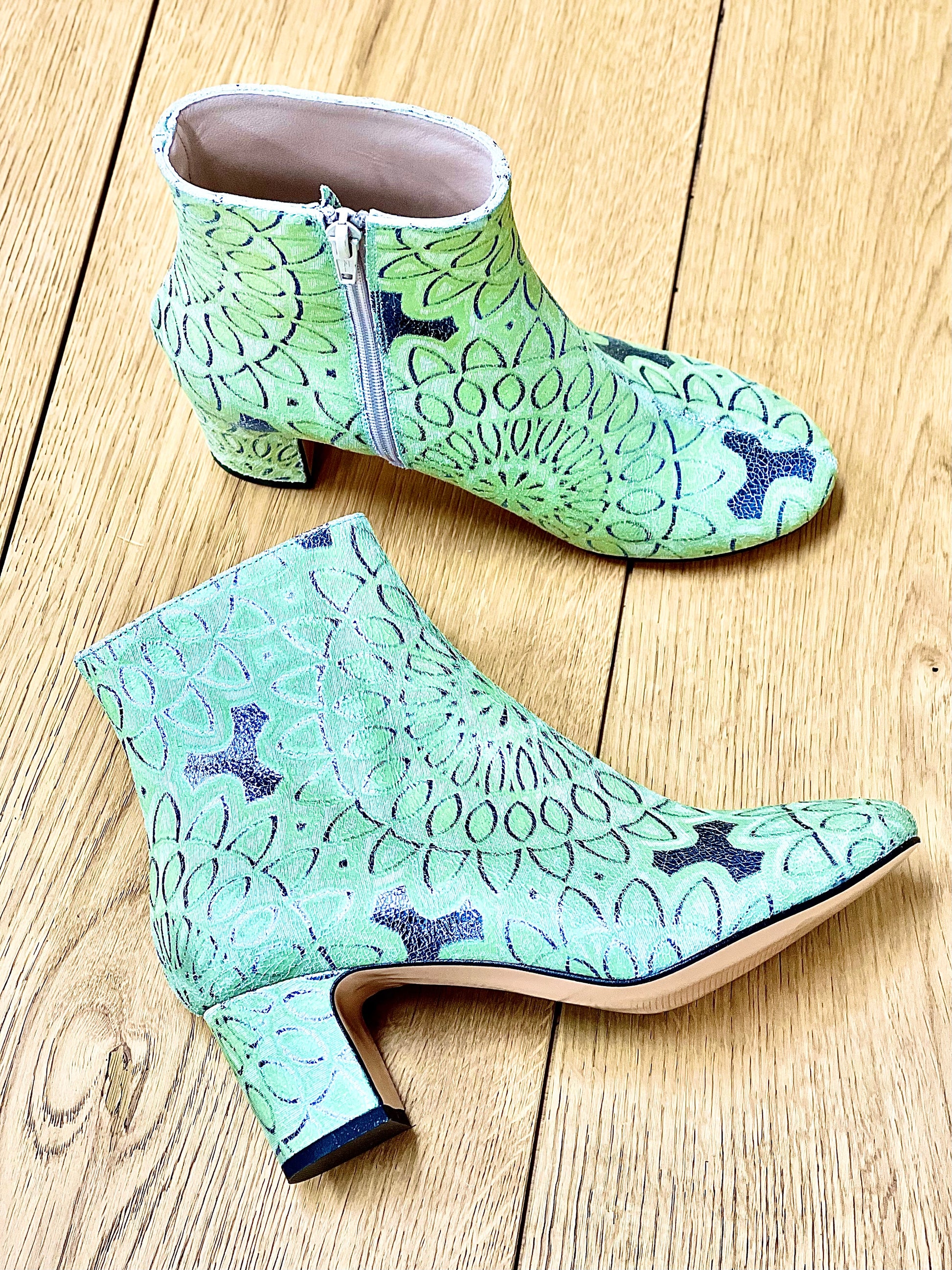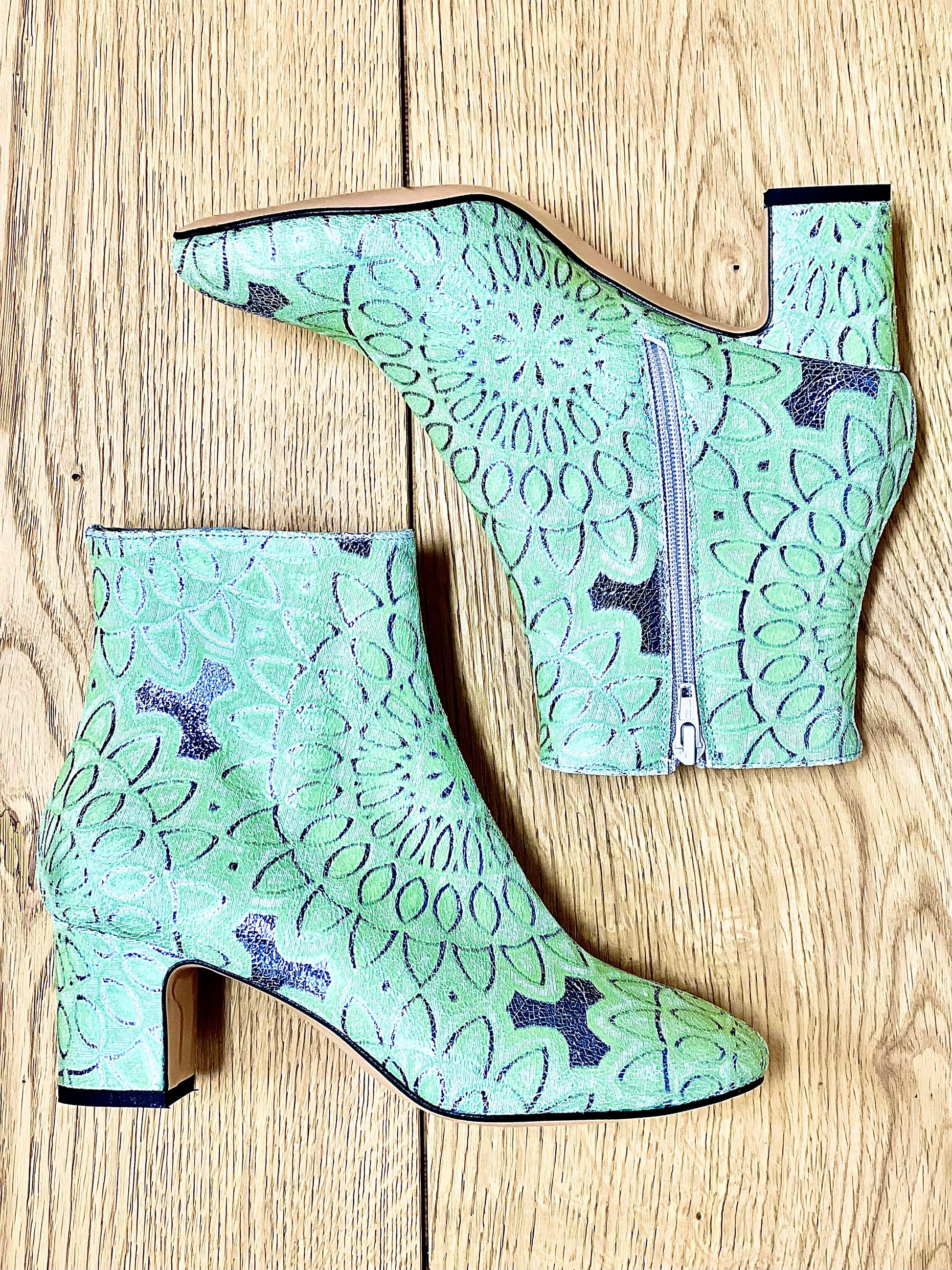 Botins de biqueira redonda em pele craquelada com motivos étnicos e salto largo.