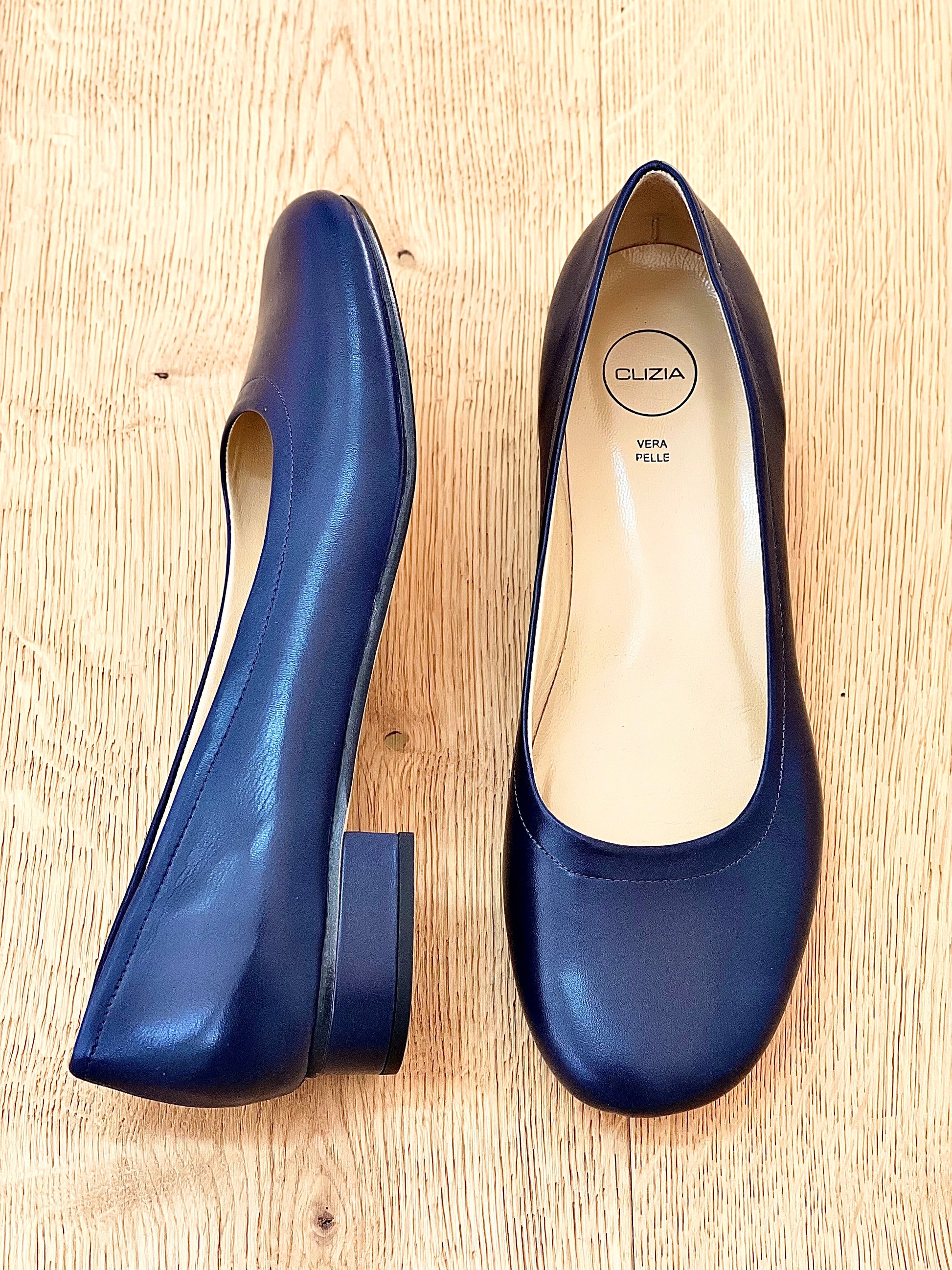 Sapatos baixos de biqueira semi-quadrada em pele com salto de 2 cm.