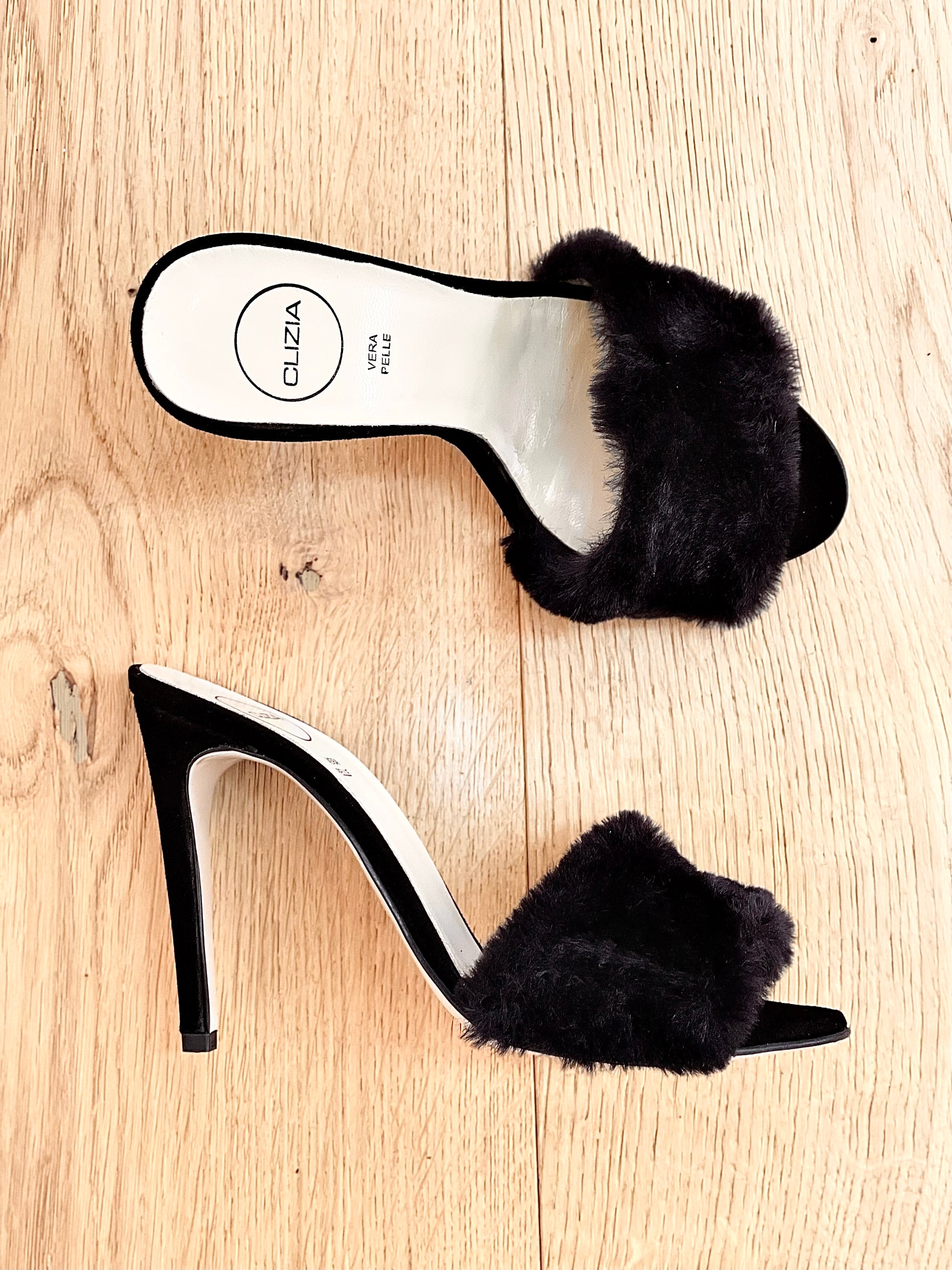 Sandálias altas mules chinelos de camurça com salto de pele.