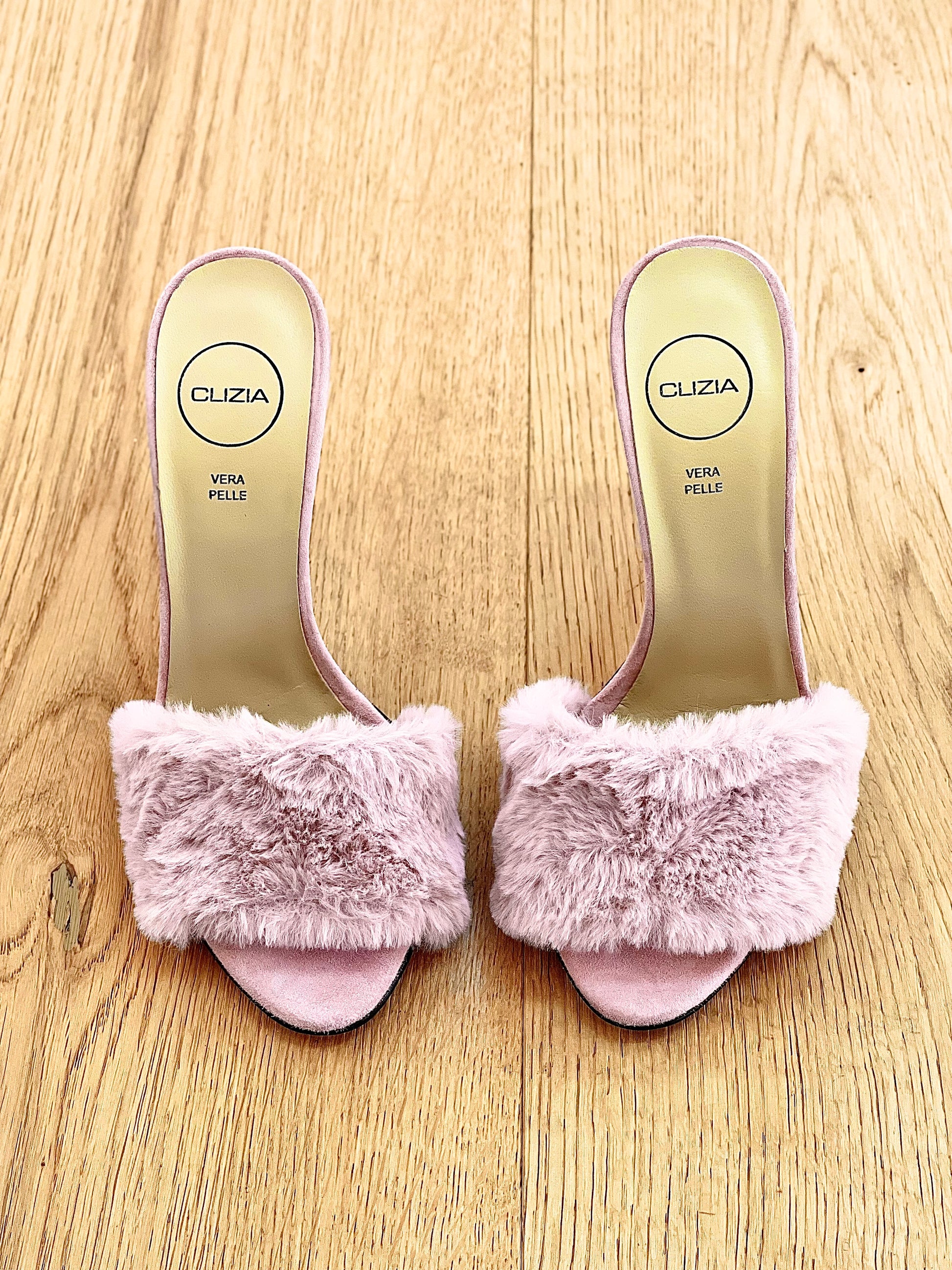 Sandálias altas mules chinelos de camurça com salto de pele.