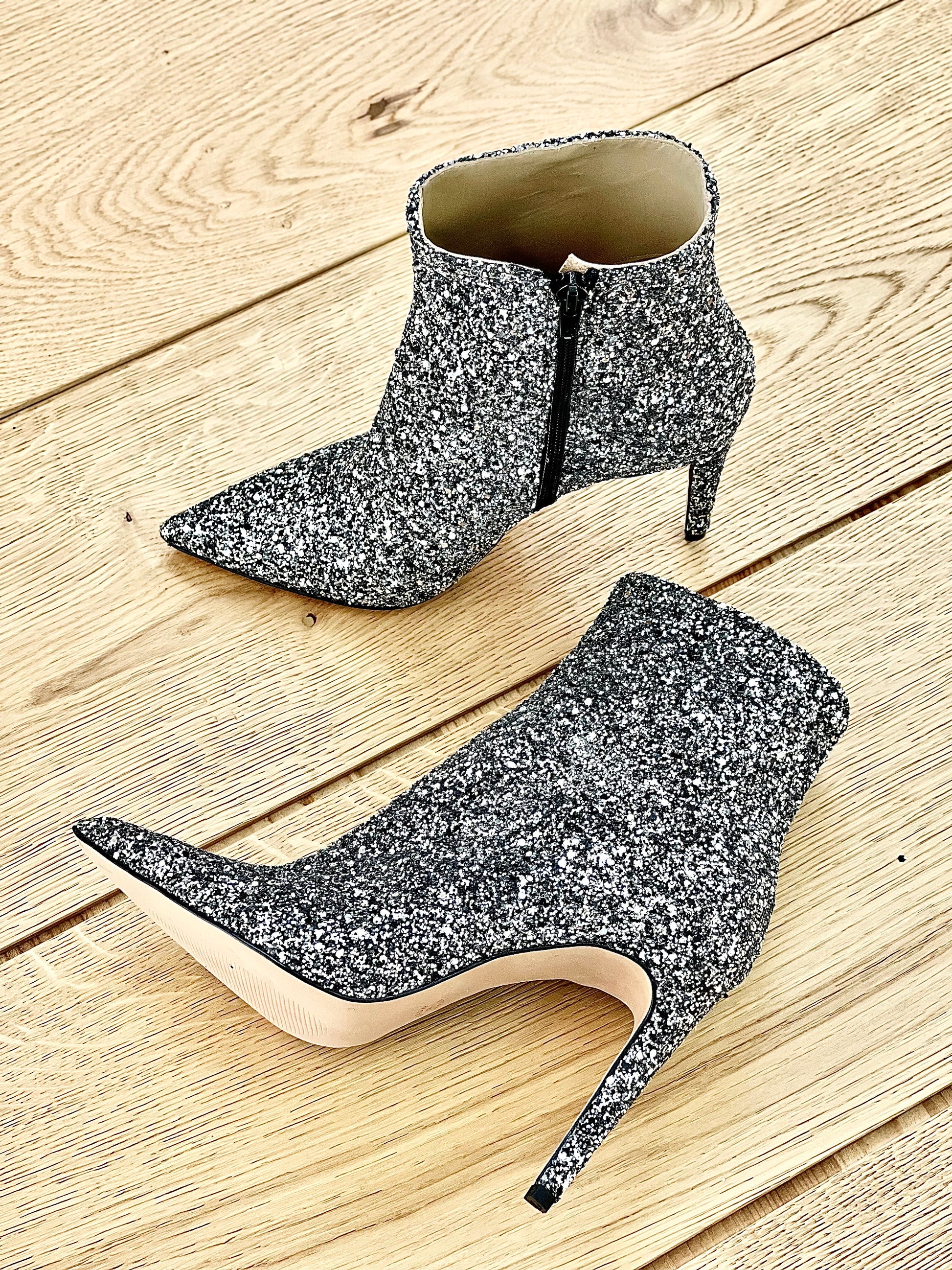 Botins de cano alto e pontiagudo em glitter com salto agulha de 10 cm.