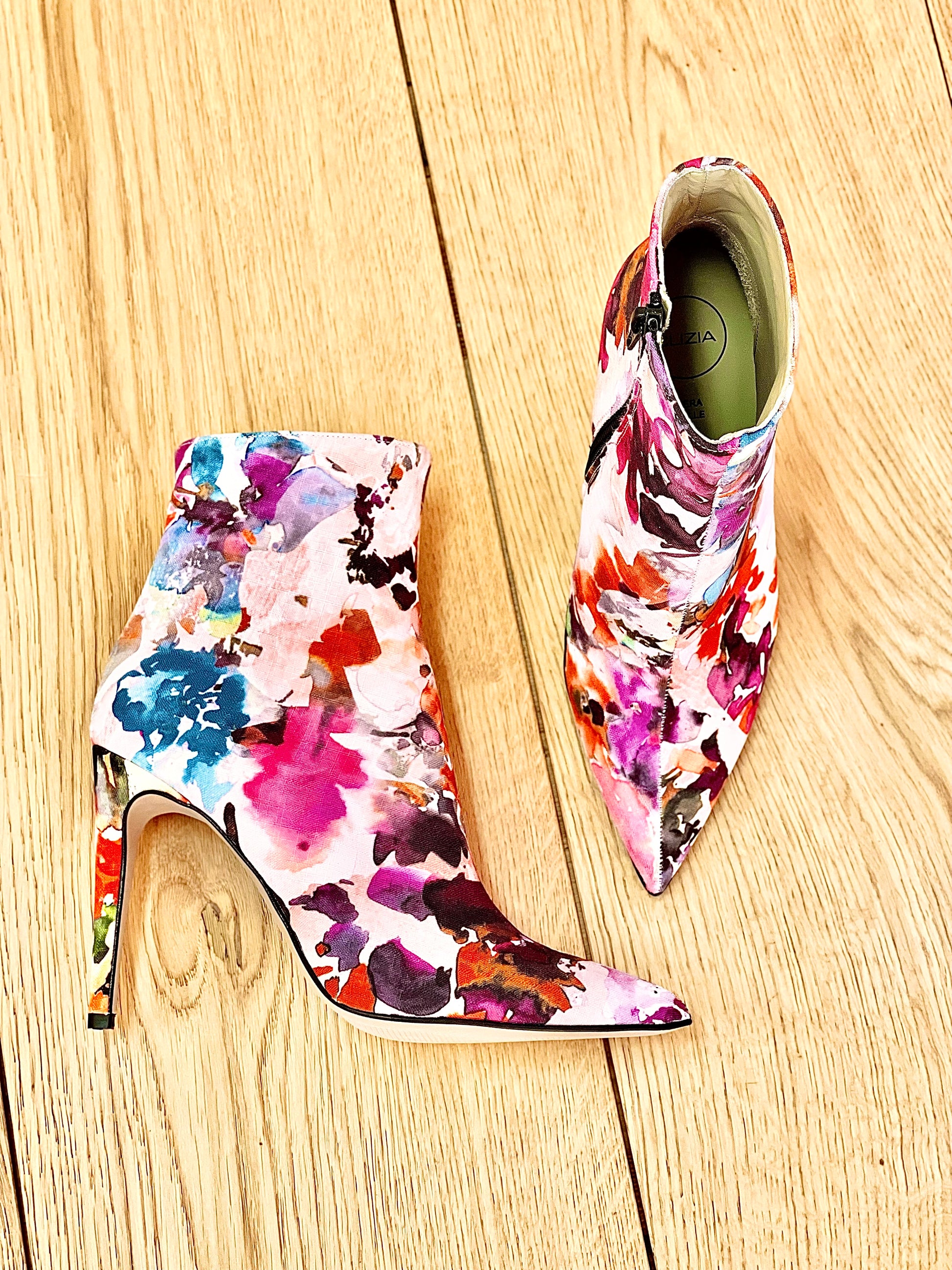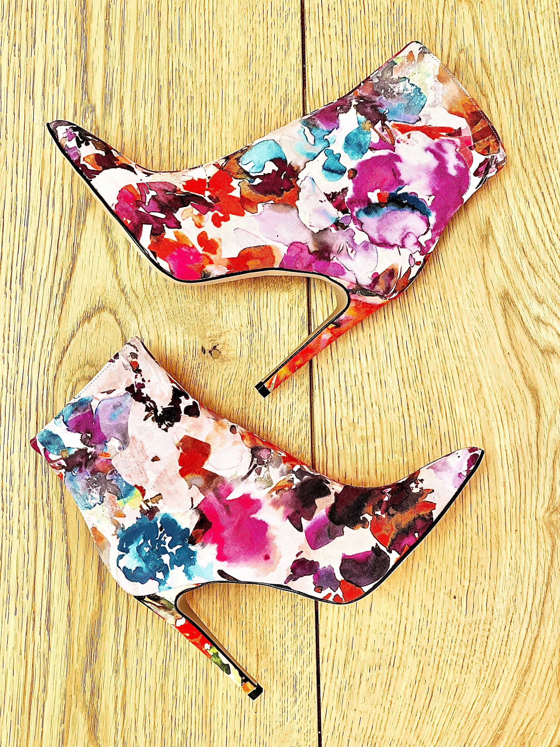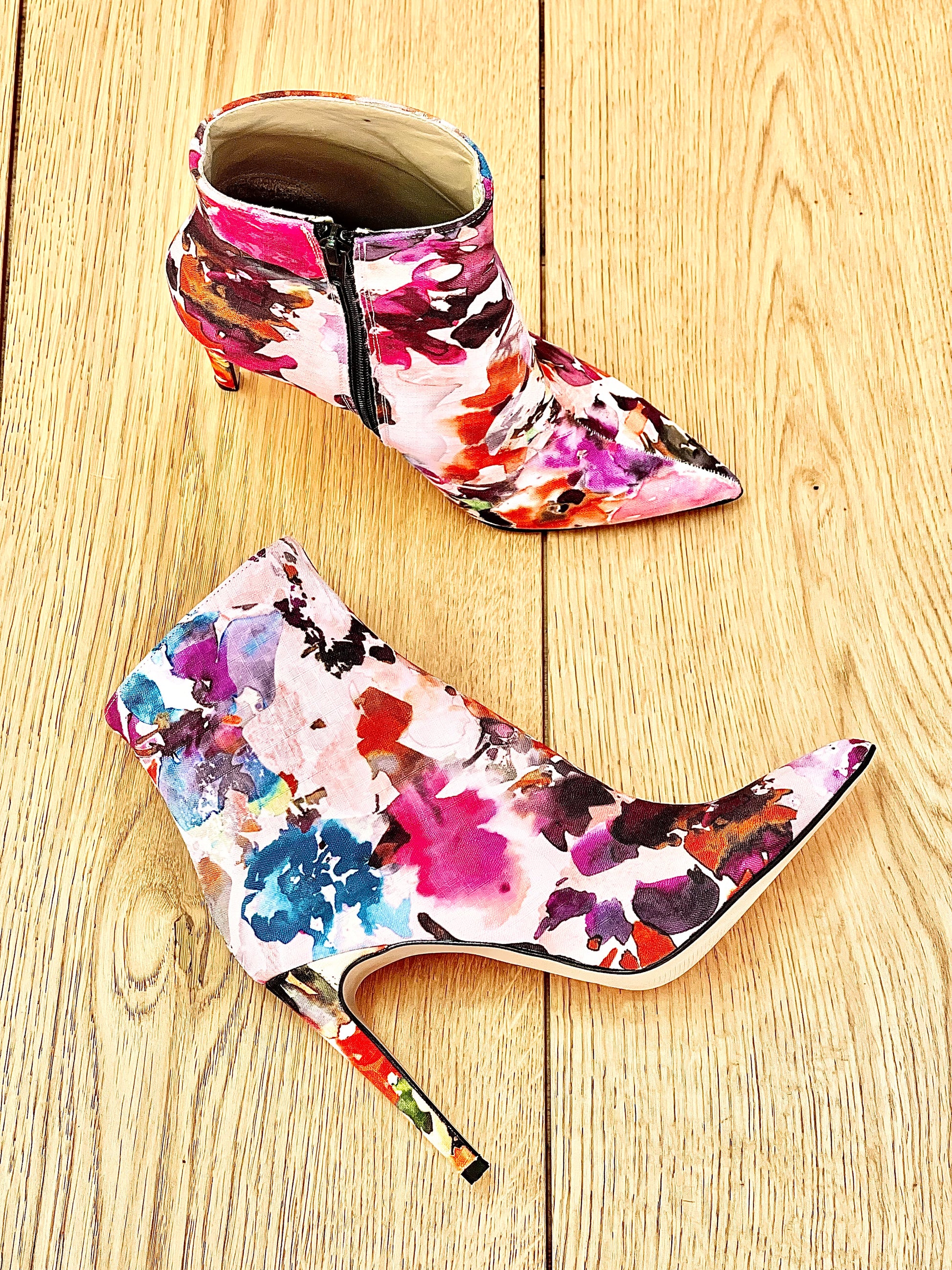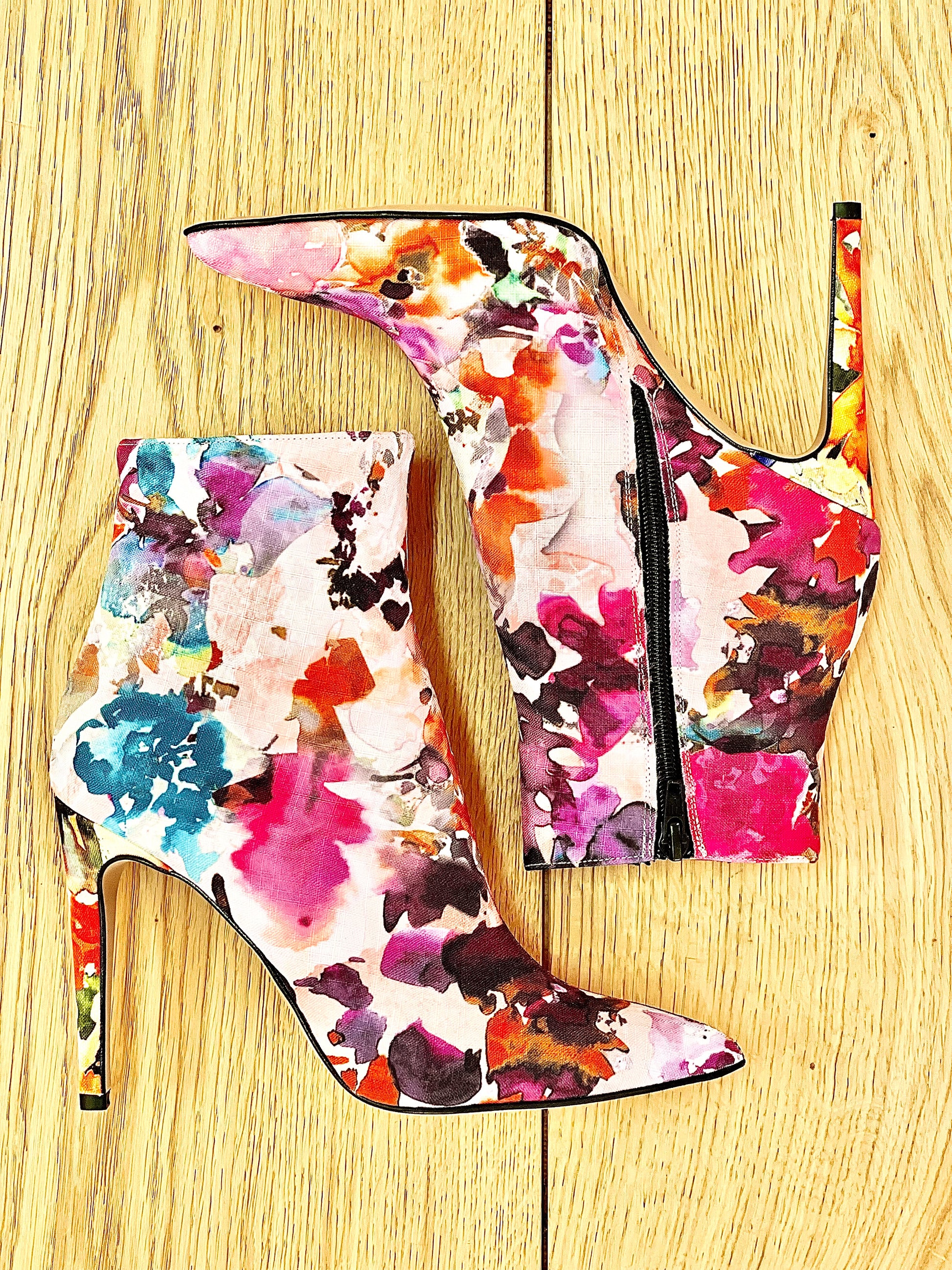 Botins multicoloridos de bico fino com salto agulha de 10 cm de altura.