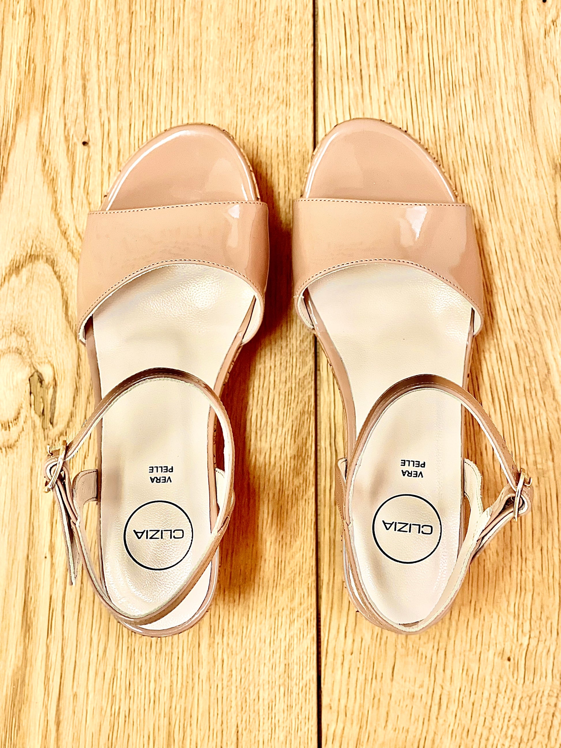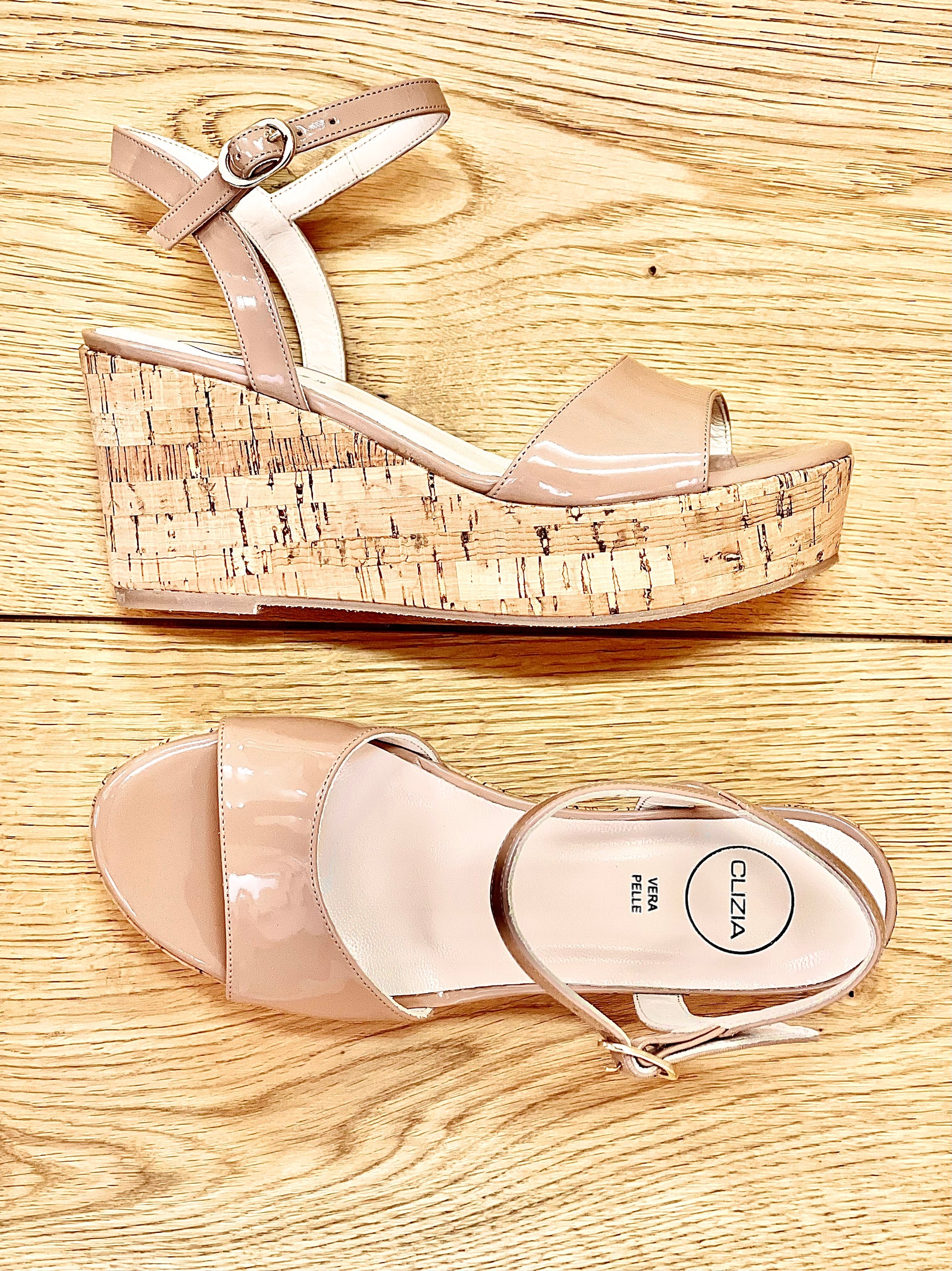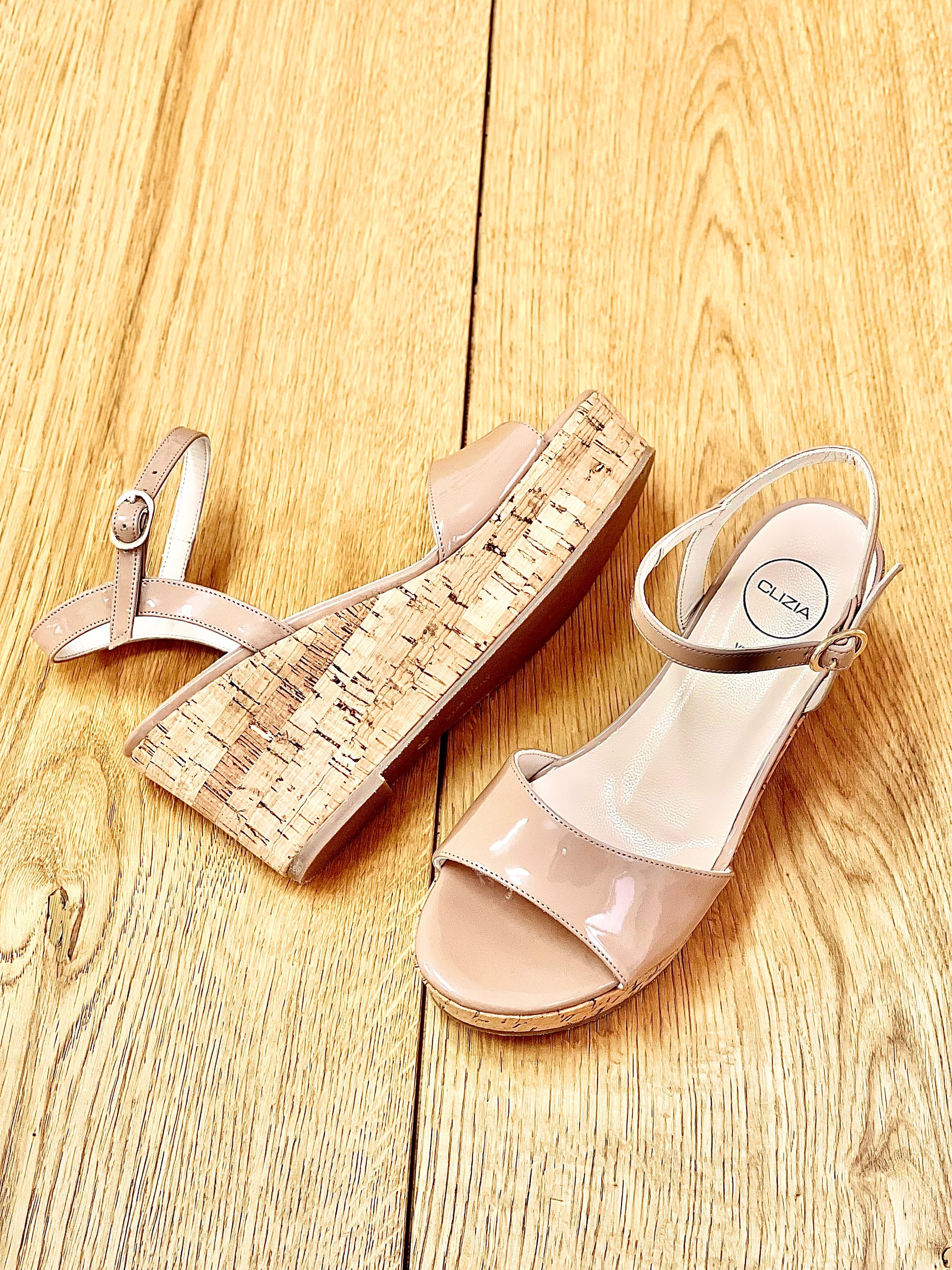 Sandálias com banda e tira em pele patenteada e cunha de cortiça de 8 cm.