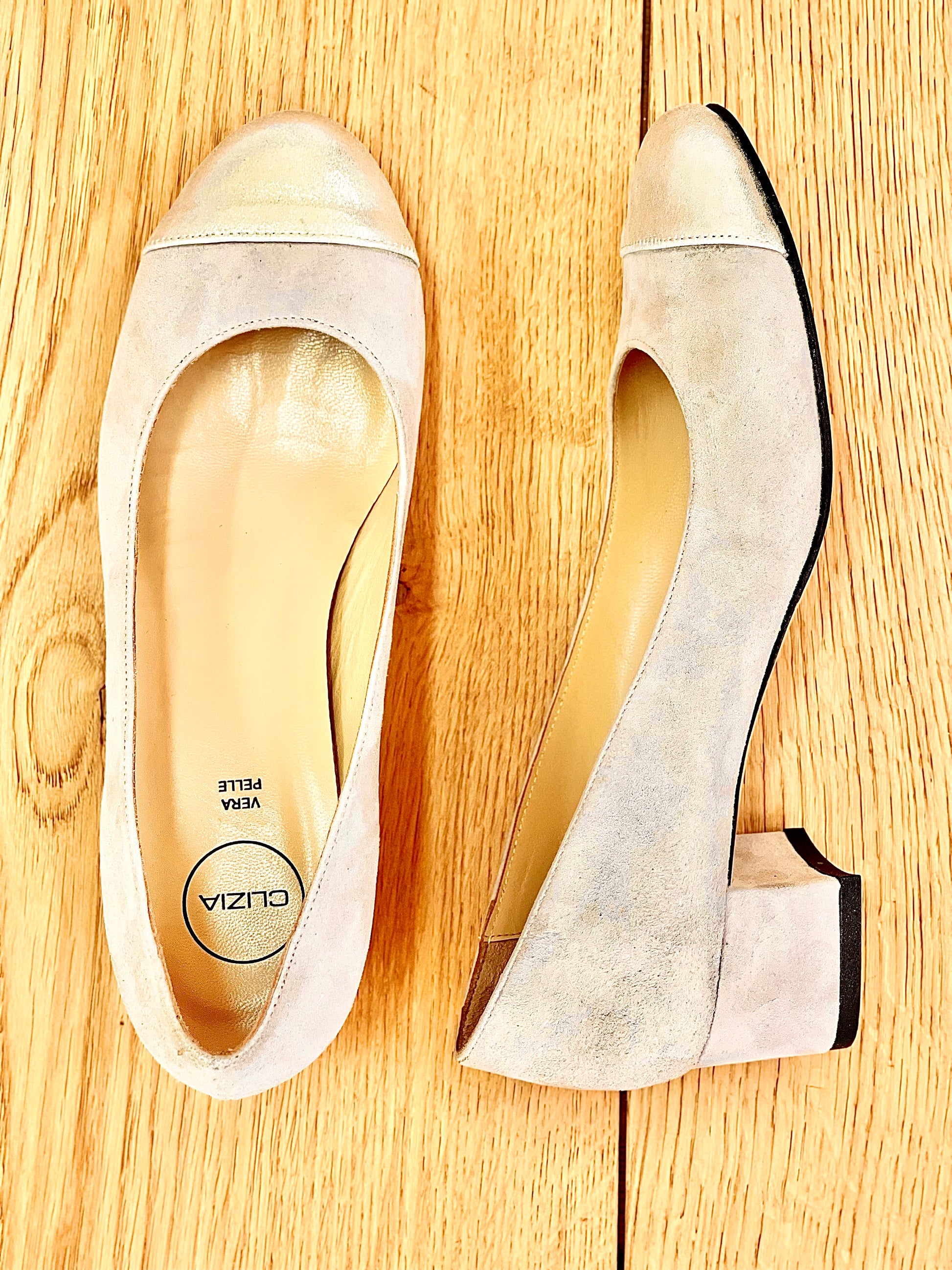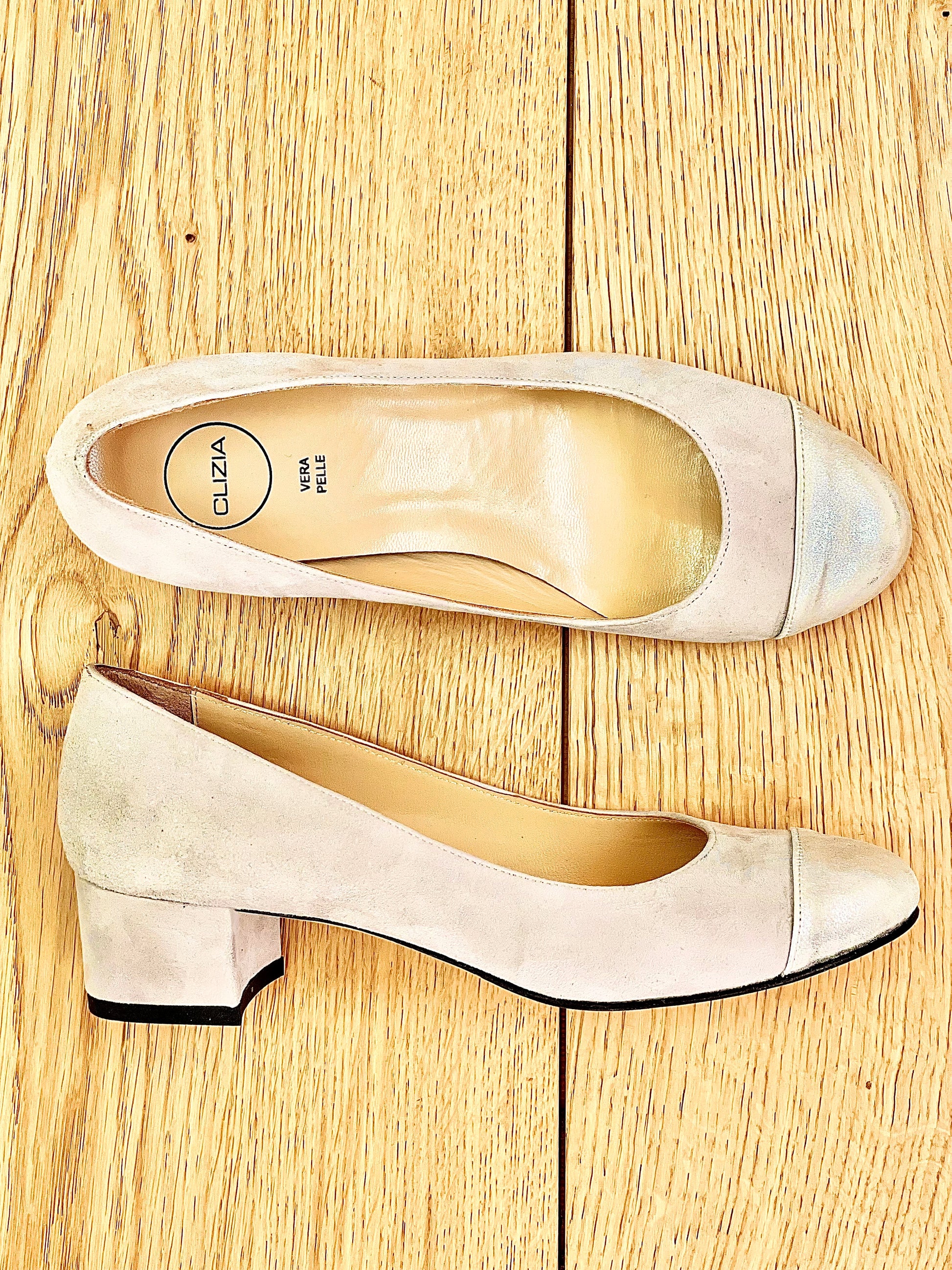 Biqueira arredondada em camurça com ponta prateada e salto largo.