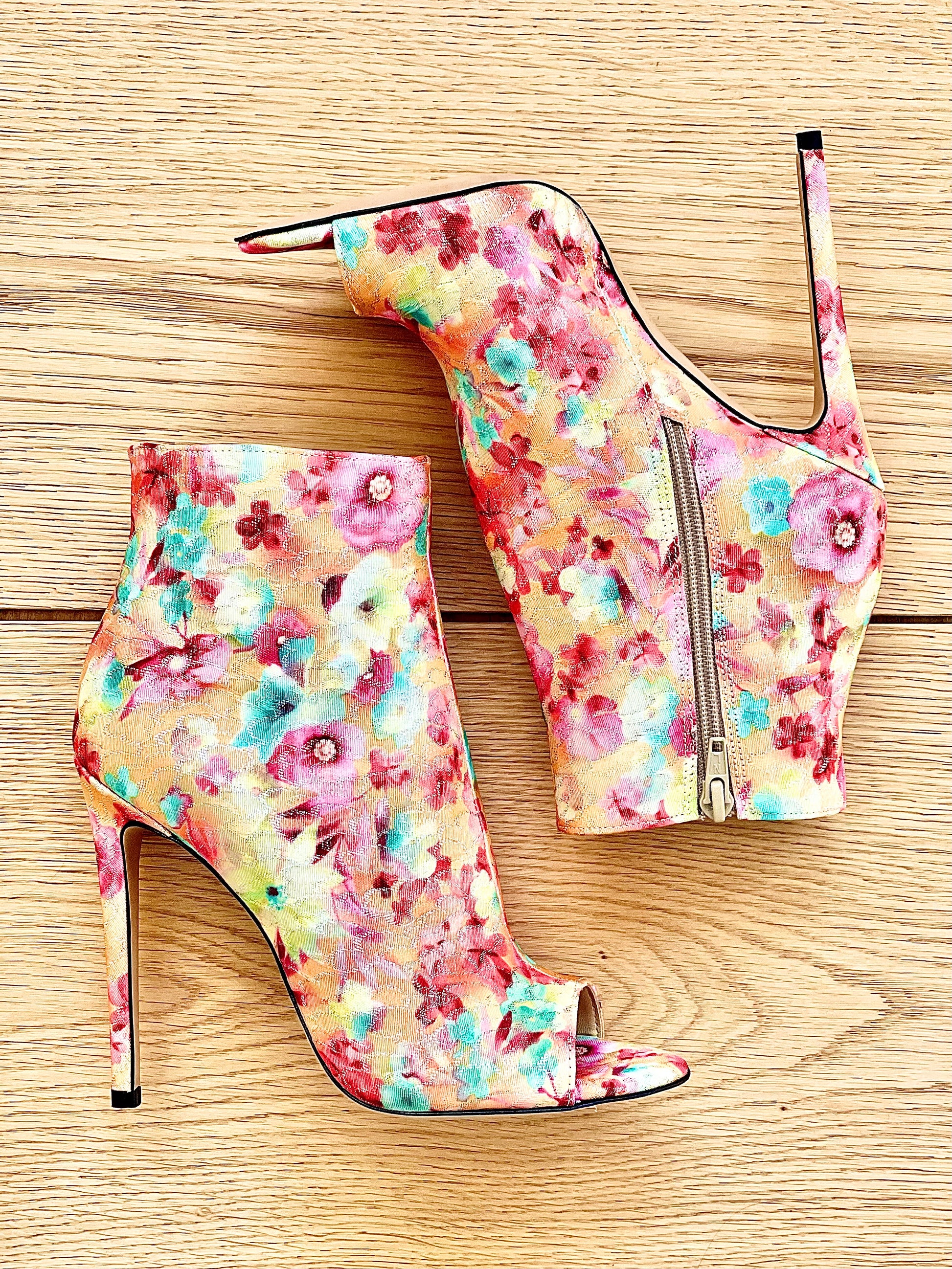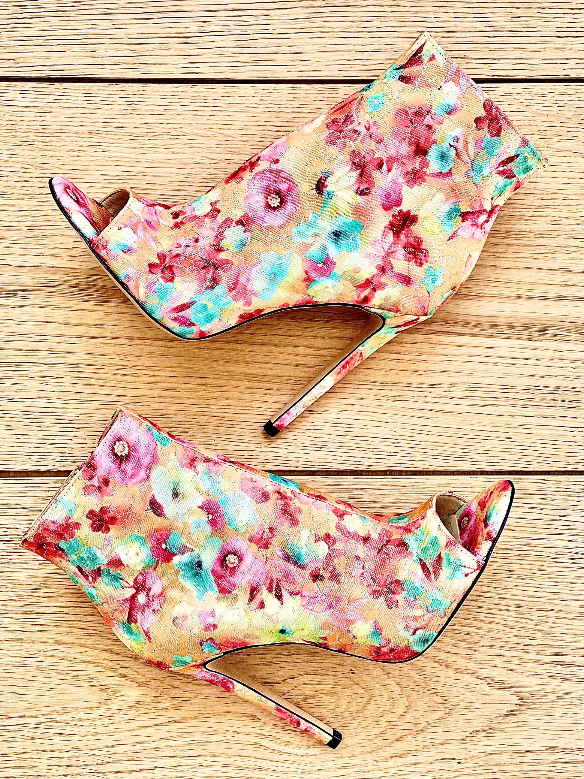 Botins de cano alto em floral multicolorido com salto de 12 cm.