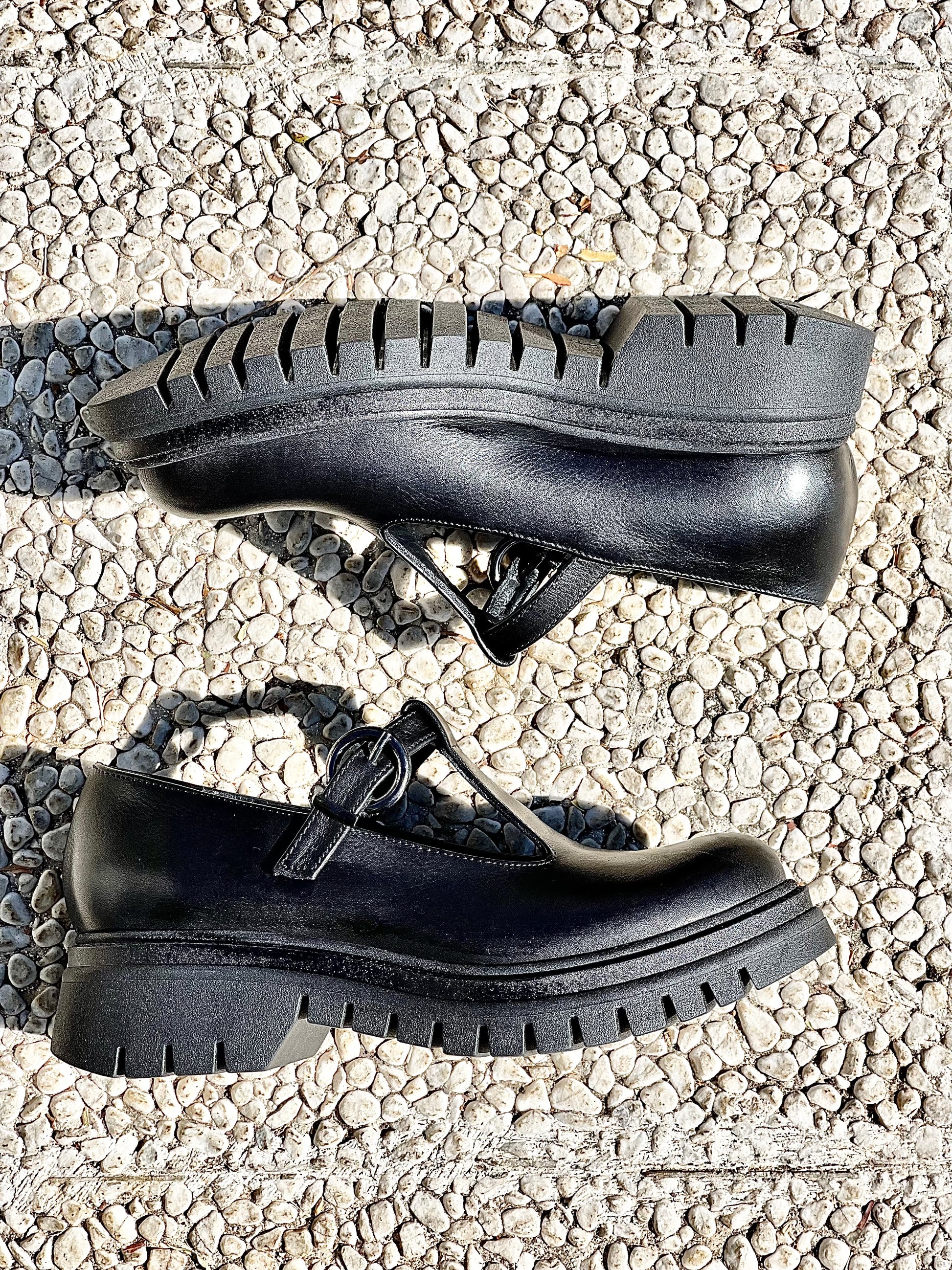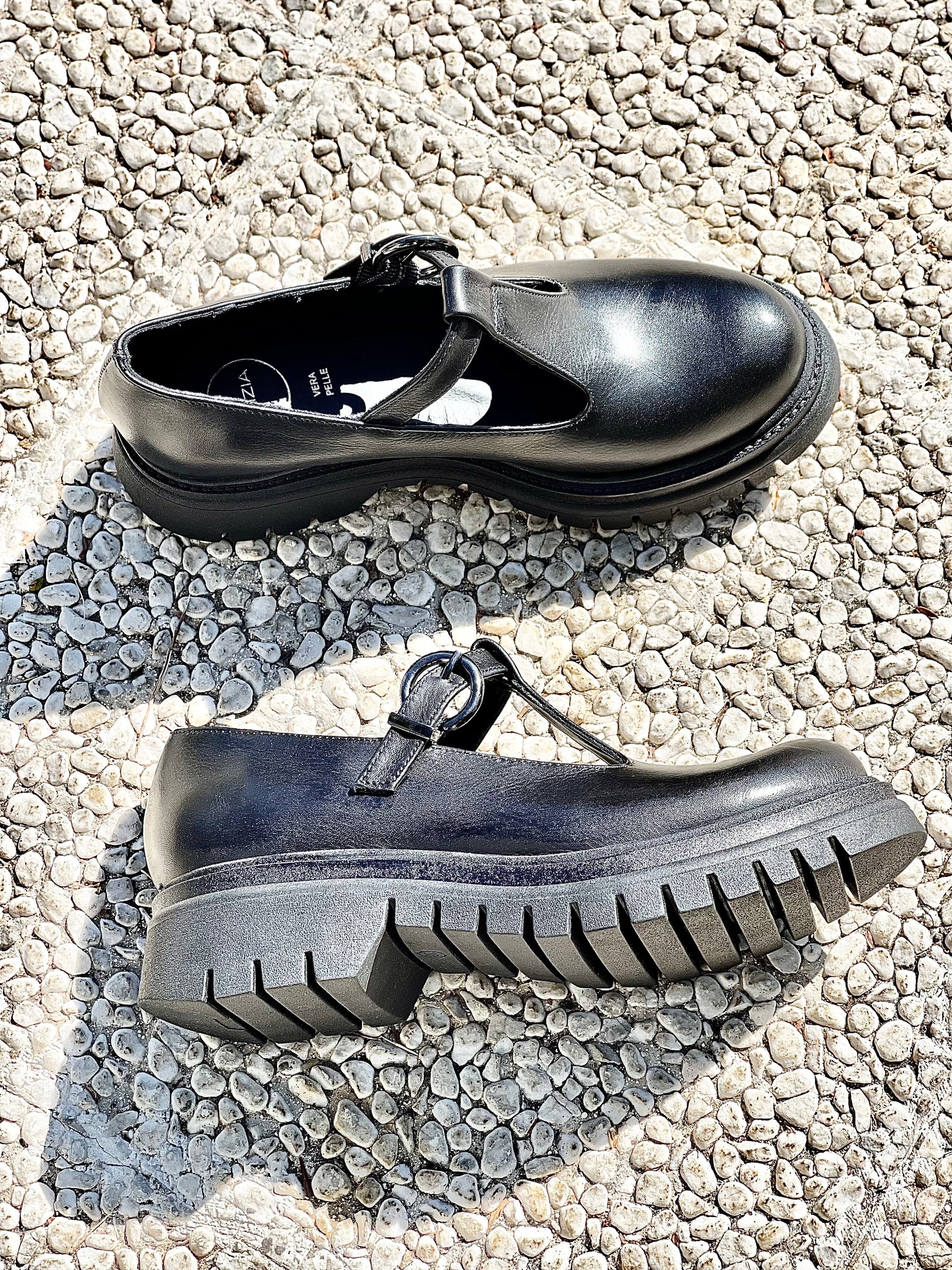Sapato baixo em pele com tira à frente e salto de 3 cm.