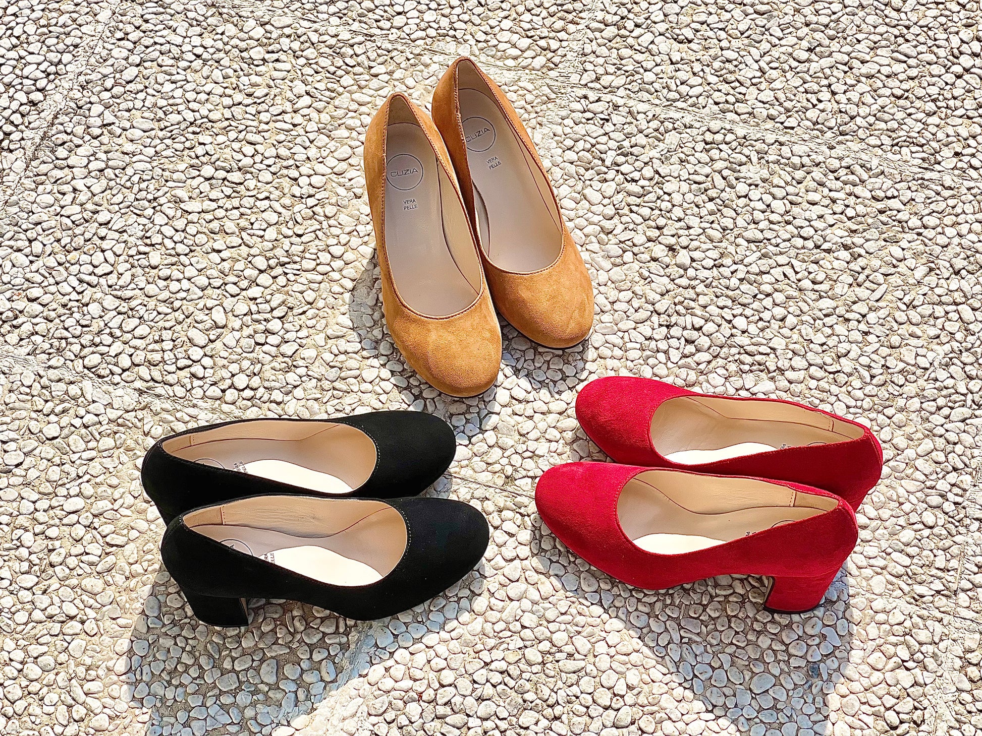Decote em camurça com biqueira redonda e salto largo de 75 mm.