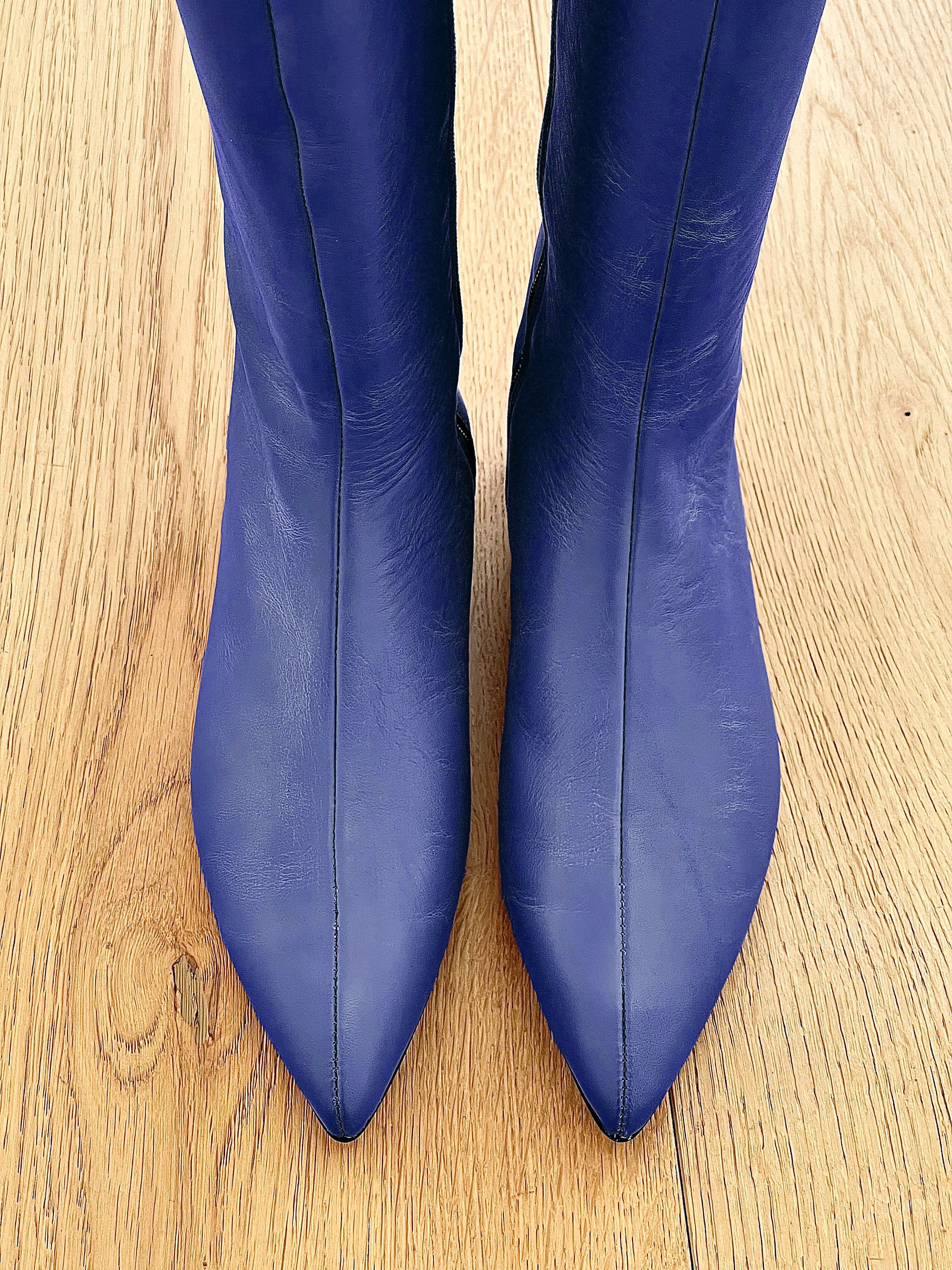 Botas de couro com bico pontiagudo e salto de 1 cm.