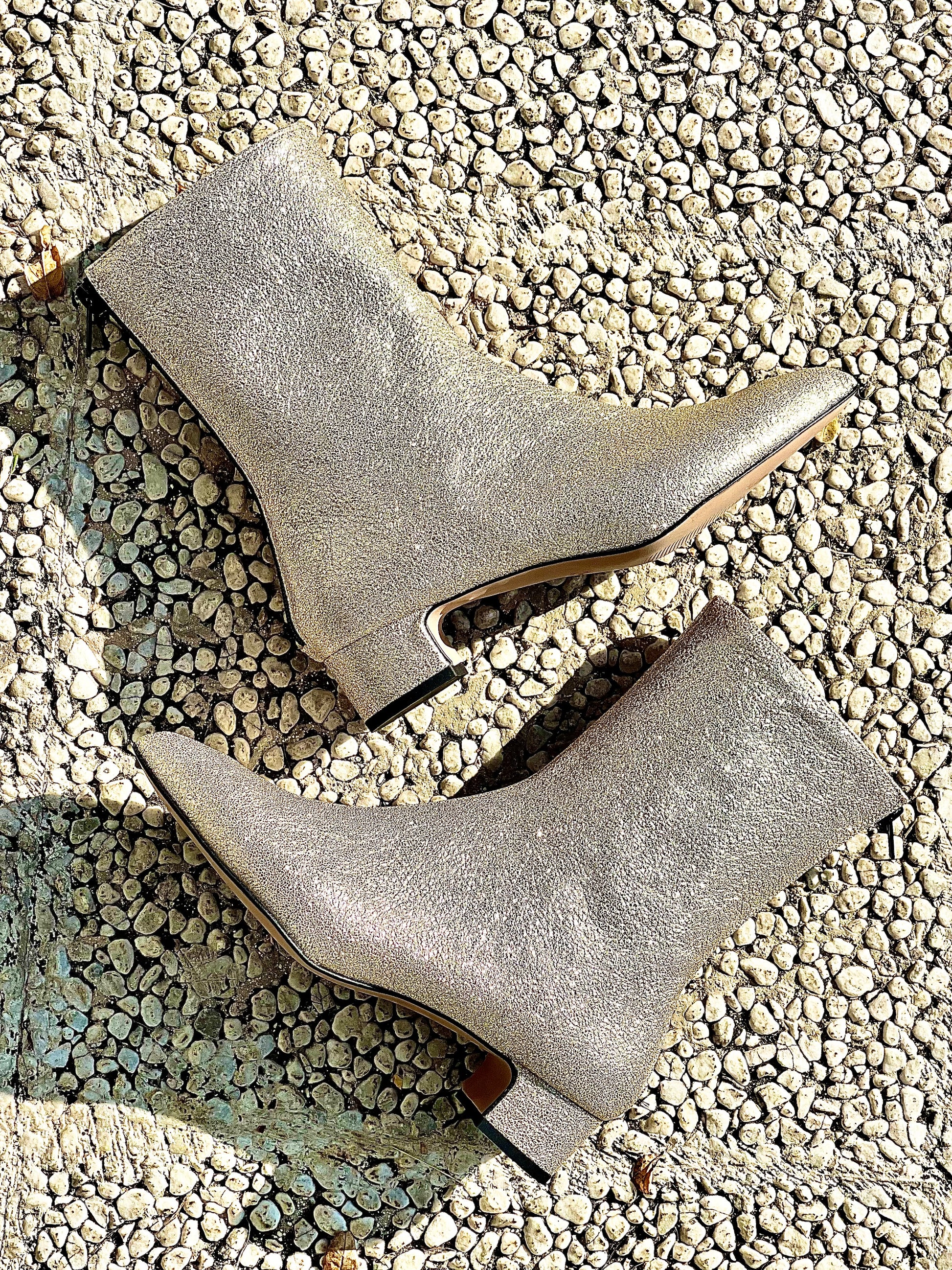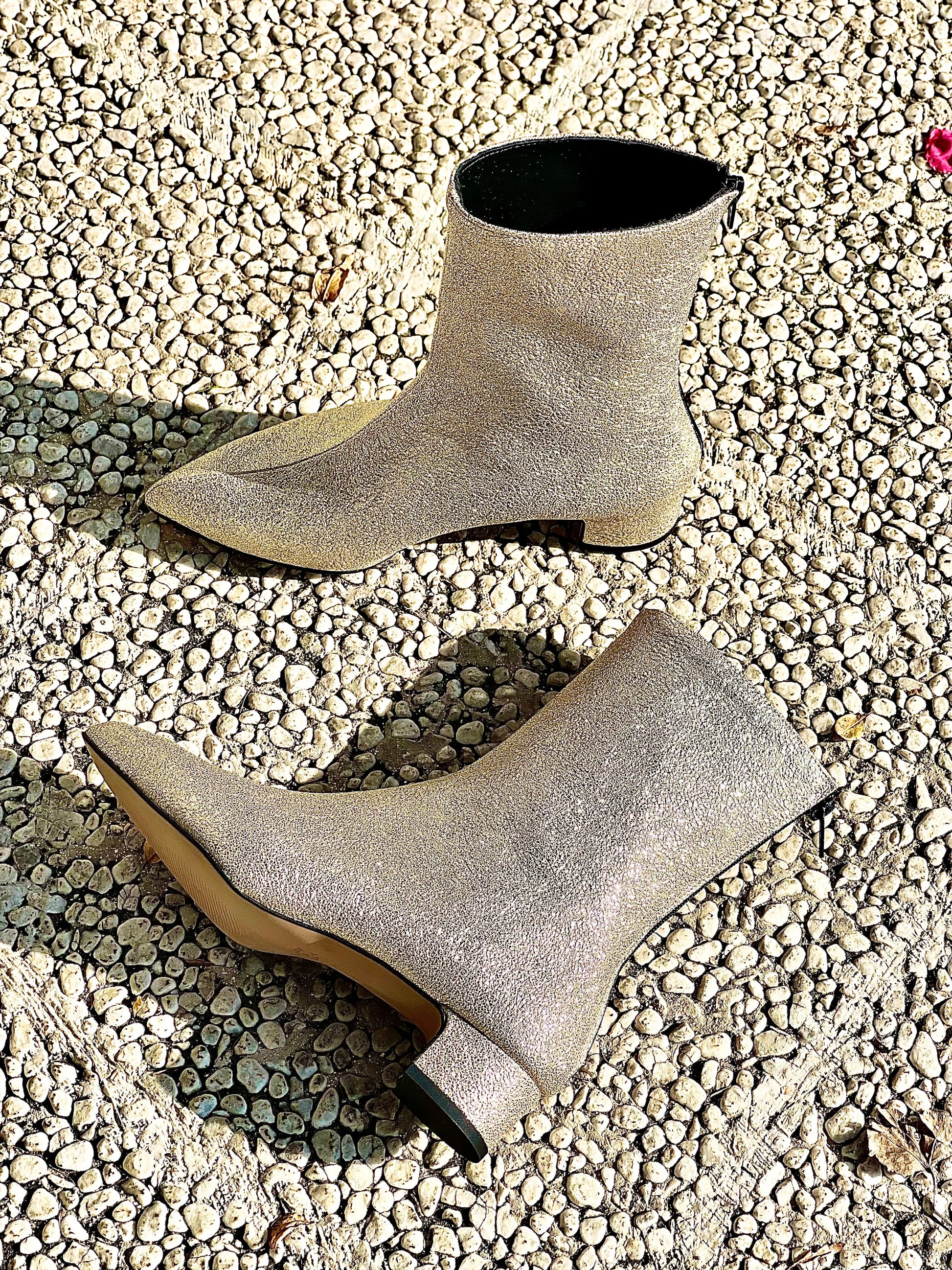Bota de tornozelo de salto largo laminado e pontiagudo com fecho de correr atrás.