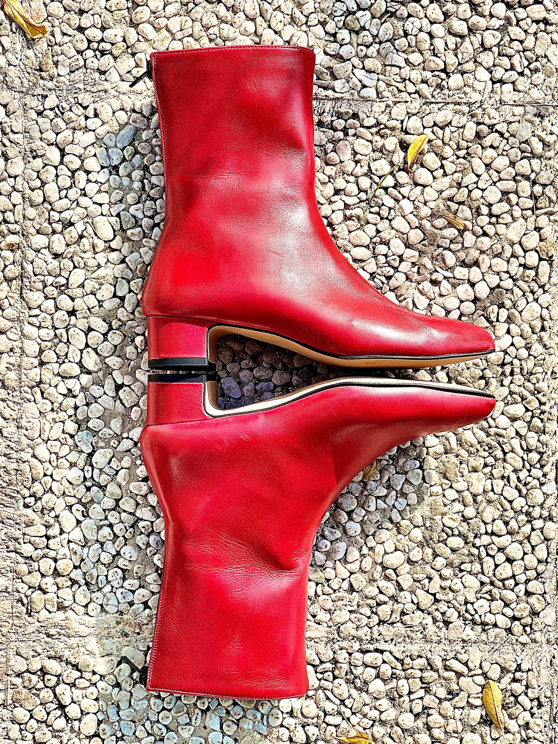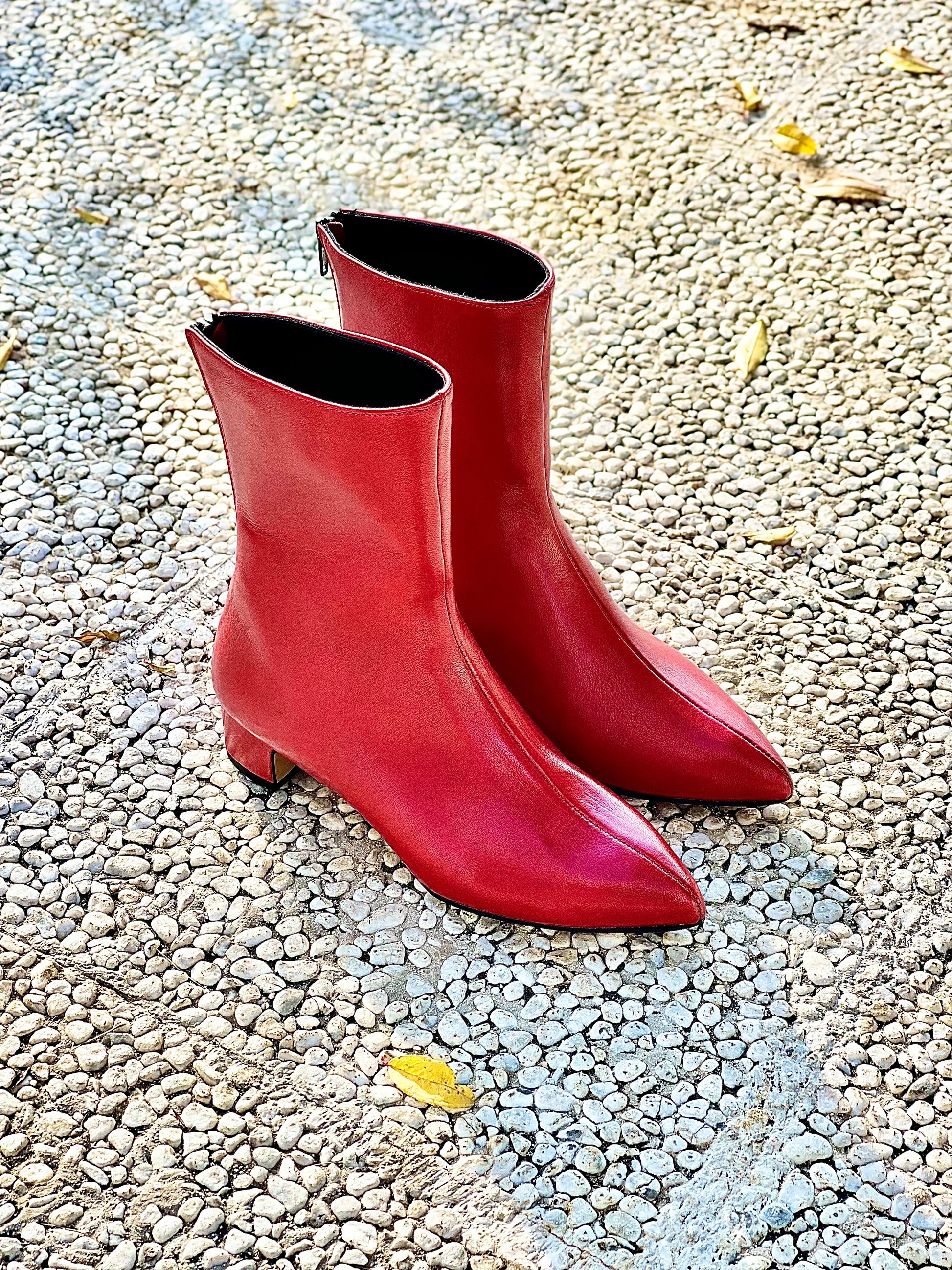 Botins em pele de biqueira pontiaguda com salto largo e fecho de correr atrás.