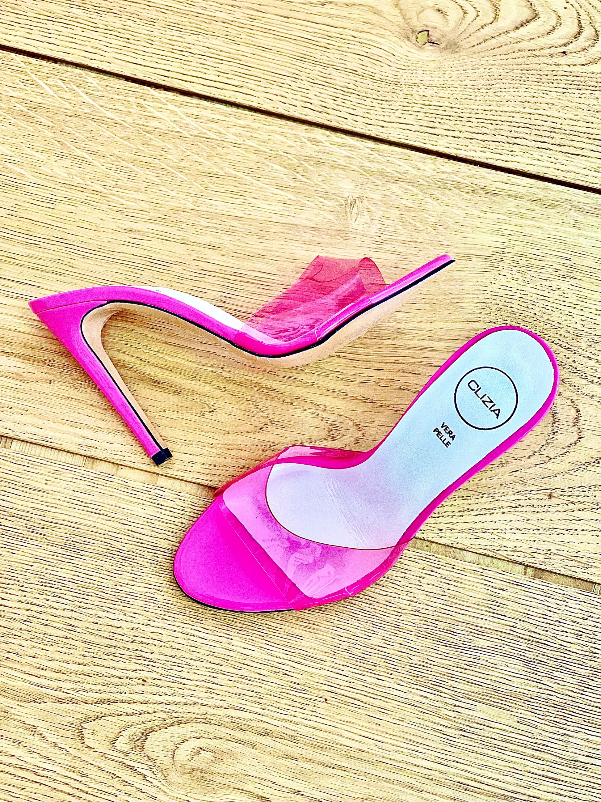 Sandálias mules altas em pvc transparente com salto agulha de 10cm.