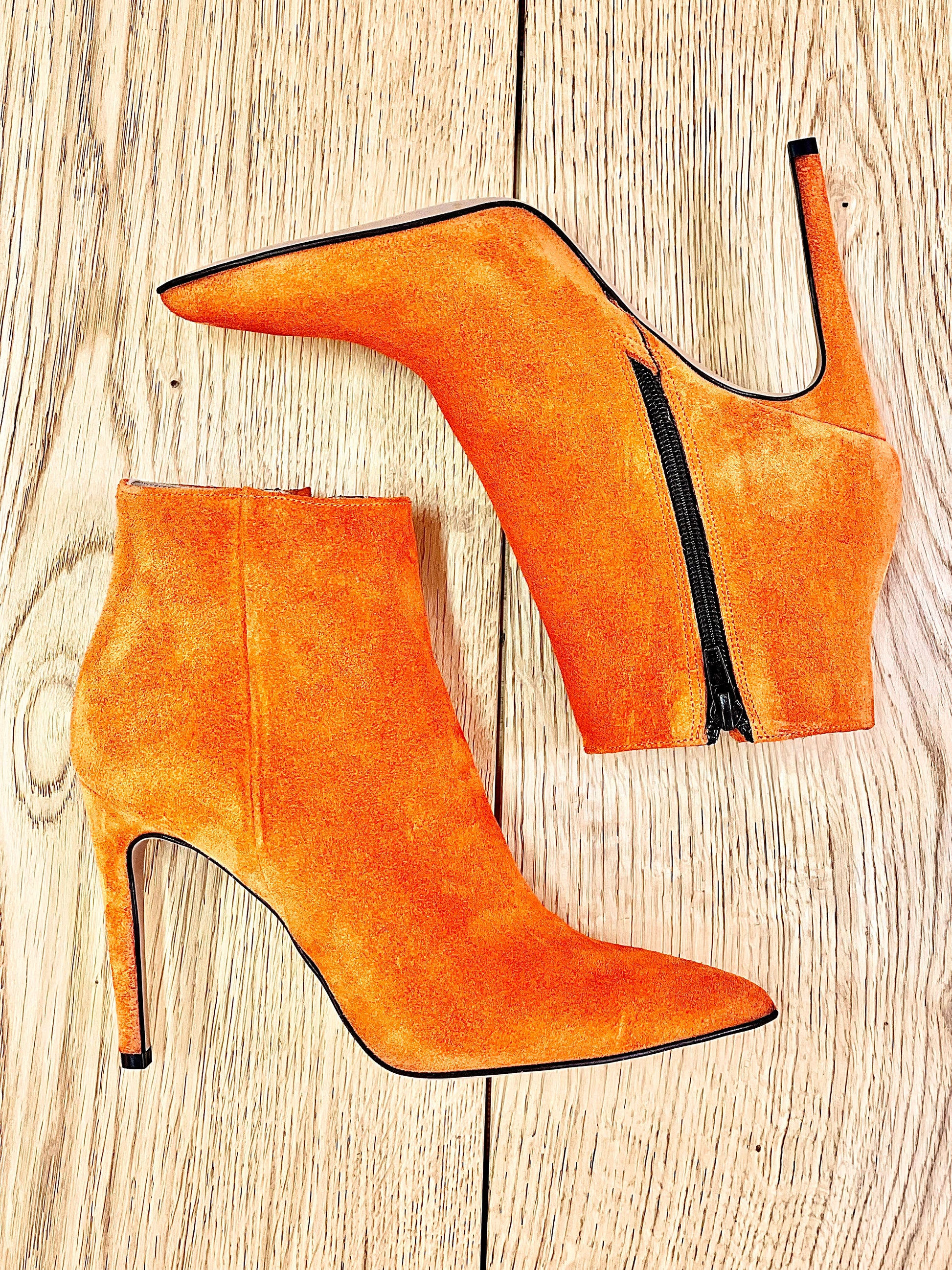 Botins de camurça com bico pontiagudo e salto agulha de 10 cm de altura.