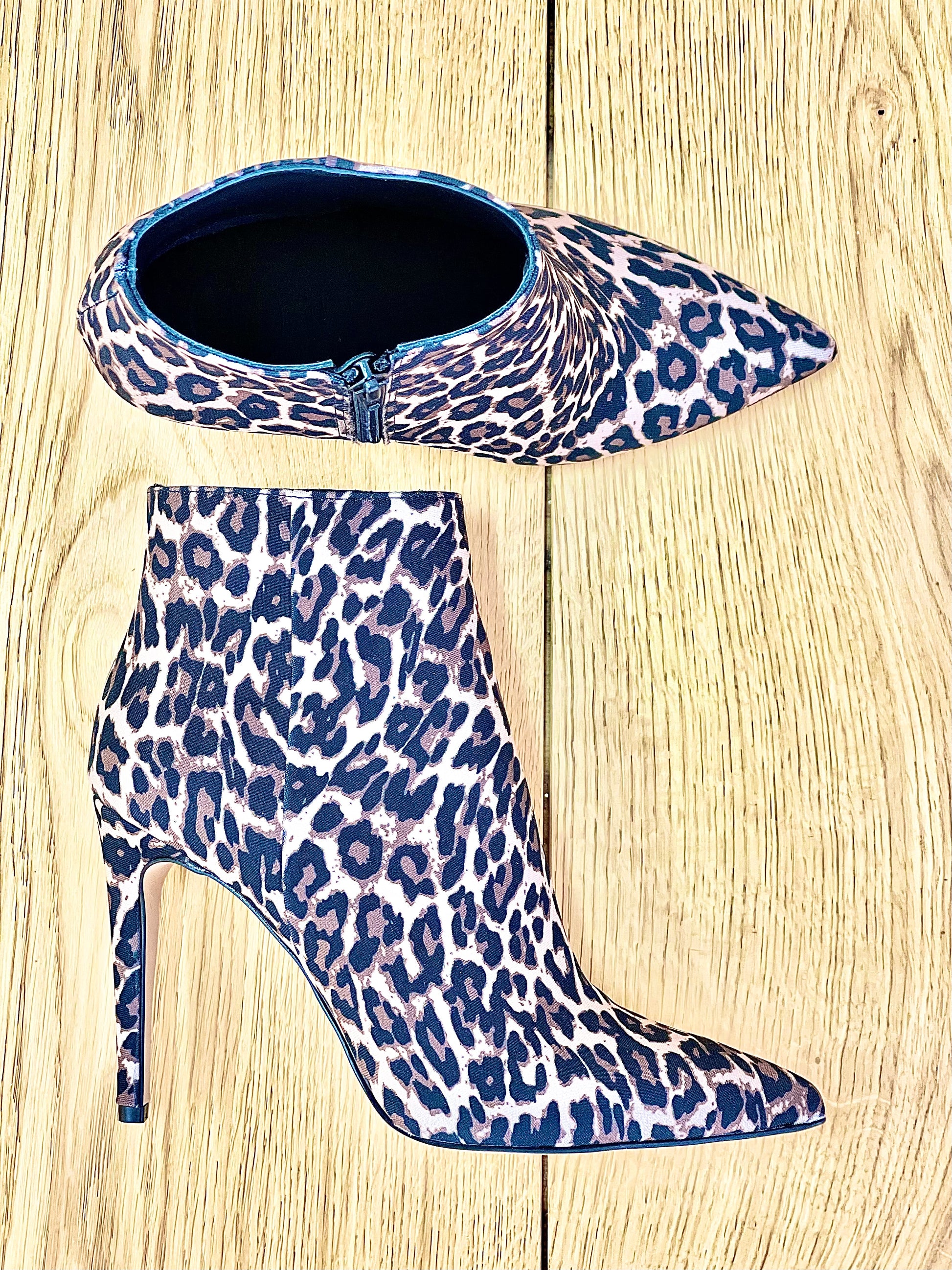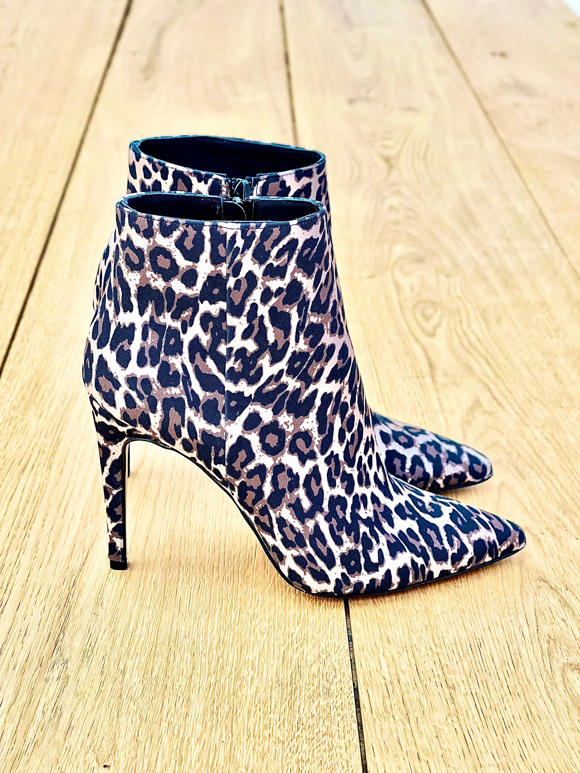 Botins de bico fino com estampado de leopardo e salto agulha de 10 cm de altura.