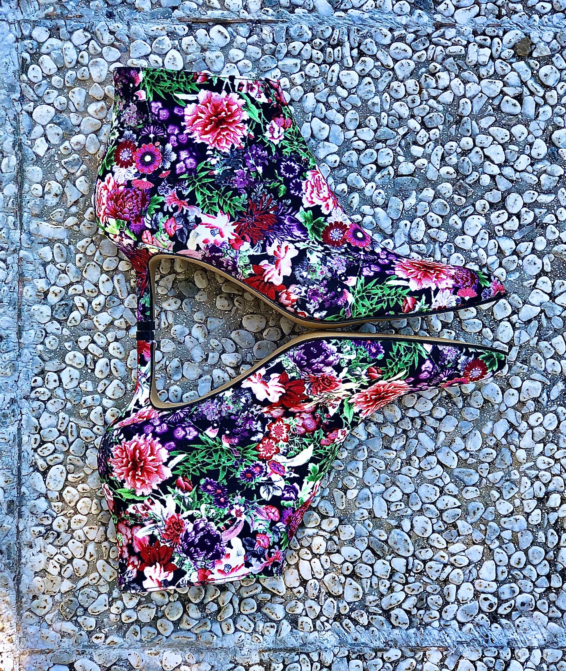 Bota de cano alto em tecido floral, salto de 6 cm.