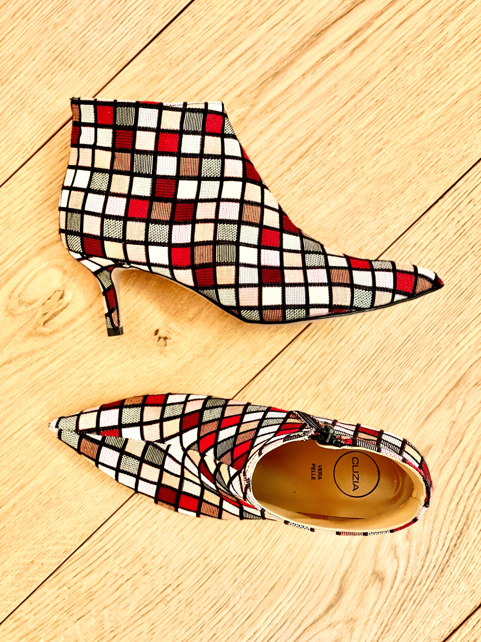 Botins de bico fino com padrão quadrado jacquard multicolorido.