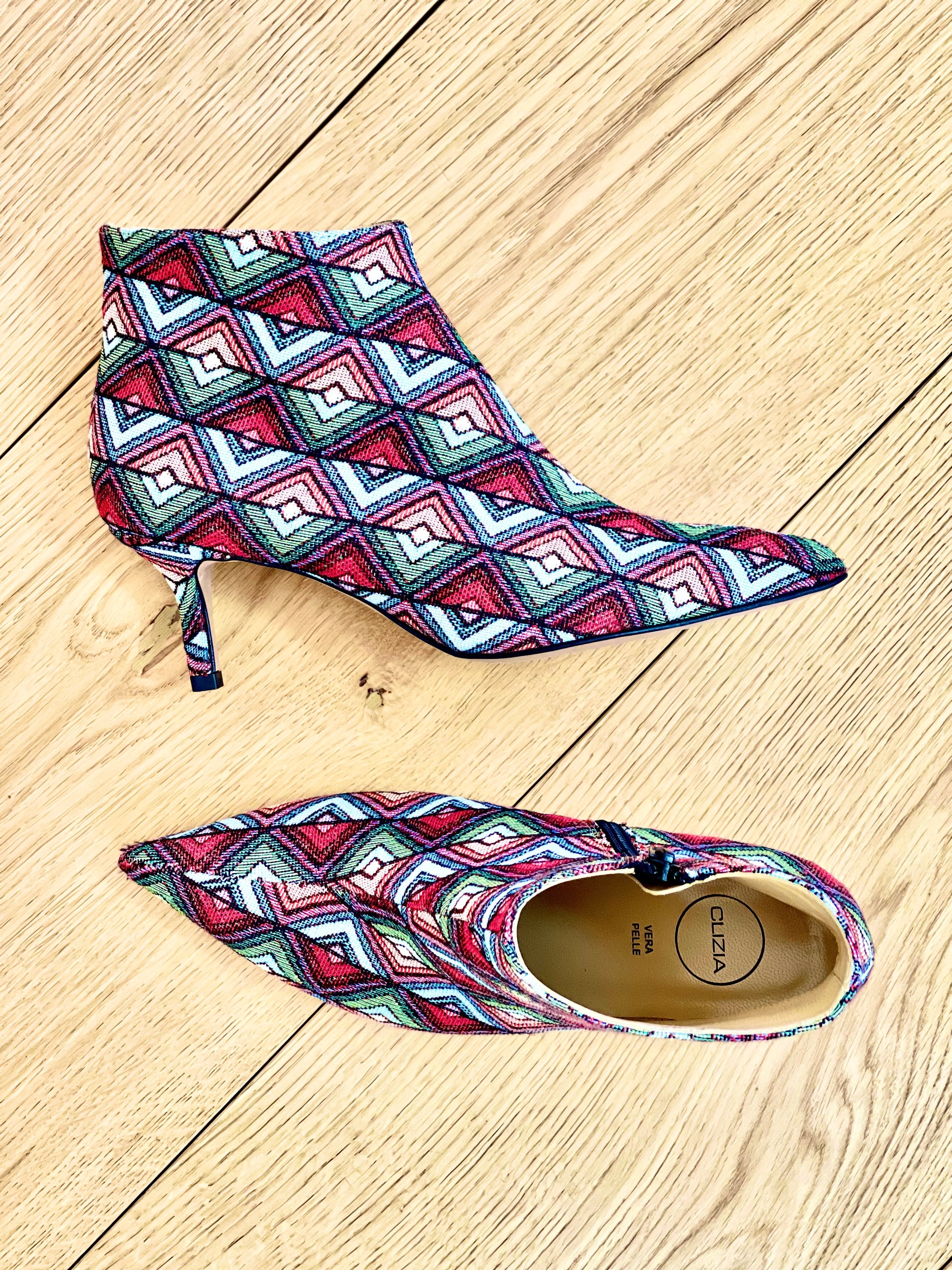 Botins de bico fino em jacquard multicolorido com padrão de diamantes.