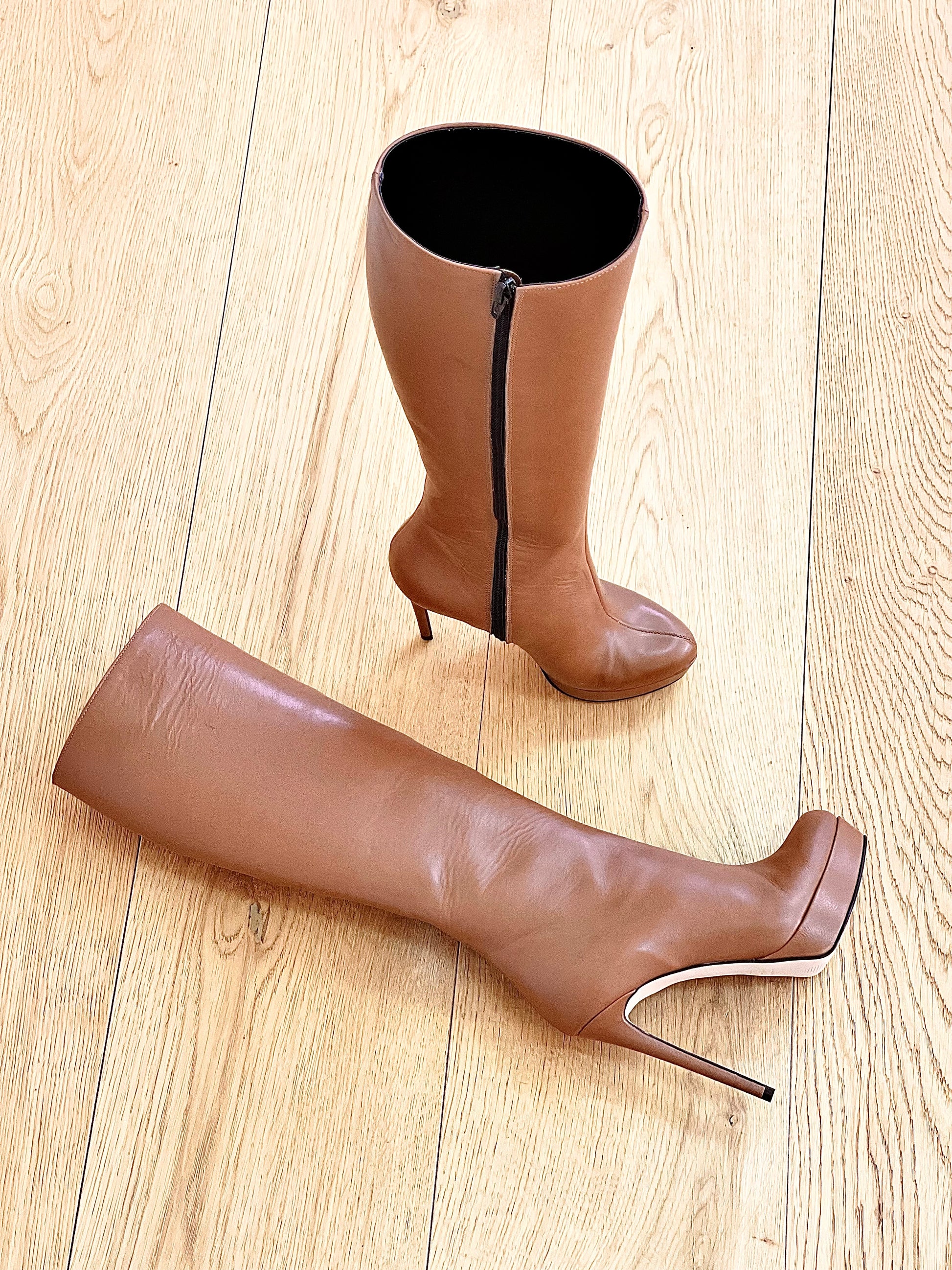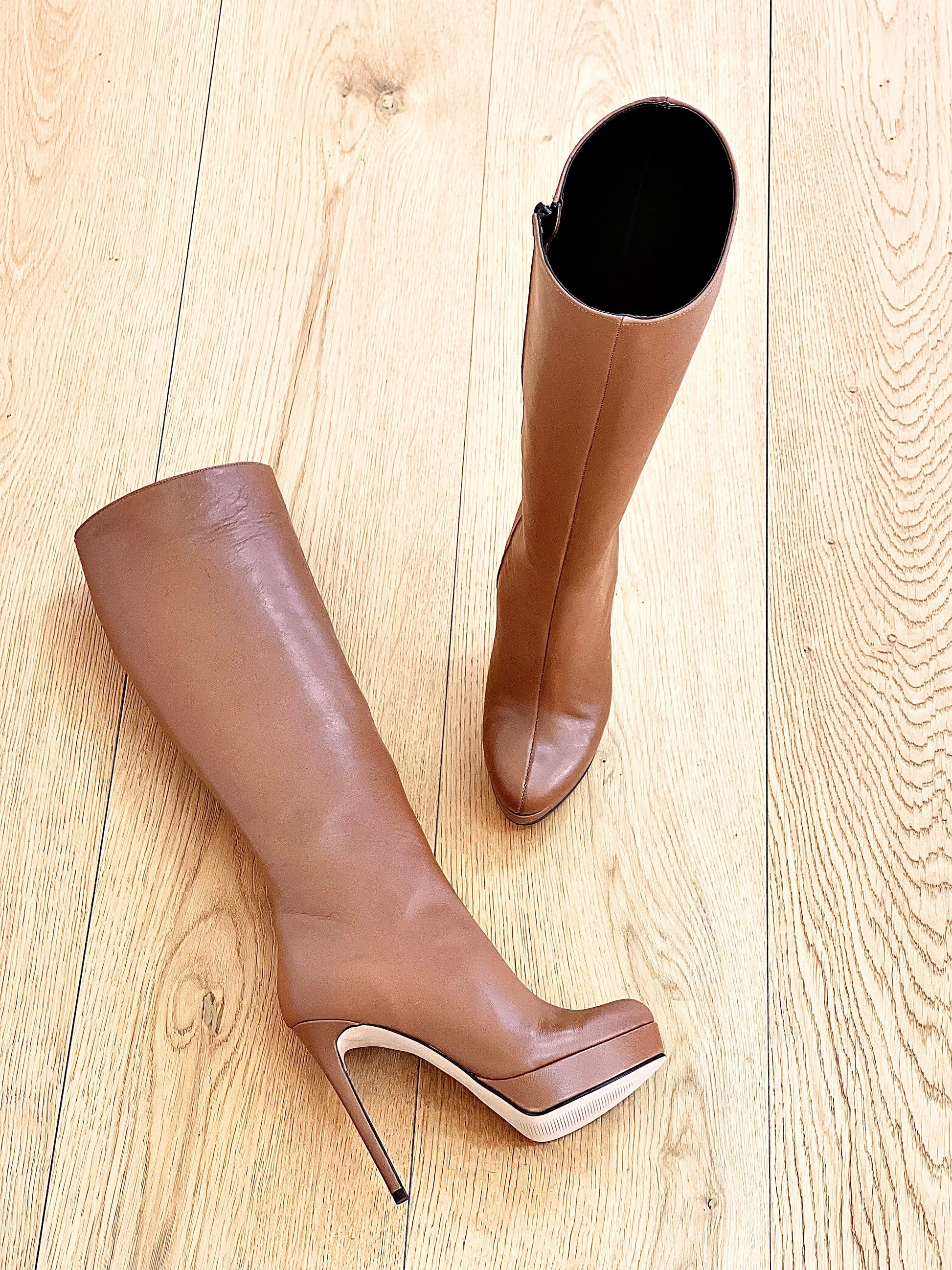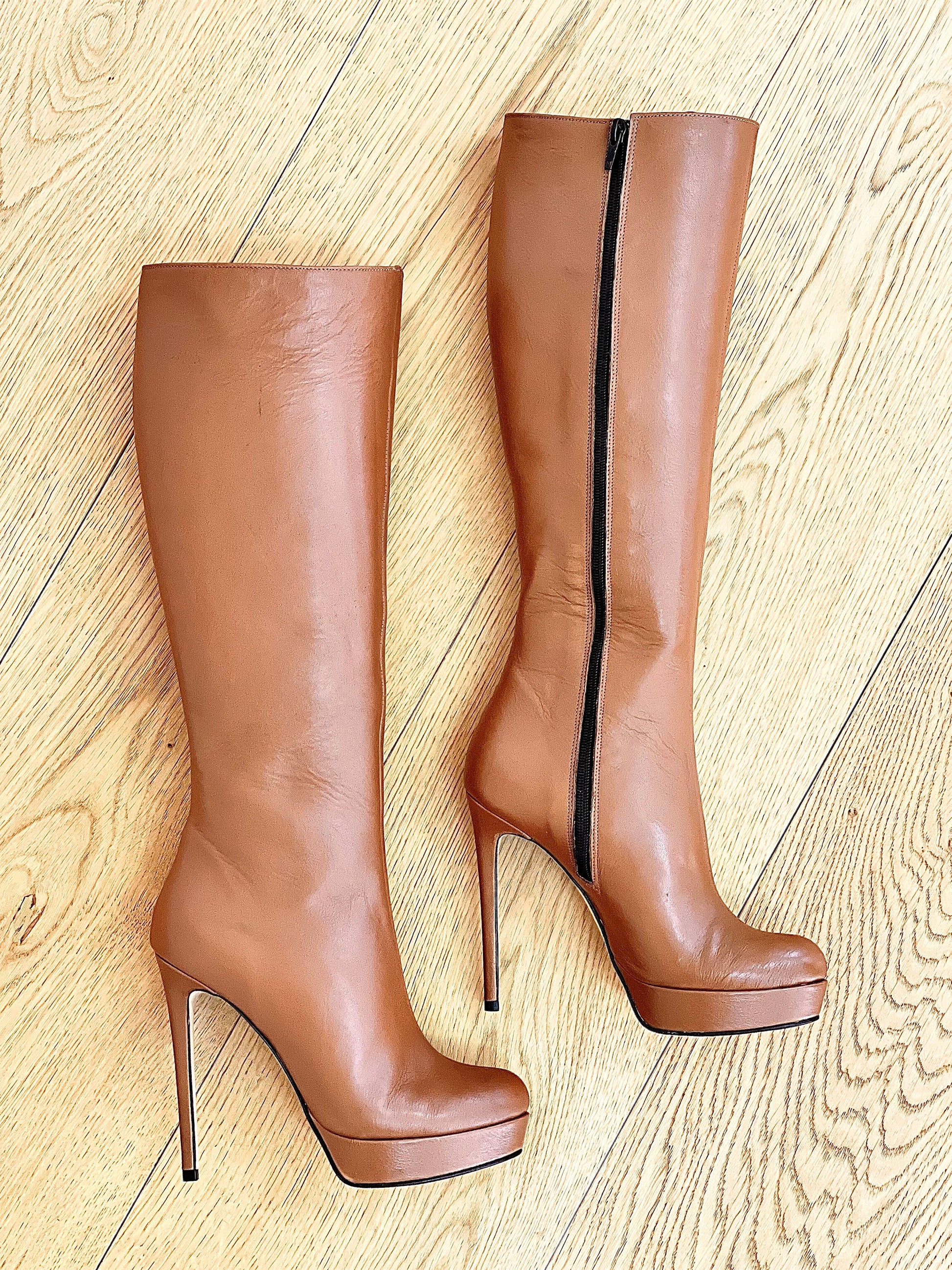 Botas de cano alto com biqueira redonda em pele e salto agulha.