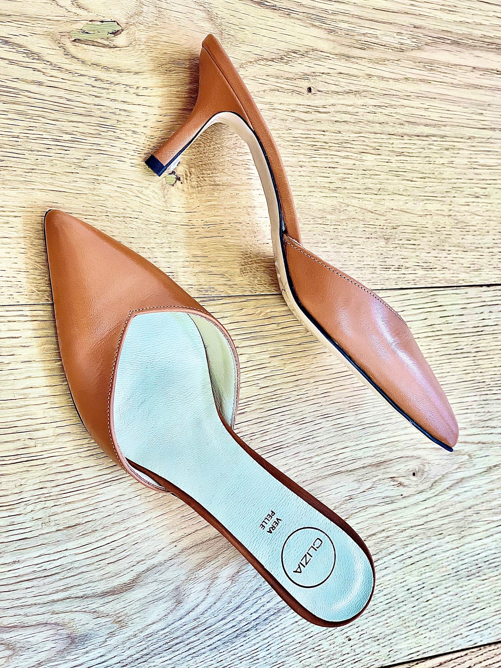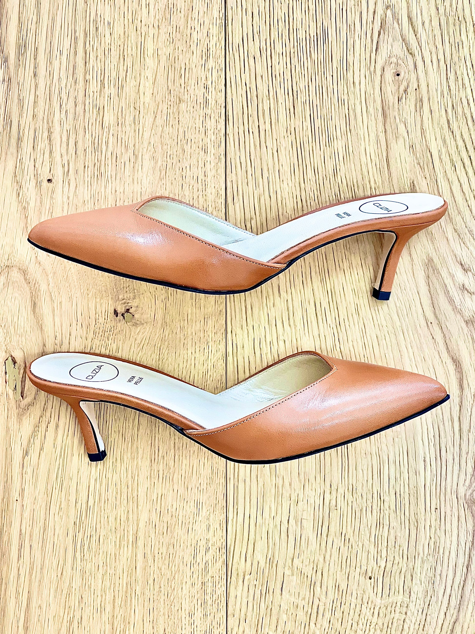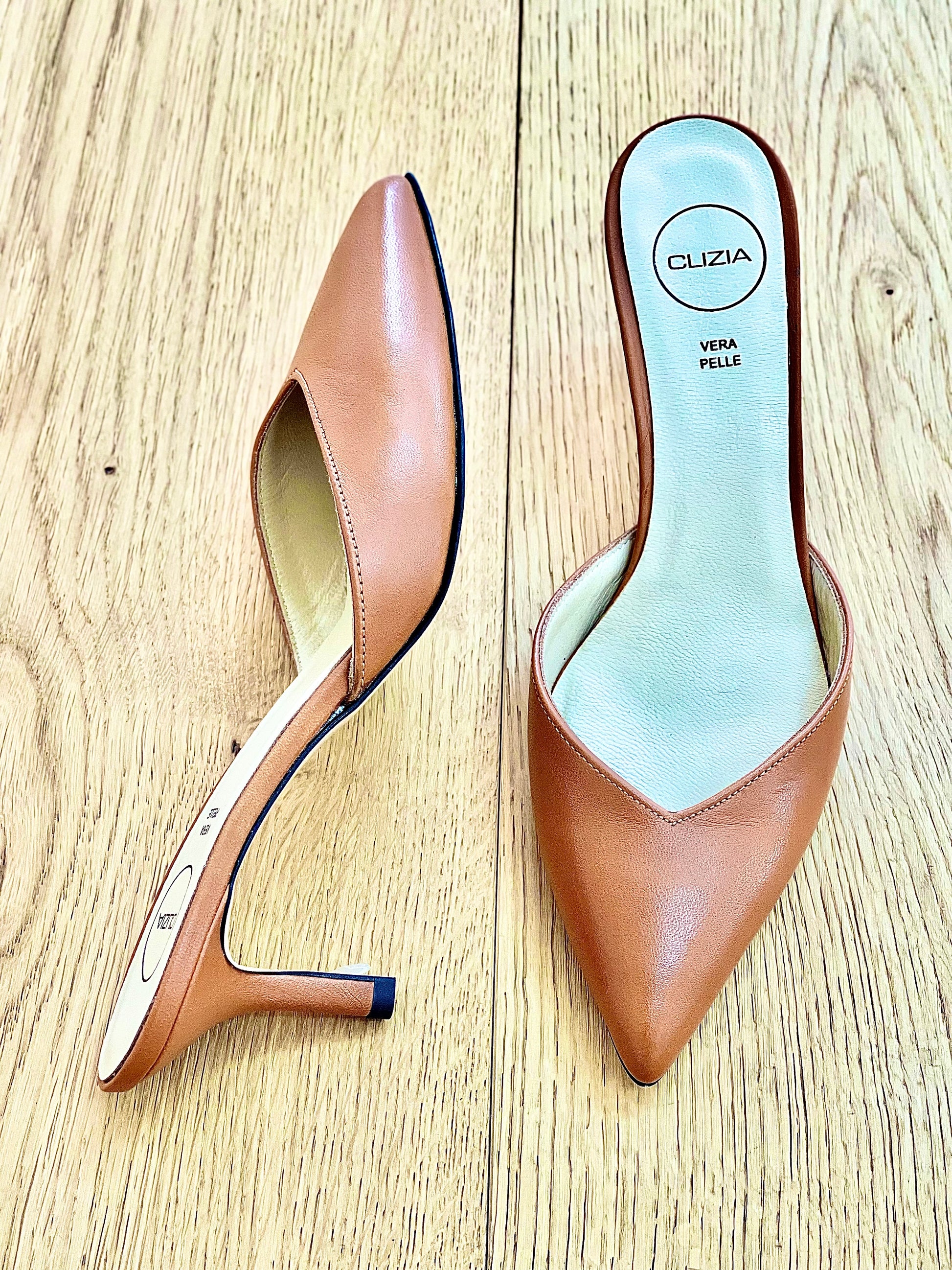 Sabot em pele com decote em V pontiagudo e salto de 6 cm.