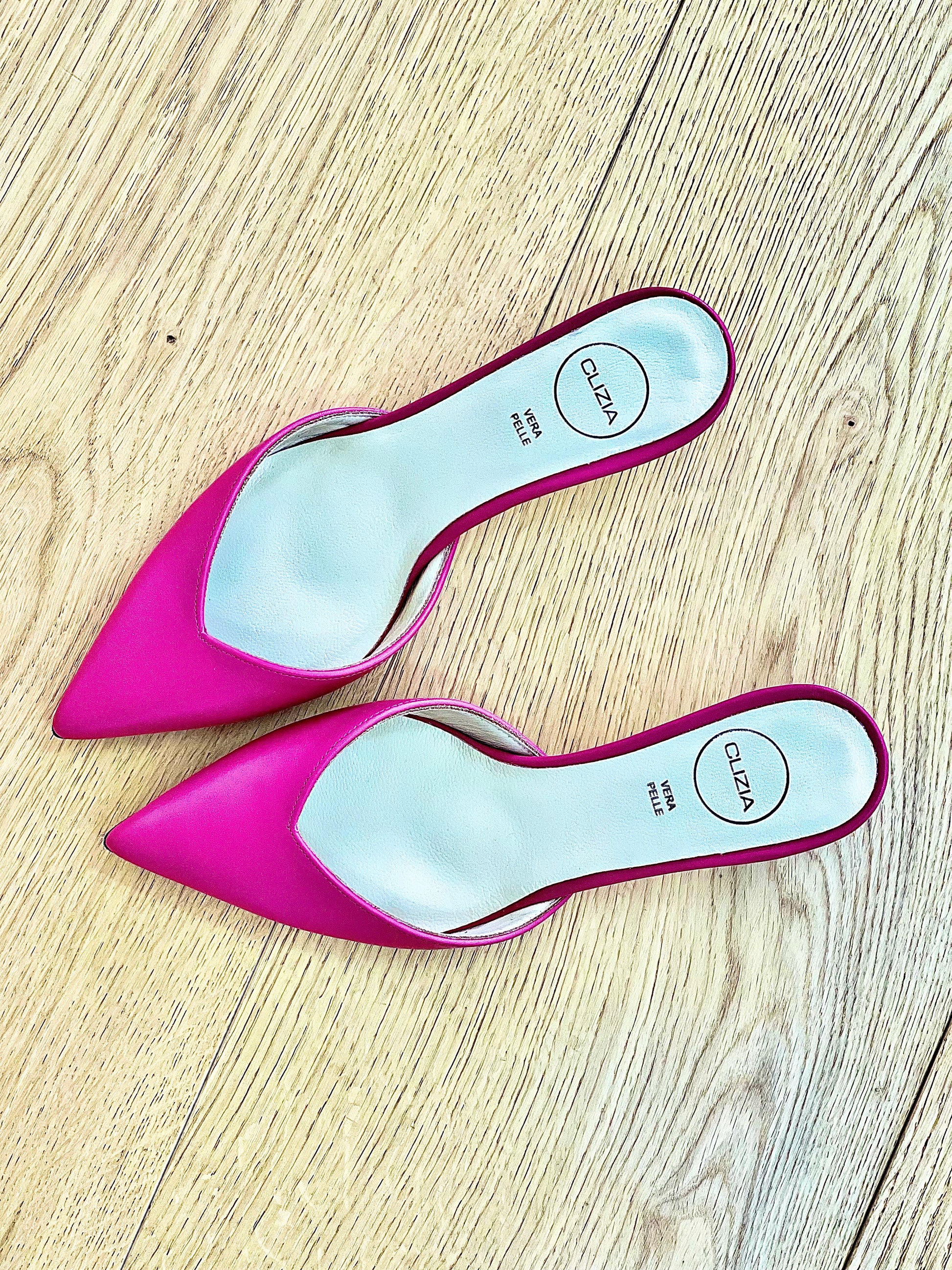 Sabot em pele com decote em V pontiagudo e salto de 6 cm.