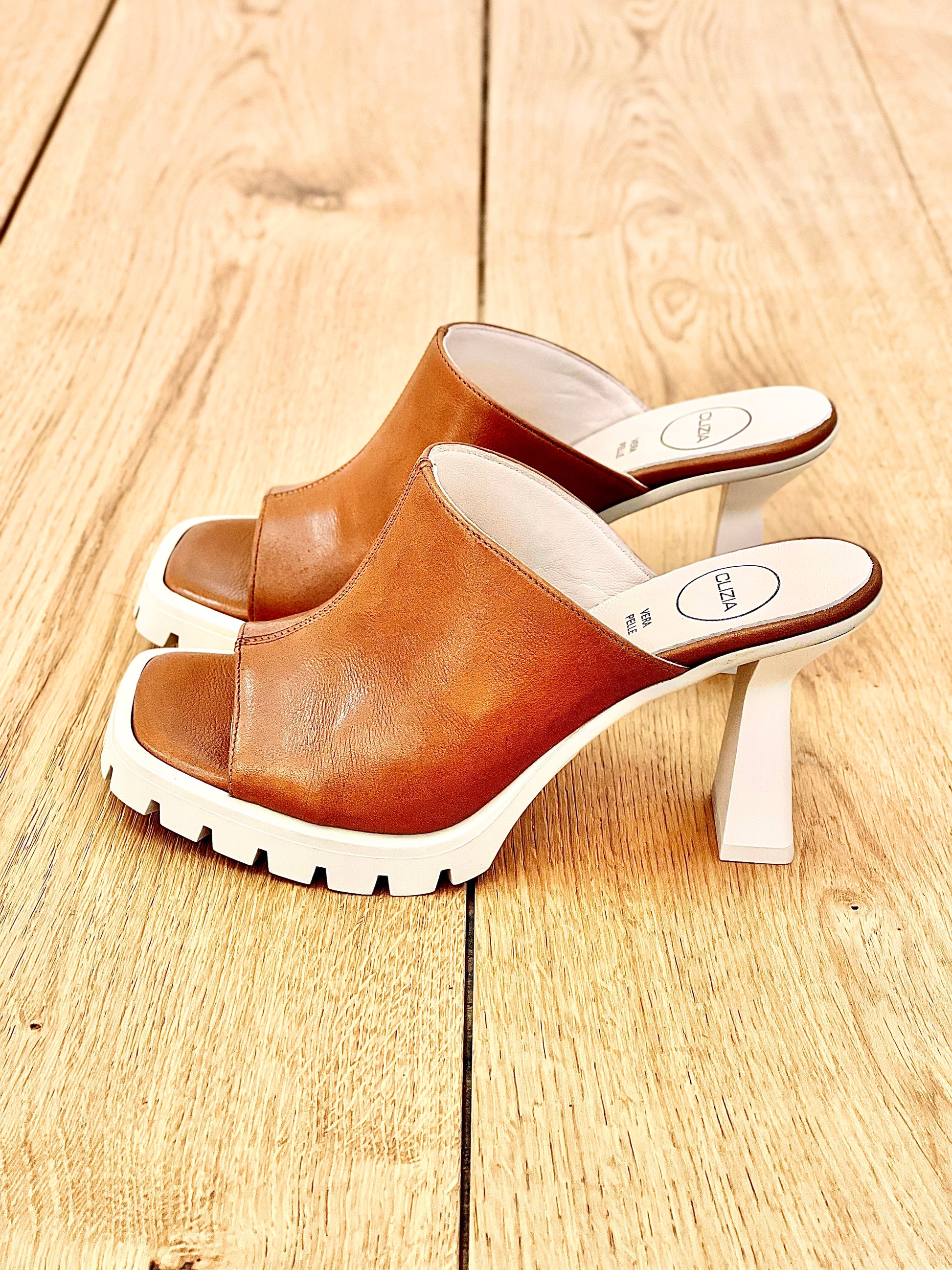 Sandálias altas sabot em pele sobre uma plataforma de borracha.
