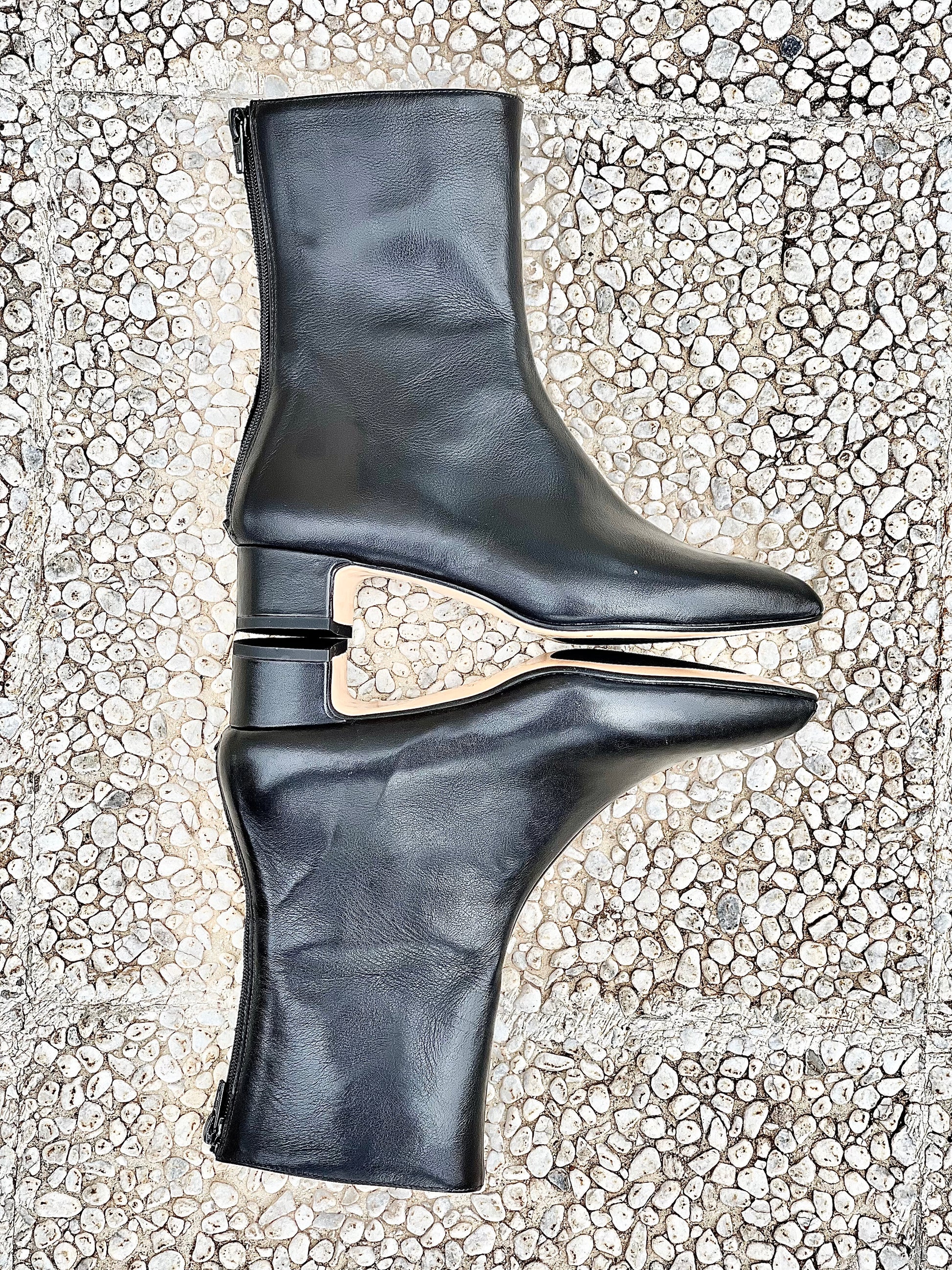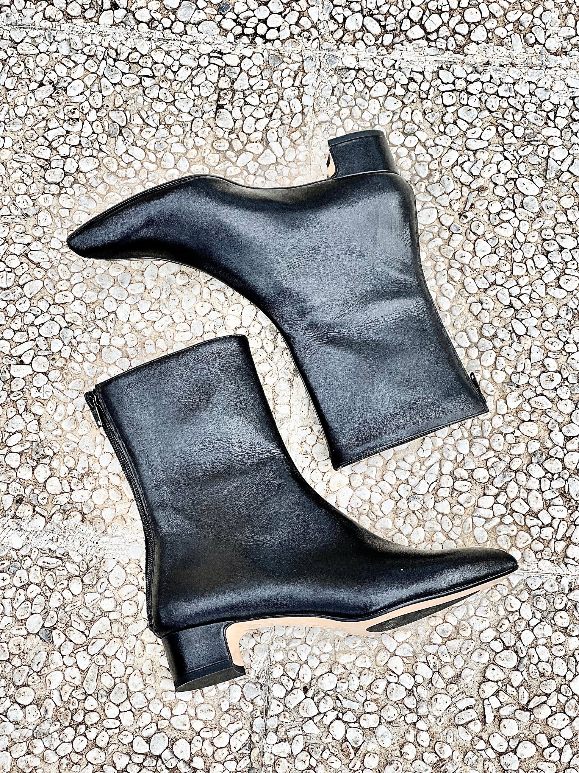 Botins em pele de biqueira pontiaguda com salto largo e fecho de correr atrás.
