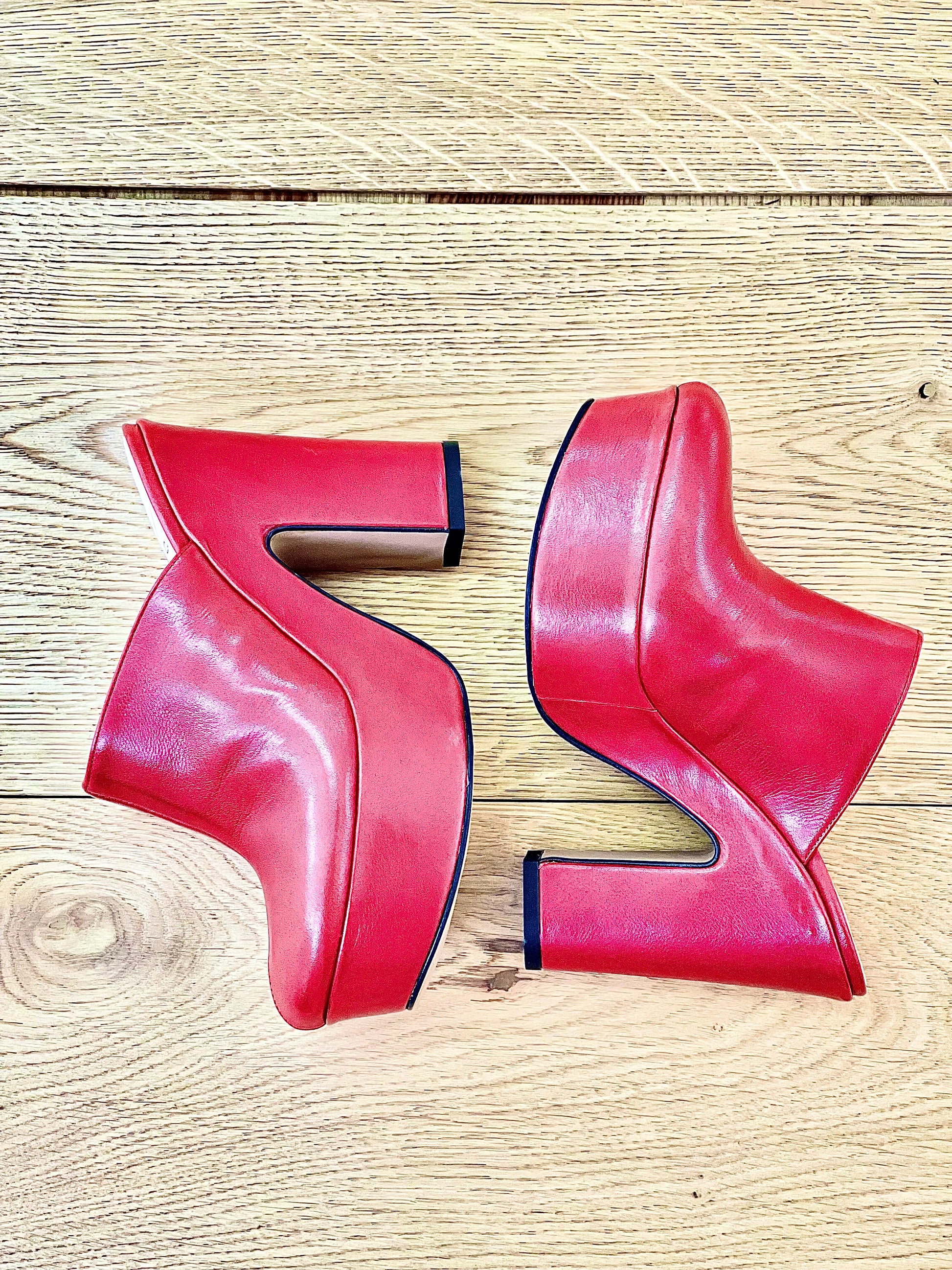 Sapato de couro de biqueira redonda com salto de cunha de 11,5 cm de altura e plataforma de 4 cm.
